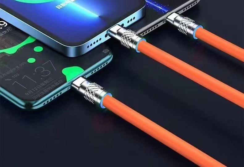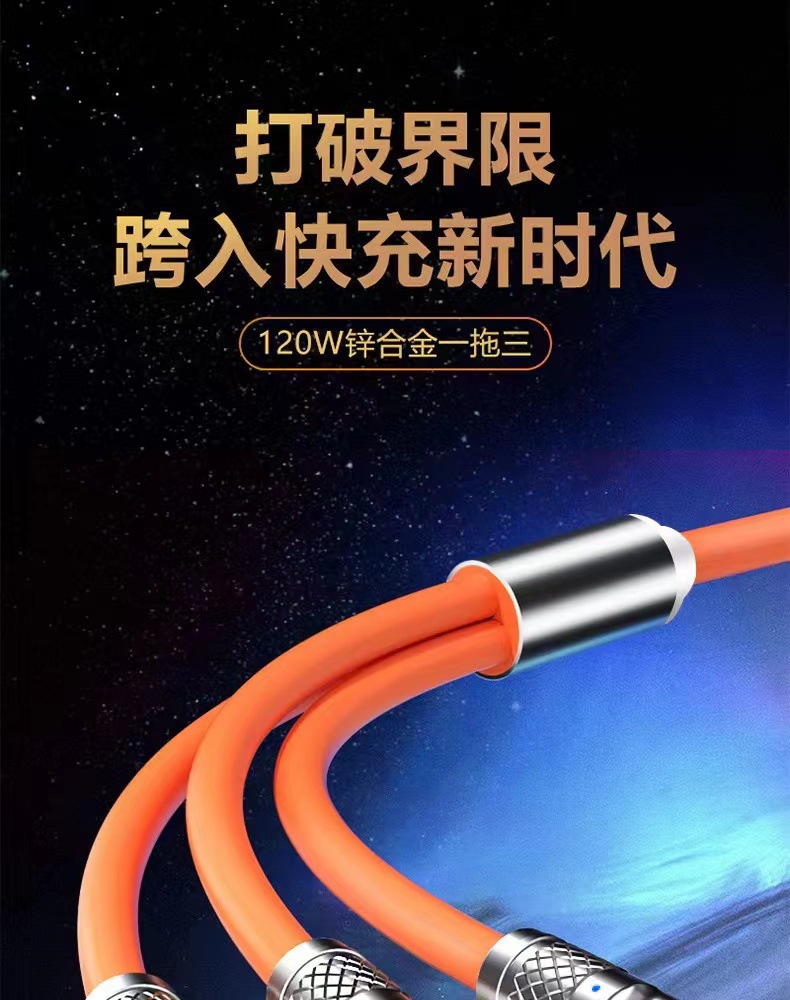 120W super fast charging one-to-three mobile phone data cable three-in-one silicone zinc alloy three-head charging cable