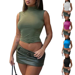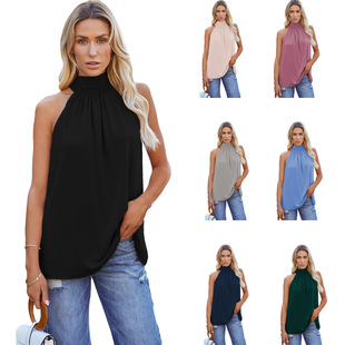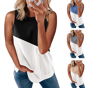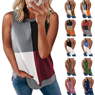 2023 Cross border Spring and Summer New Amazon European and American Solid Color Printed Round Neck Vest with I shaped Women s Top