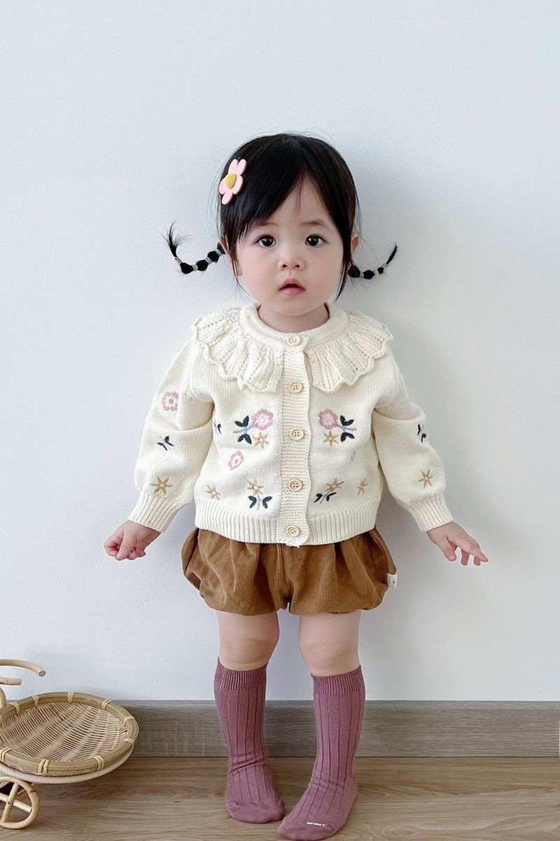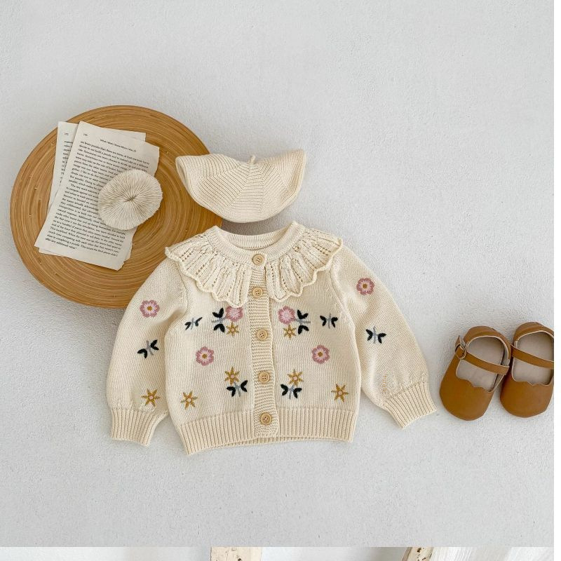 2023 spring all match baby girls flower embroidered lotus collar knitted long sleeved cardigan coat children s clothing