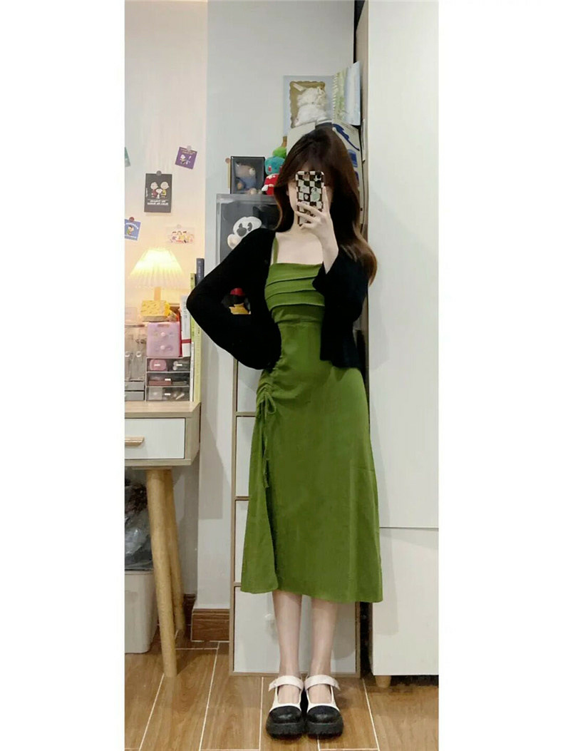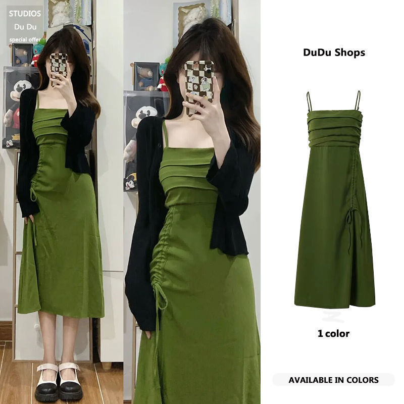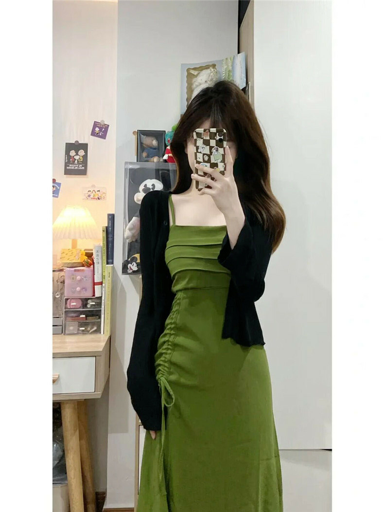 2024 Early Spring New Design Hot Girl Green dress Sling Women s Platycodon Grandiflorum French Hot Girl Sunscreen Two piece Set
