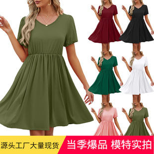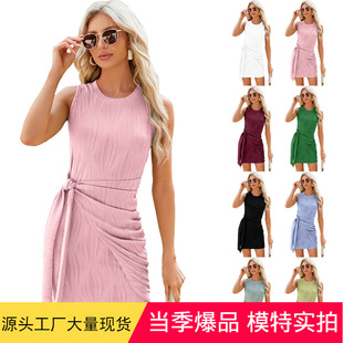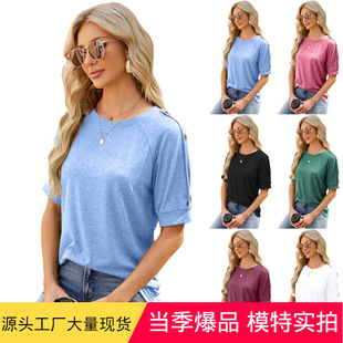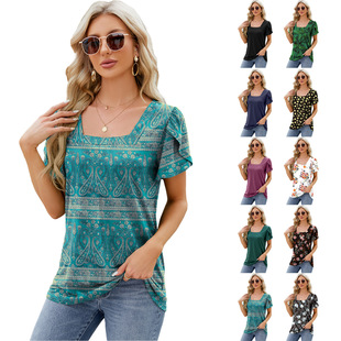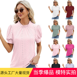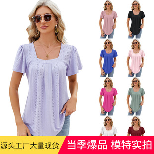 2024 European and American Foreign trade cross-border women's clothing Amazon pleated hollow square collar jacquard short sleeve dovetail T-shirt cross-border Women