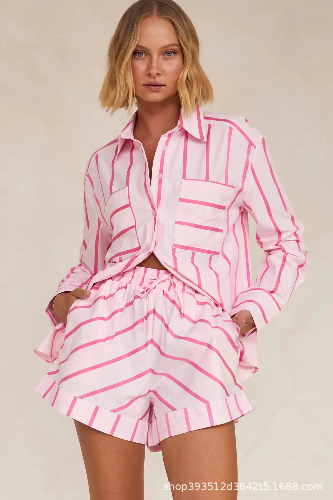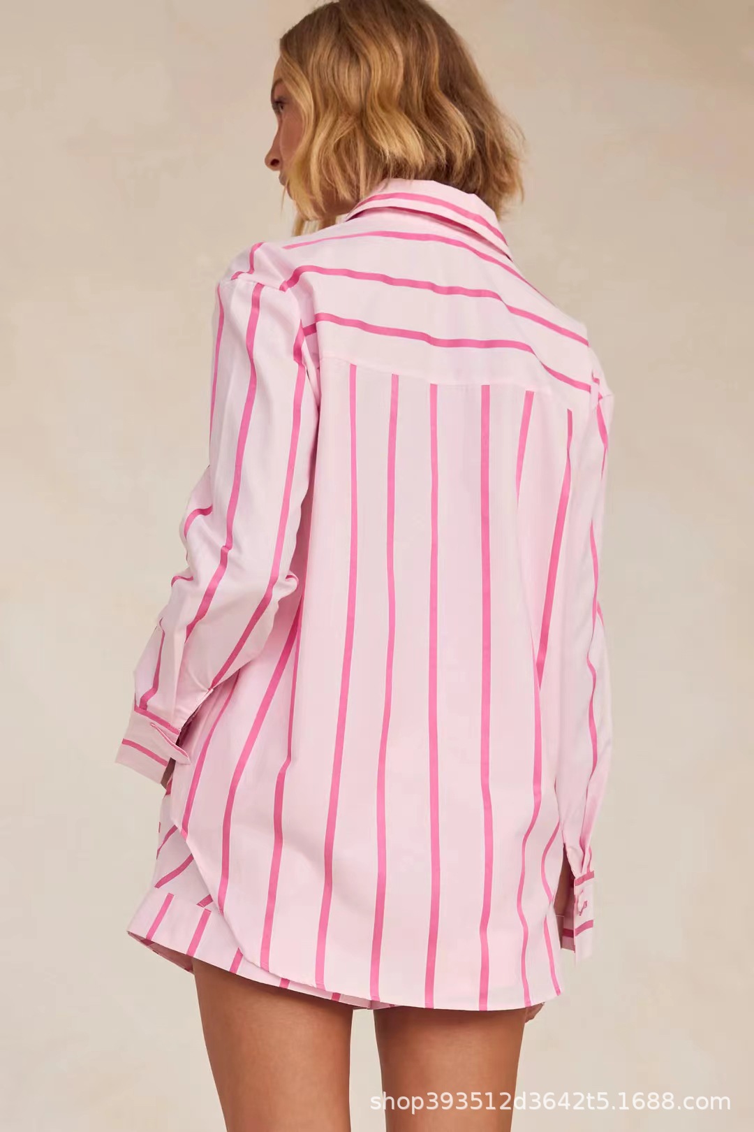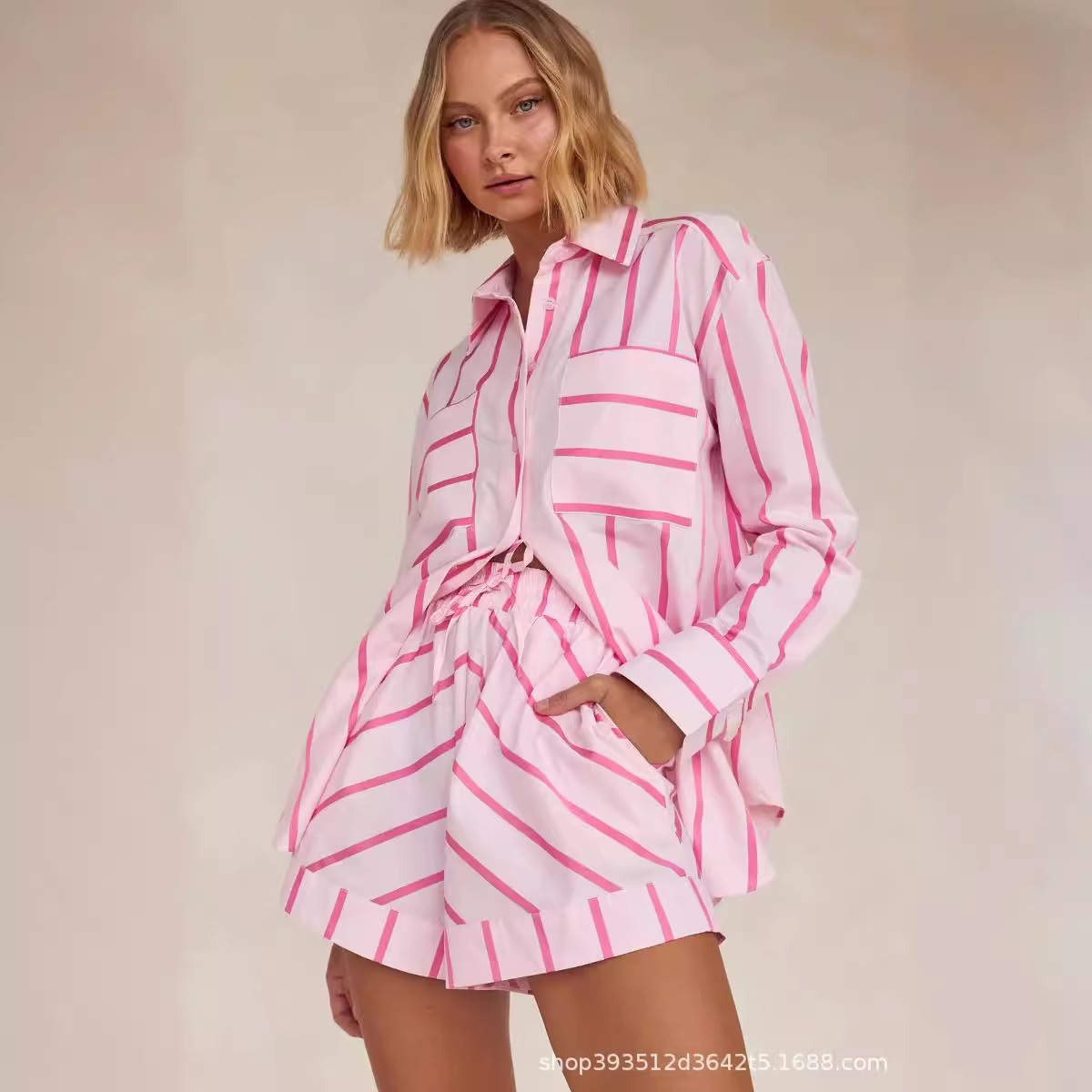 2024 New European and American style Cross border Lapel Long Loose Slim Sleeve Shirt Amazon Casual Shorts Striped Suit