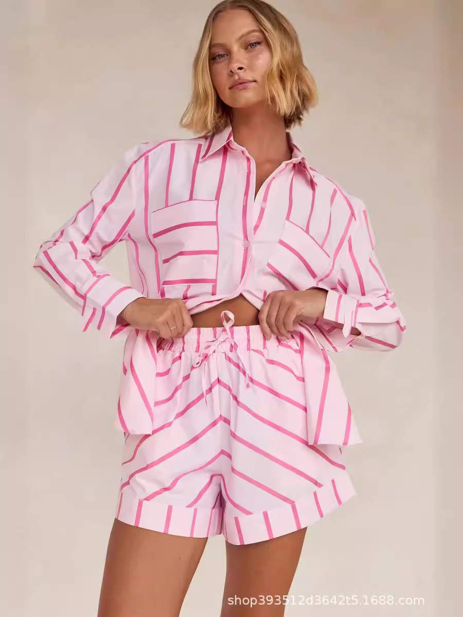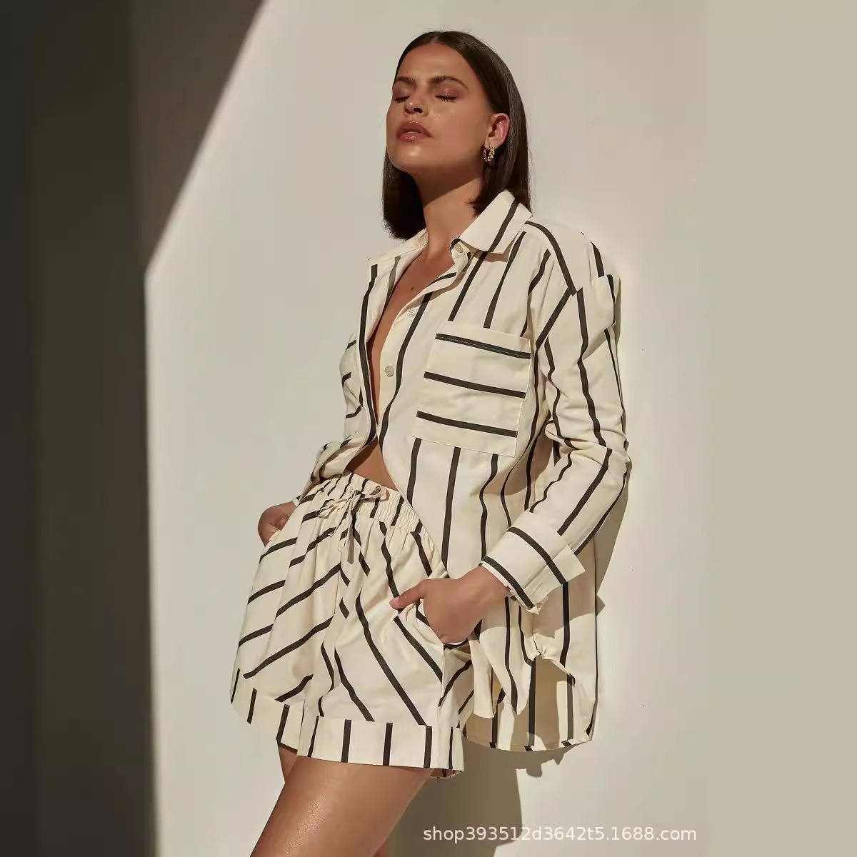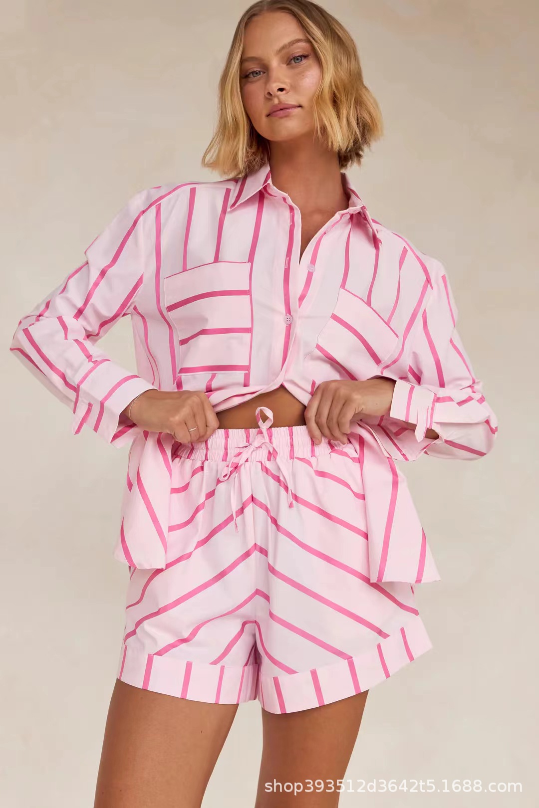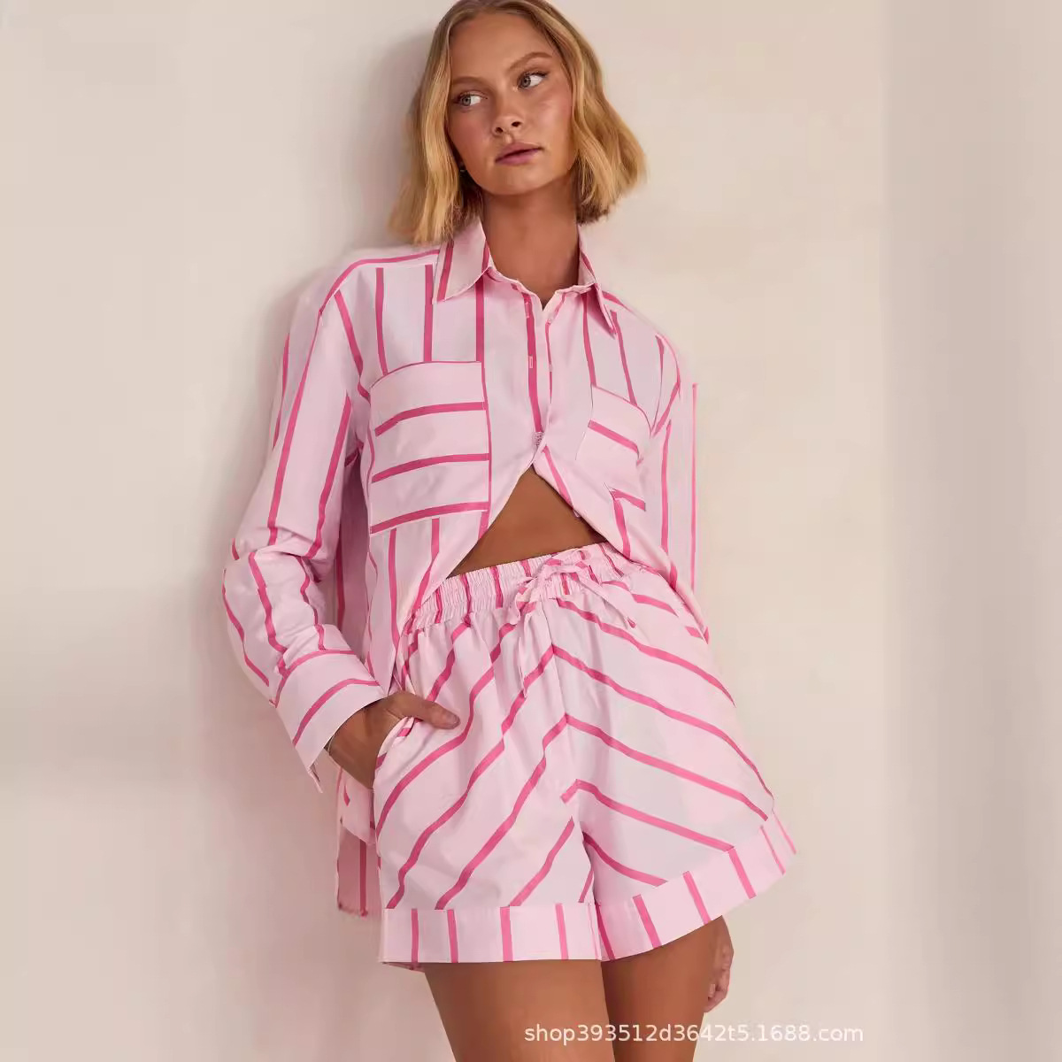 2024 New European and American style Cross border Lapel Long Loose Slim Sleeve Shirt Amazon Casual Shorts Striped Suit