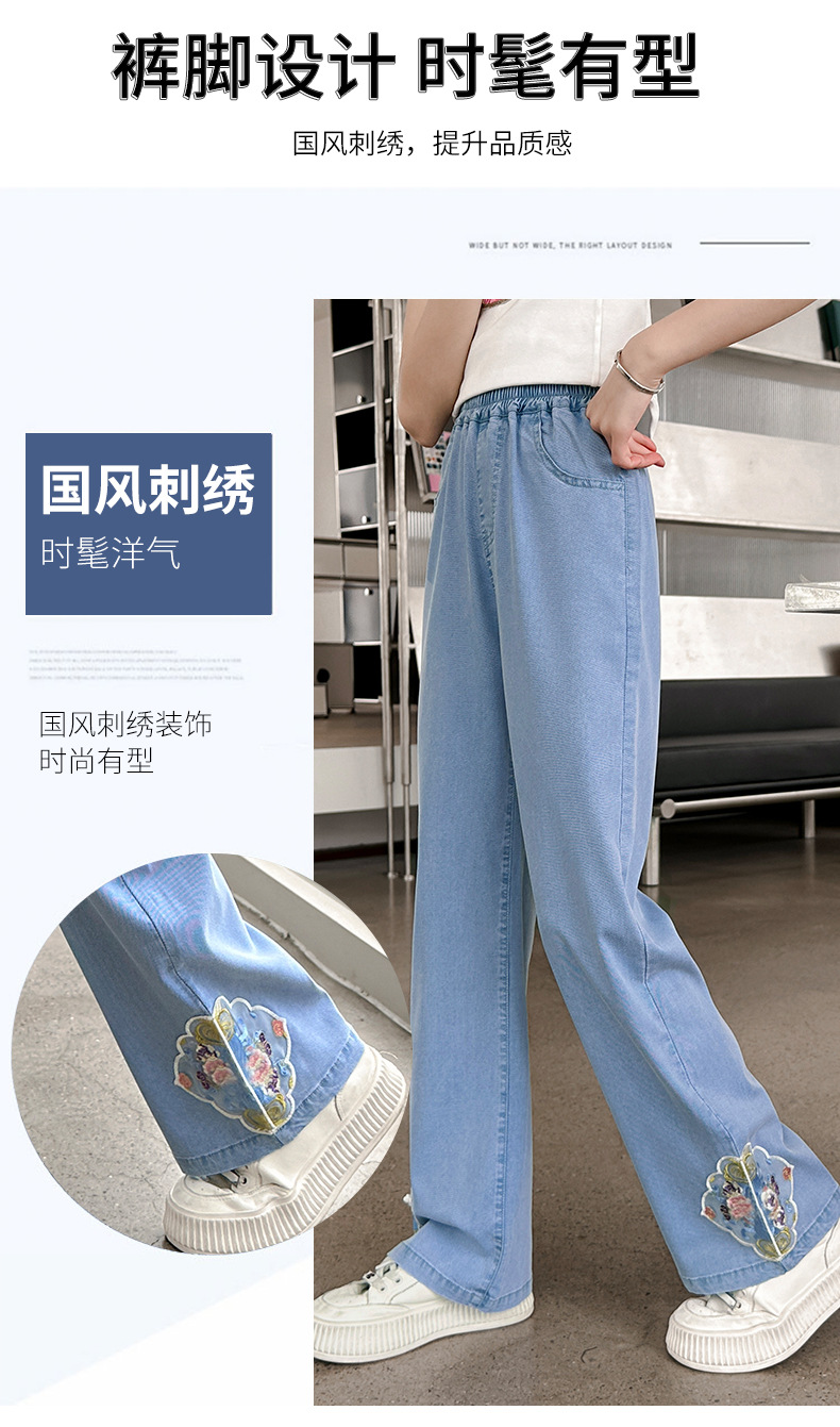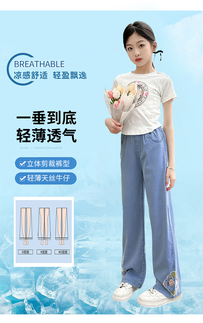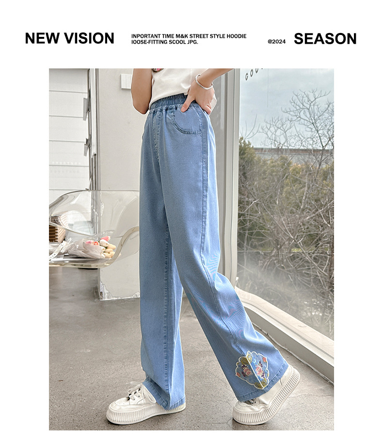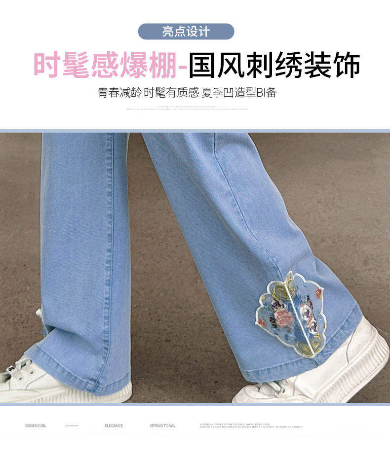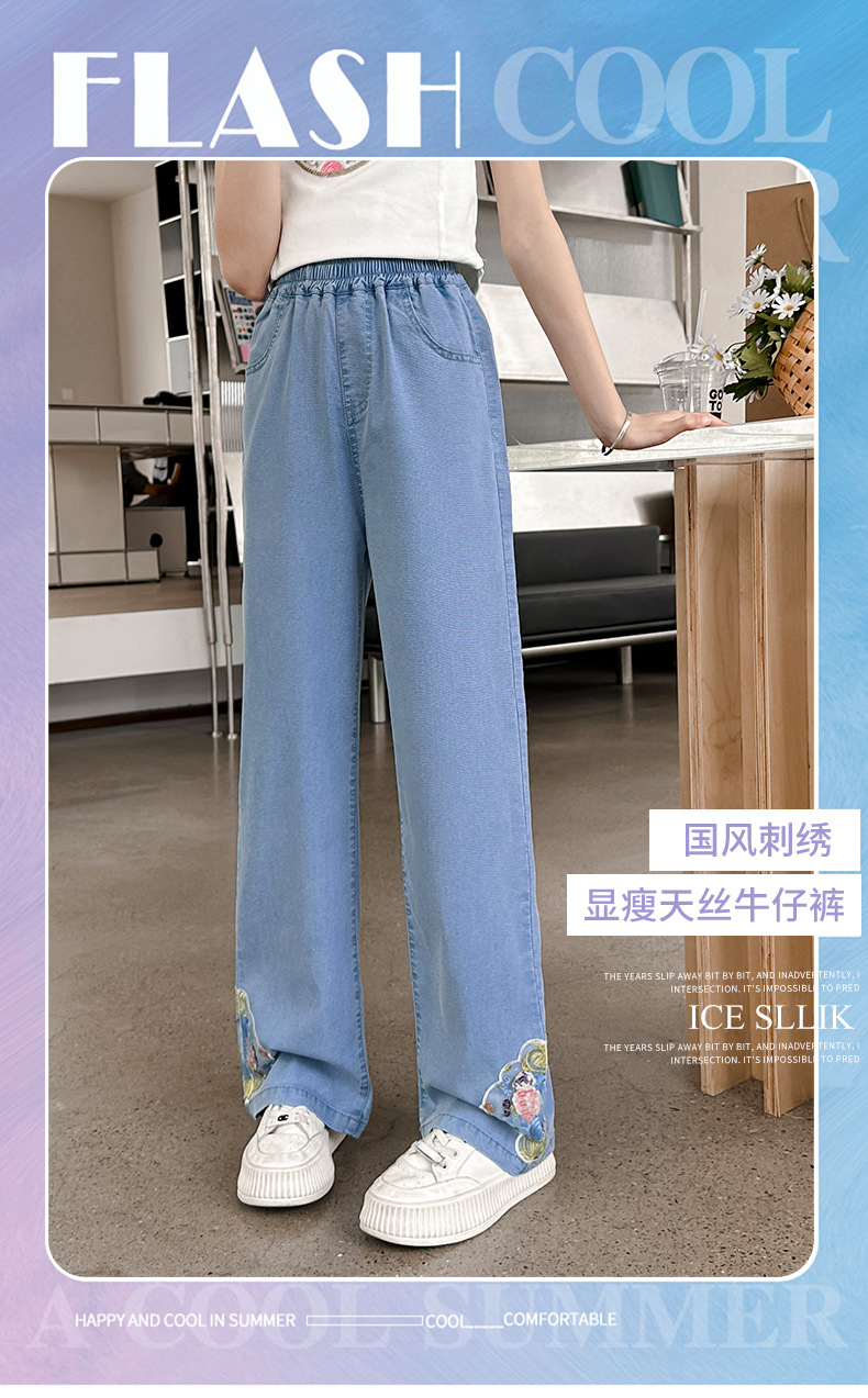 2024 Summer Guofeng Girls Tencel Denim Wide Leg Pants Large and Medium size Children s Lightweight Dipped Jeans Cross border Straight Pants