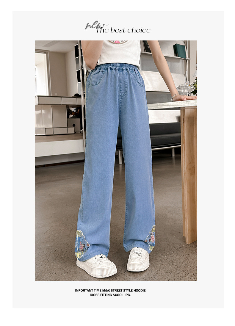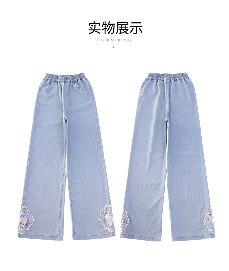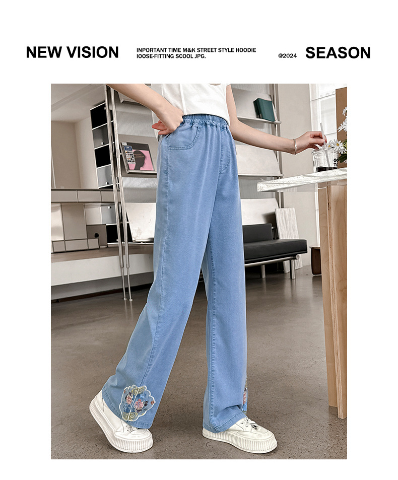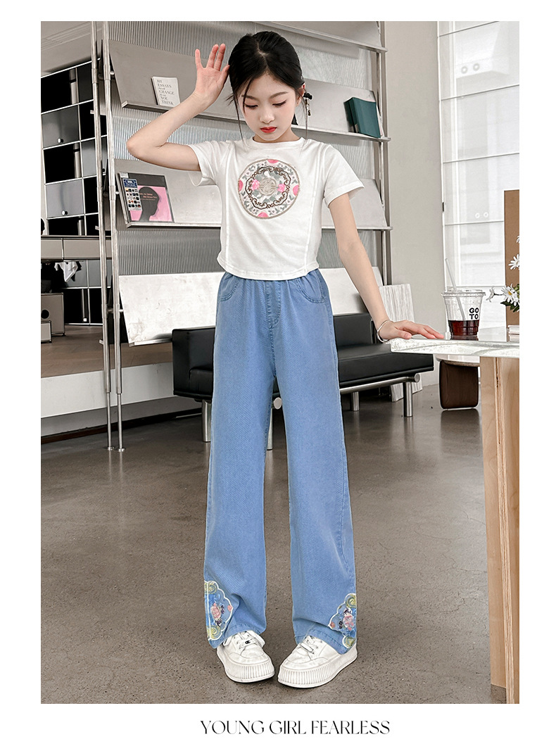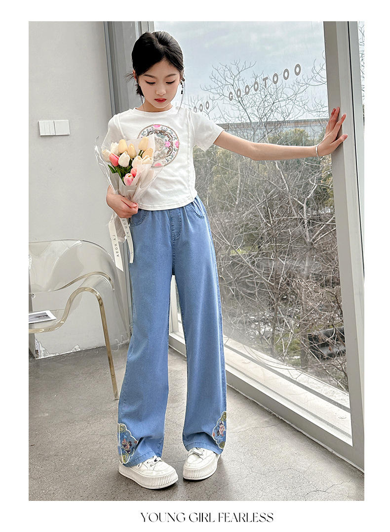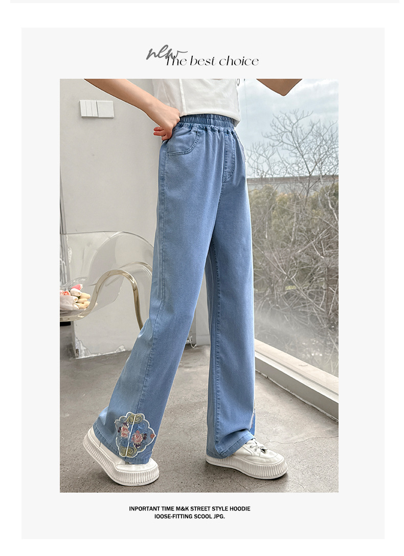 2024 Summer Guofeng Girls Tencel Denim Wide Leg Pants Large and Medium size Children s Lightweight Dipped Jeans Cross border Straight Pants