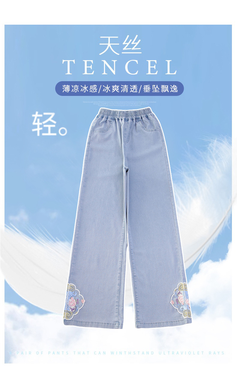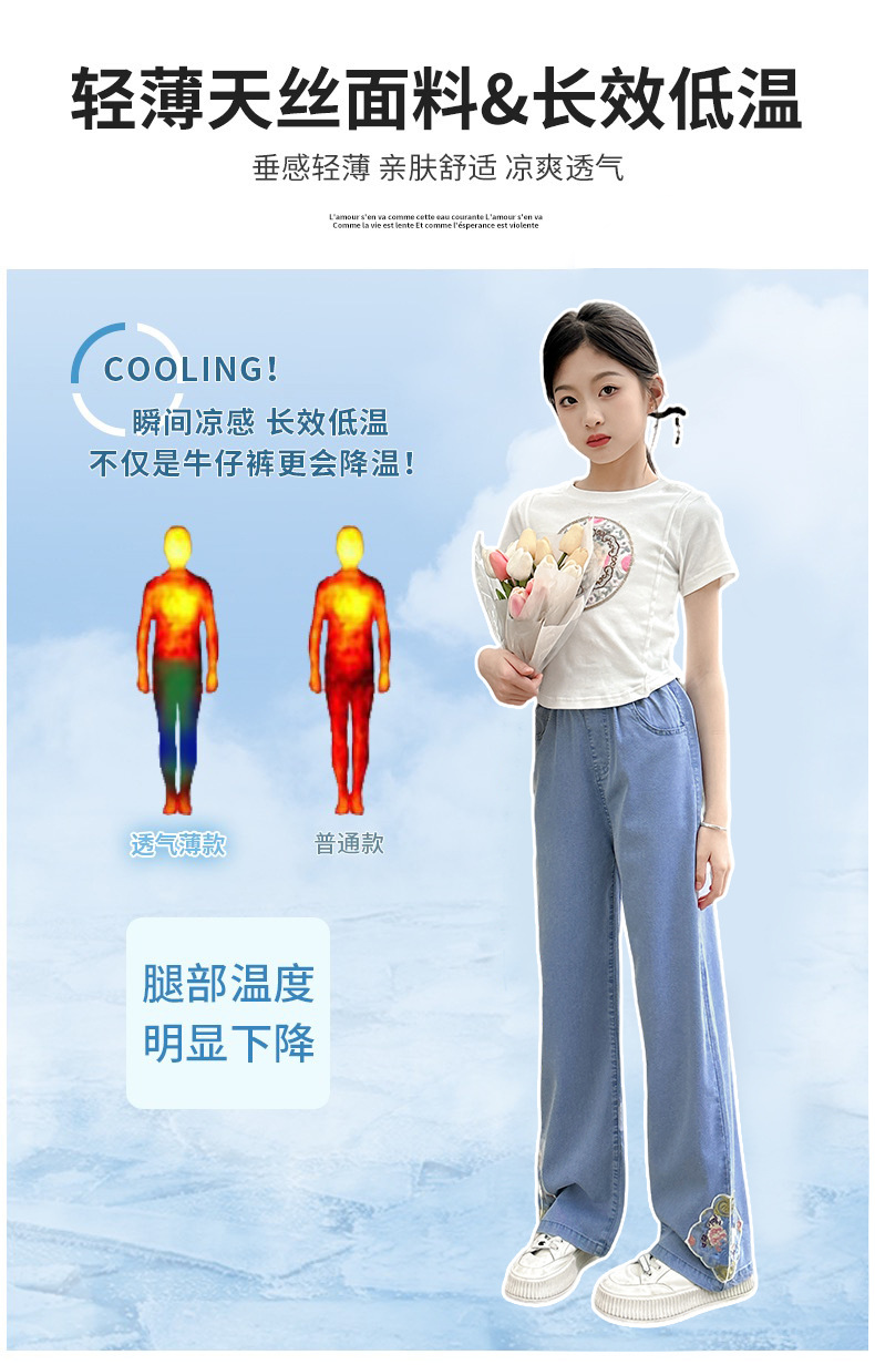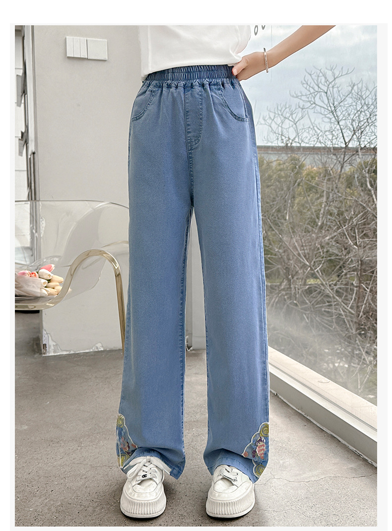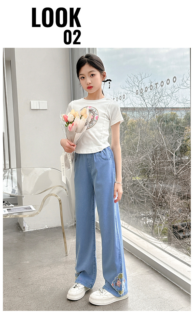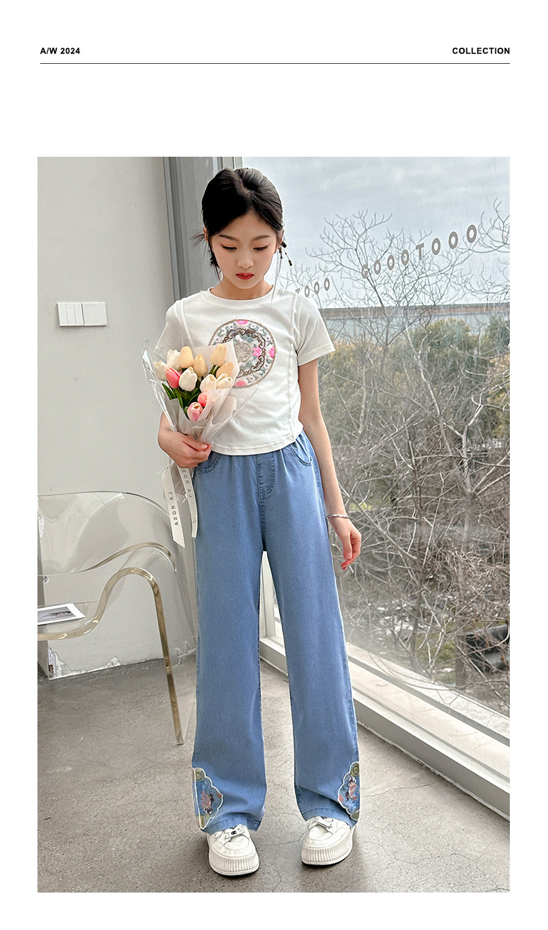 2024 Summer Guofeng Girls Tencel Denim Wide Leg Pants Large and Medium size Children s Lightweight Dipped Jeans Cross border Straight Pants