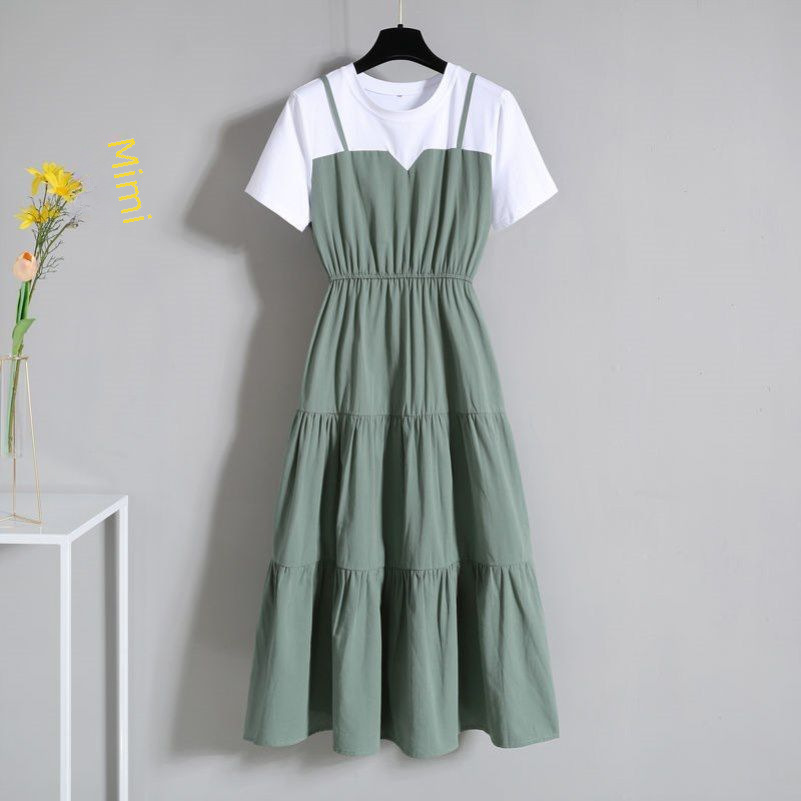 2024 Summer plus size Women s Clothing Fashion Sling Fake Two piece Long Dress Chubby Sister Tight Waist Slimming Short sleeved dress Women