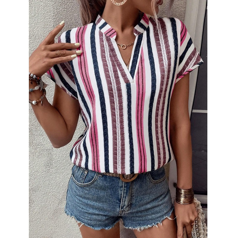 2024 cross border European and American women s clothing Amazon independent station spring and summer new striped printed V neck bat sleeve shirt T shirt