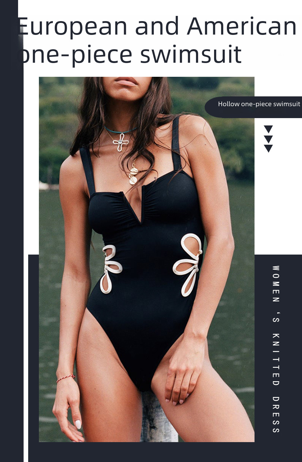 2024 new European and American fashion solid color sexy V neck side hollow design one piece women s swimsuit