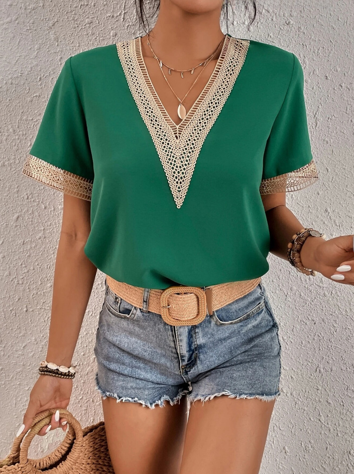 2024wish cross border ebay Amazon women s v neck lace loose top temperament commuter short sleeve shirt women