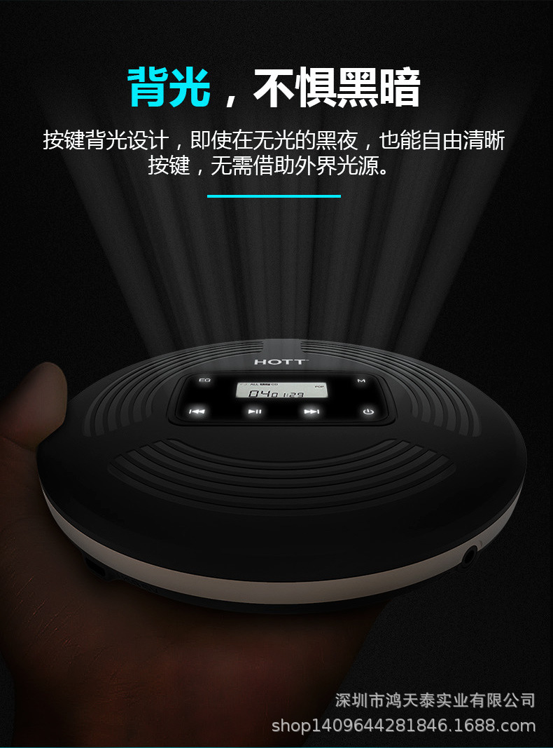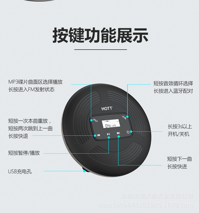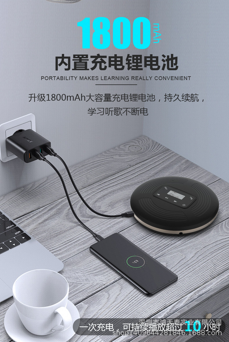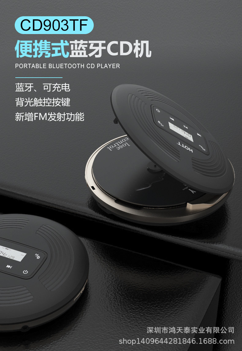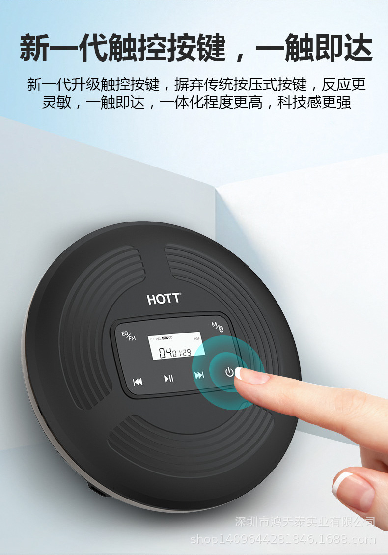 本产品是一个集高端蓝牙发射、FM发射、音频线输出等多种播放模式为一身的CD播放器,触摸反馈,超大锂电池,使用时长突破10小时,行业首创FM发射,完美解决车载播放,支持CD、CD-R、CD-RW、MP3-CD、WMA-CD。