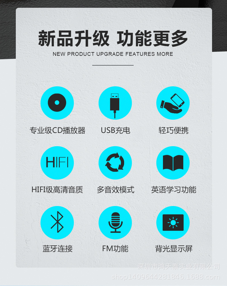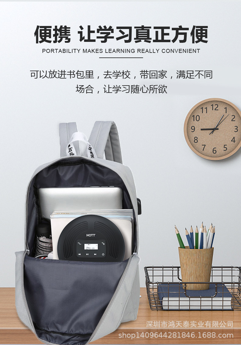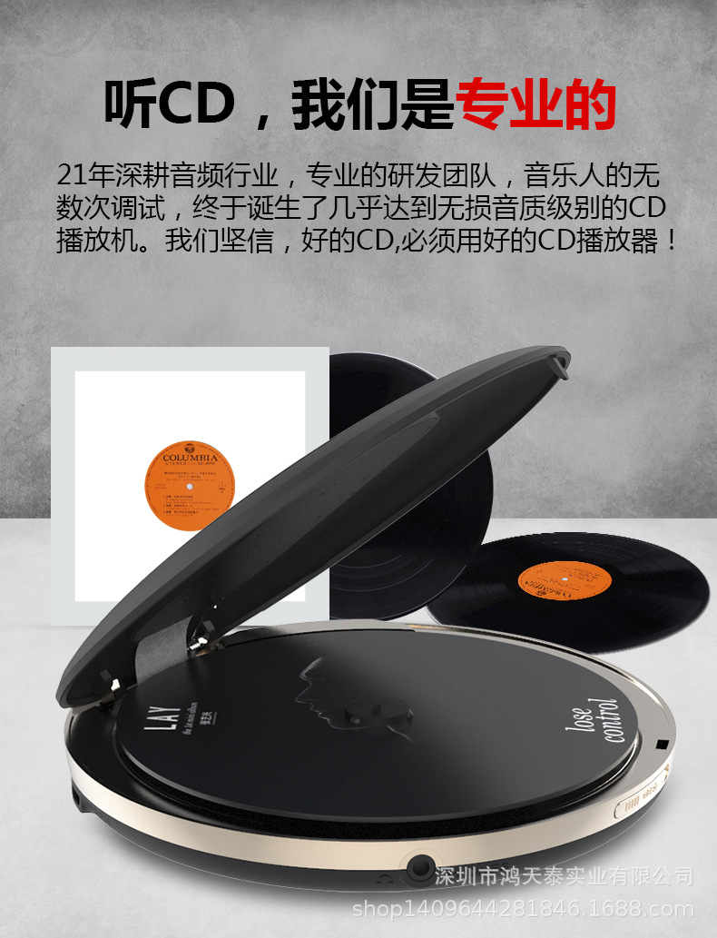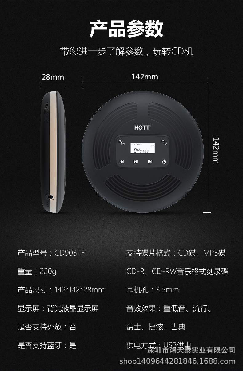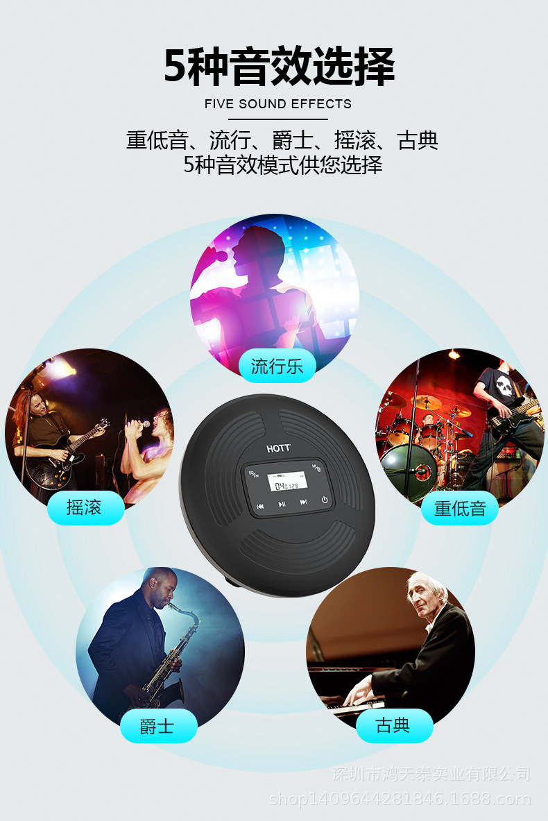 本产品是一个集高端蓝牙发射、FM发射、音频线输出等多种播放模式为一身的CD播放器,触摸反馈,超大锂电池,使用时长突破10小时,行业首创FM发射,完美解决车载播放,支持CD、CD-R、CD-RW、MP3-CD、WMA-CD。