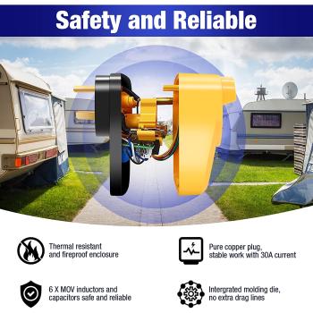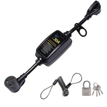 The sleek, compact, portable design makes this unit easy to use and store. An all-weather shield provides additional protection while the unit is plugged in. Plug-and-play application, no installation required. Designed for recreational vehicle use only. We additionally equip you with an anti-theft cable lock to ensure that the Surge Protector is not lost.