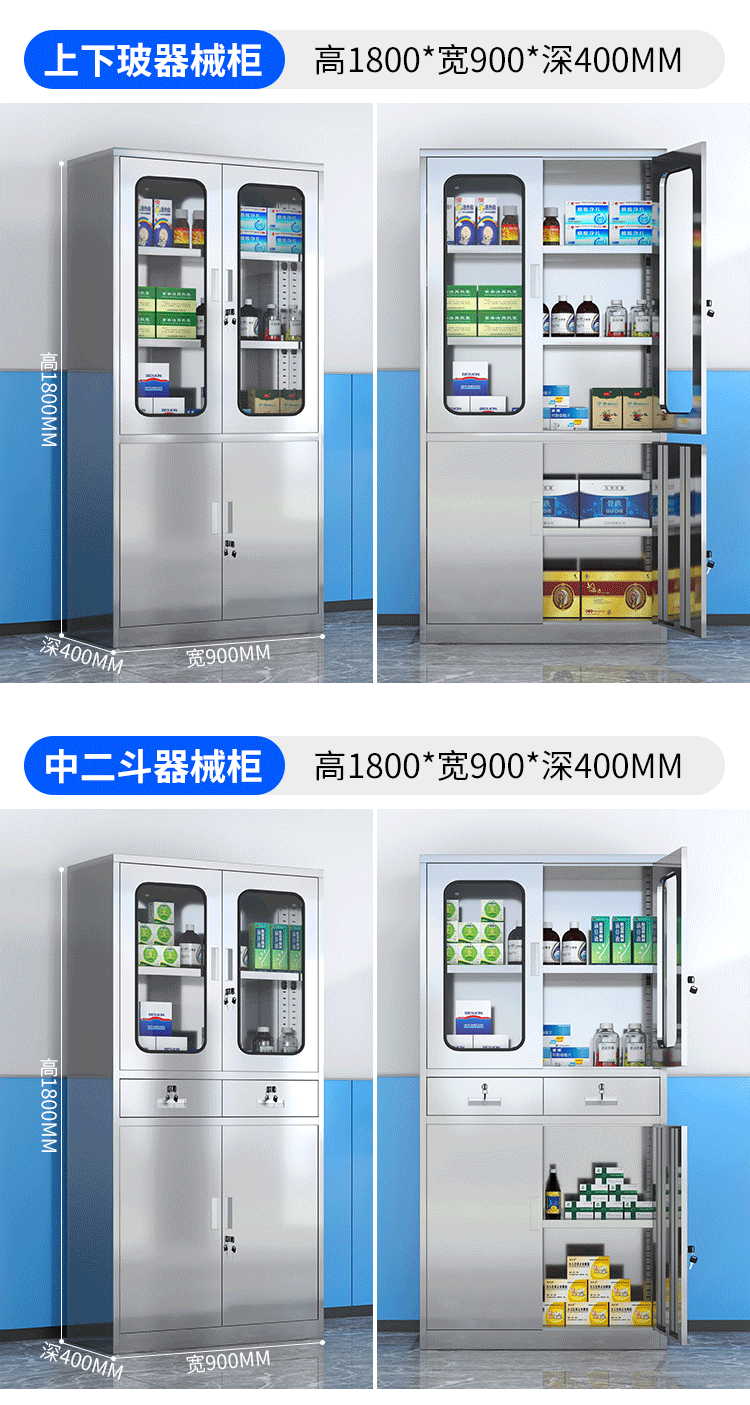 - Stainless steel double-section instrument cabinet