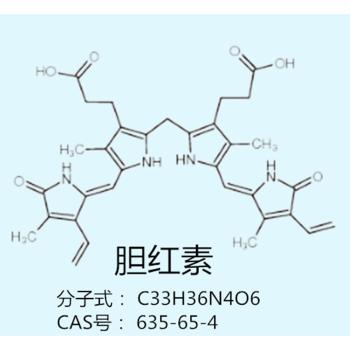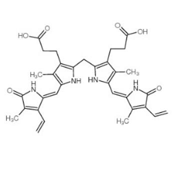 **Product Applications:** A major component resulting from the breakdown of heme; the primary pigment found in bile. It functions as an antioxidant and an effective scavenger of hydrogen peroxide radicals, thereby protecting cellular membrane lipids from oxidation by these reactive species. Bilirubin possesses a wide range of pharmacological properties and serves as the primary raw material for the production of artificial *Calculus Bovis* (artificial ox gallstone). Pharmacological studies have demonstrated that it exhibits significant inhibitory effects against W256 tumors; furthermore, its inactivation rate and inhibitory index against the Japanese encephalitis virus are 1 to 1.5 times higher than those of deoxycholic acid and cholic acid. It also functions as an effective therapeutic agent for liver diseases, promoting the proliferation of new cells without causing damage to hepatic tissue, and is utilized in the treatment of conditions such as serum hepatitis and liver cirrhosis. Additionally, bilirubin exerts sedative, anticonvulsant, antipyretic, and hypotensive effects, and promotes the regeneration of erythrocytes.