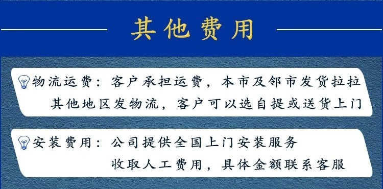 6、支持线上下单和线下下单,线上交易全额一次性支付,线下交易预付工程造价的30%,到货开始安装时支付工程造价的35%,验收合格后支付工程造价的35%(付款方式可以协商);