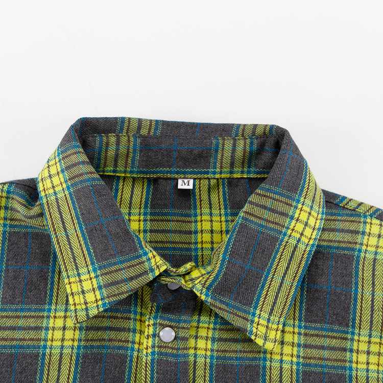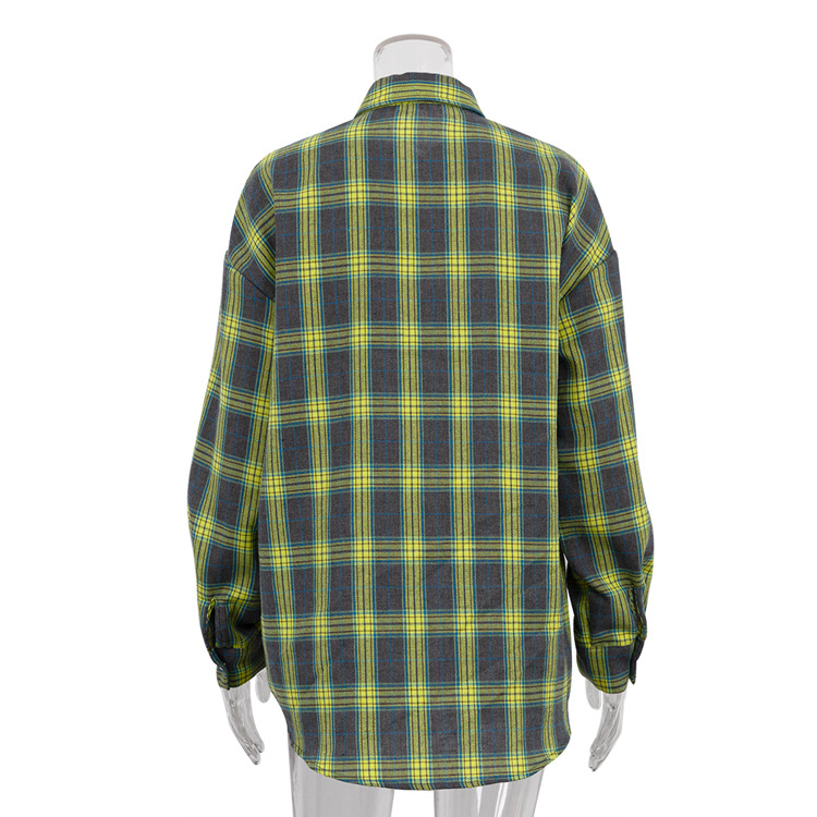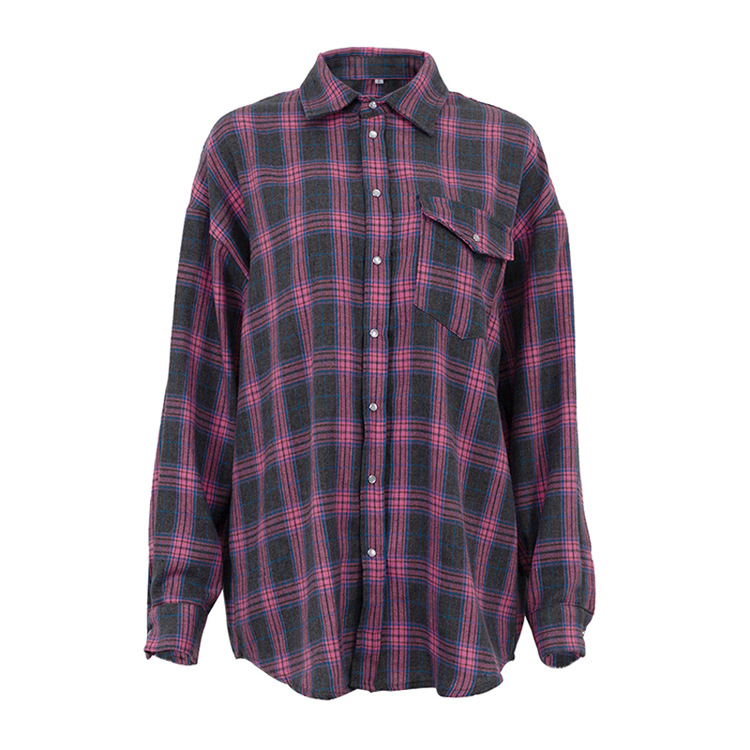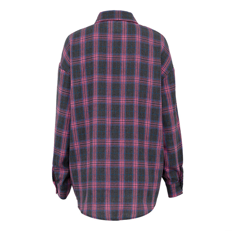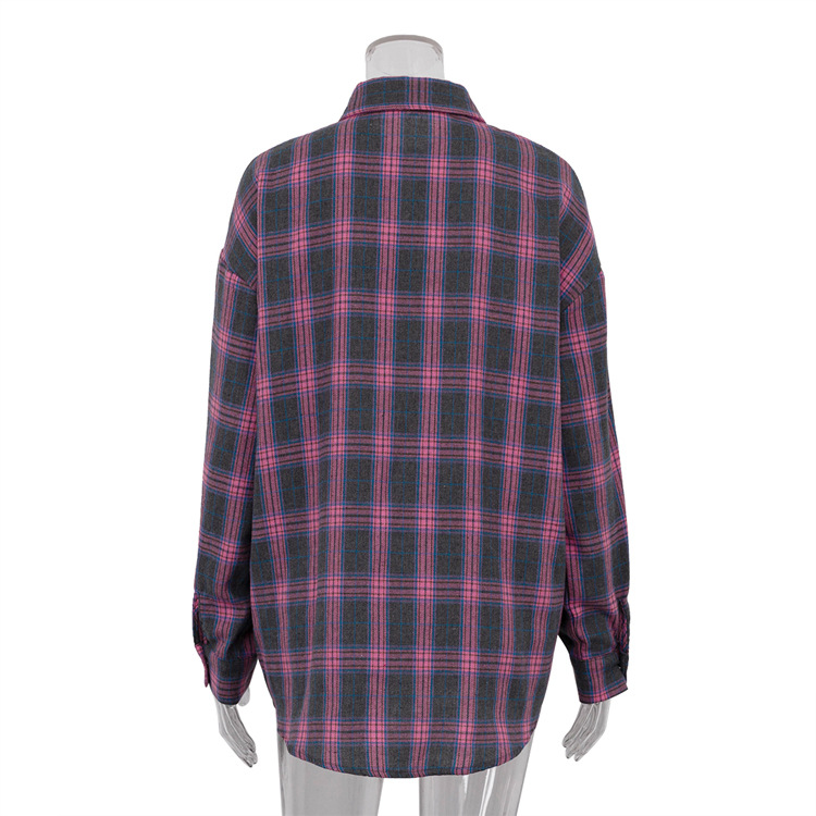 Amazon cross border retro style all match lapel loose shirt 2024 spring and autumn Plaid long sleeve pocket women s shirt
