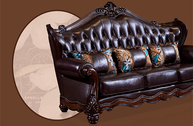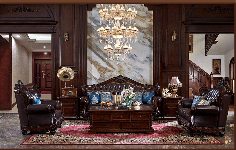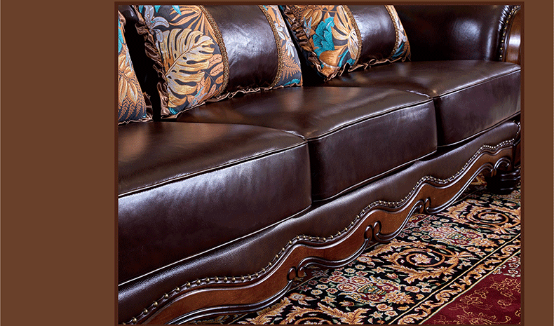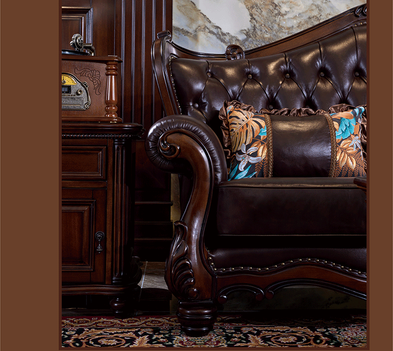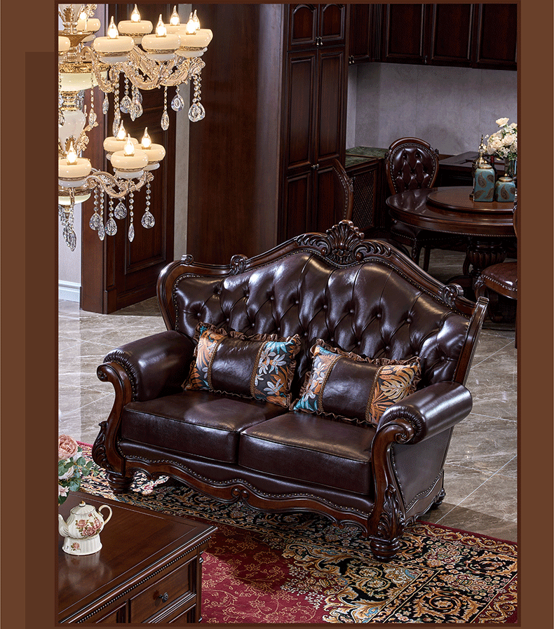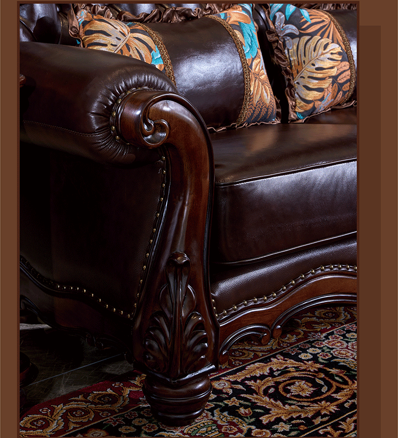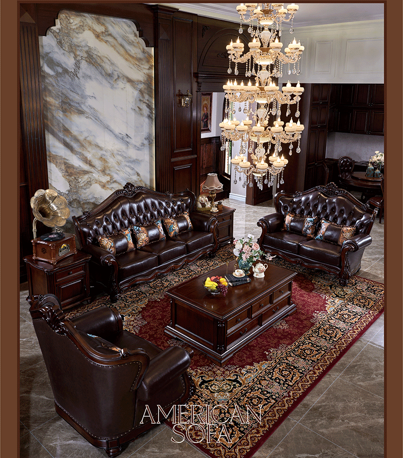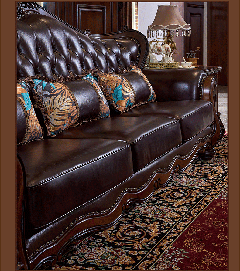 American Style Solid Wood Leather Sofa Carved Retro Luxury High end Villa Living Room Furniture European Style Sofa 123 Combination