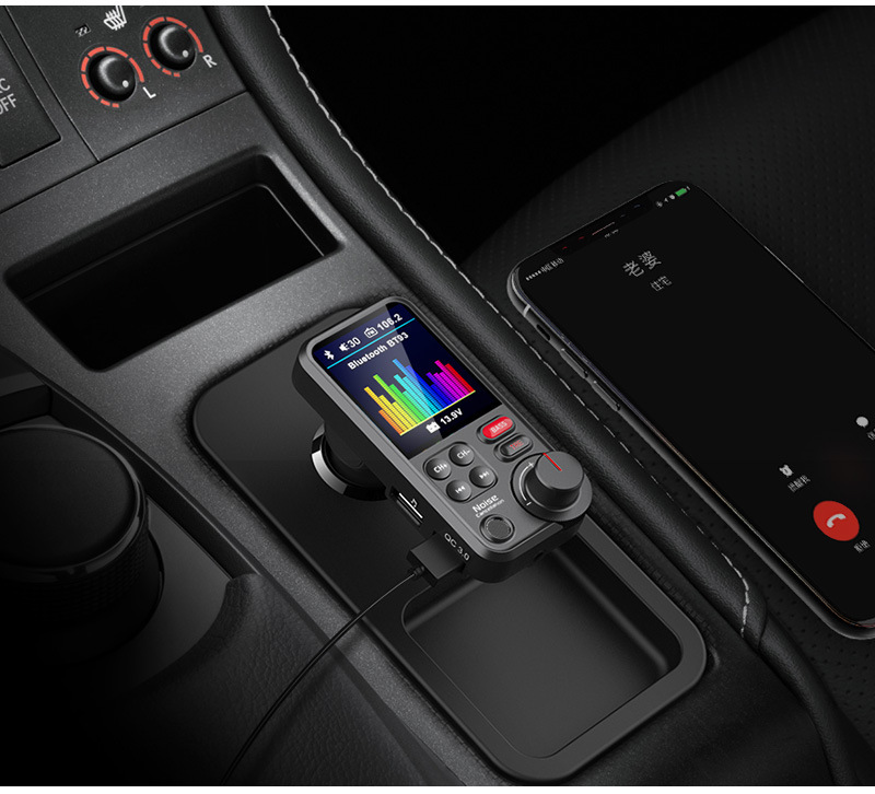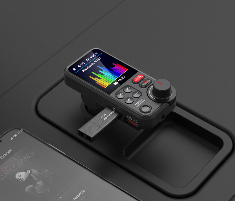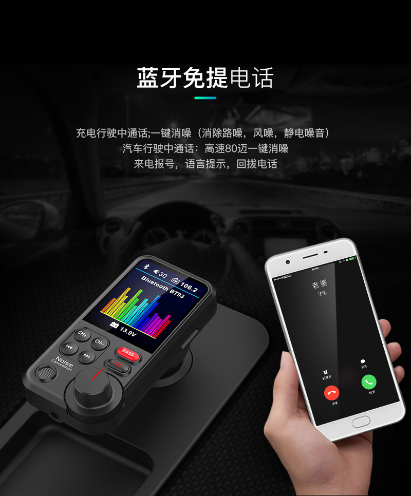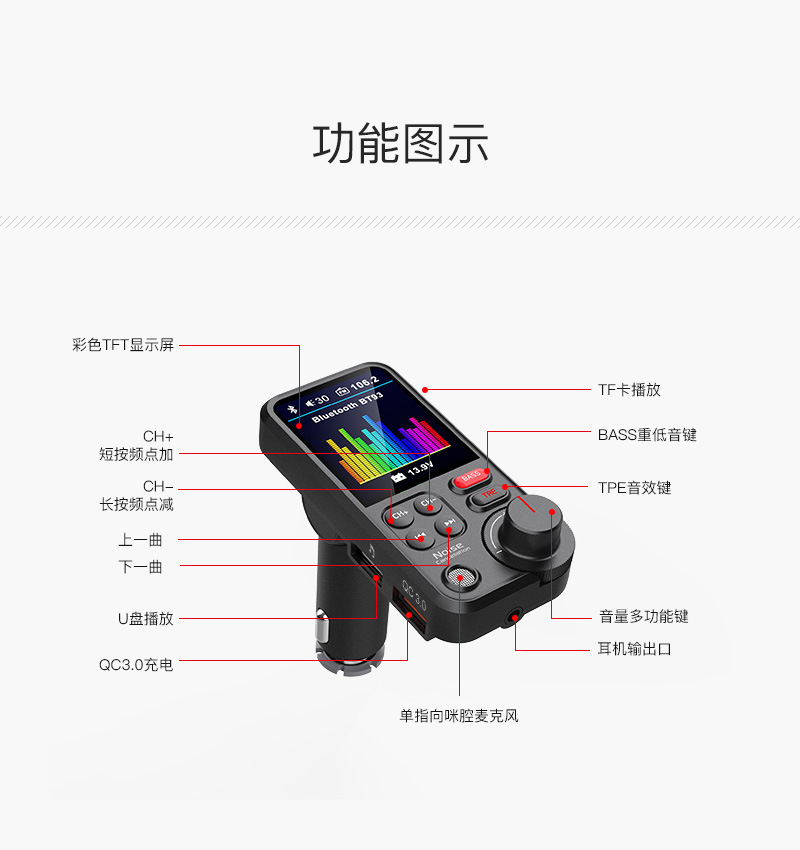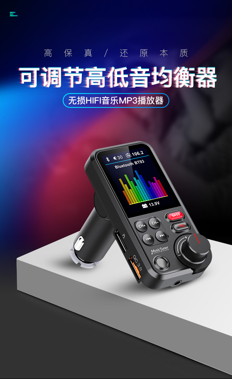BT90车载MP3.主打稳定,长杆,重低音,siri,音质,底噪,快充卖点特点:QC3.0,支持64G U盘播放,长杆1.7寸大屏,带Siri和一键重低音功能,音质,底噪已达行业前列,推点:QC3.0+ATS蓝牙5.0方案/一键重低音、一键激活siri、长杆大屏、支持64G U盘播放。配置:主机*1说明书*1保险管*1 音频线*1产品尺寸:Φ61*61*190mm产品重量:88.4克蓝牙版本:ATS5.0蓝牙频段:2.4GHZFM频率:87.5~108MHZ输入电压:12-24V(宽电压)U盘音乐:MAX(64G)整机功率:35W低电关机电压:8V待机电流:40MA工作电流:50MA===================【产品】:BT90车载mp3蓝牙播放器汽车充电器【配置】:主机+封套+牛皮盒+吸塑++英文说明书(中性英文包装盒)【包装尺寸】:61*61*190mmmm【外箱尺寸】:555x447x490mm【重量】:88.4g [材质]:ABS+防火材料 【装箱数量】:100台亚马逊限价不低于 23.99美金 天猫京东限价不低于:89人民币