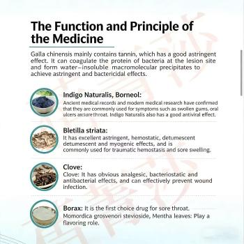 Selected from five gallnuts, indigo naturalis, cloves, borneol, and bletilla striata, among six Chinese herbs, each ingredient works synergistically to comprehensively address oral issues: