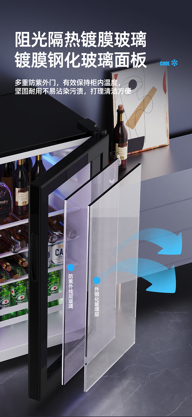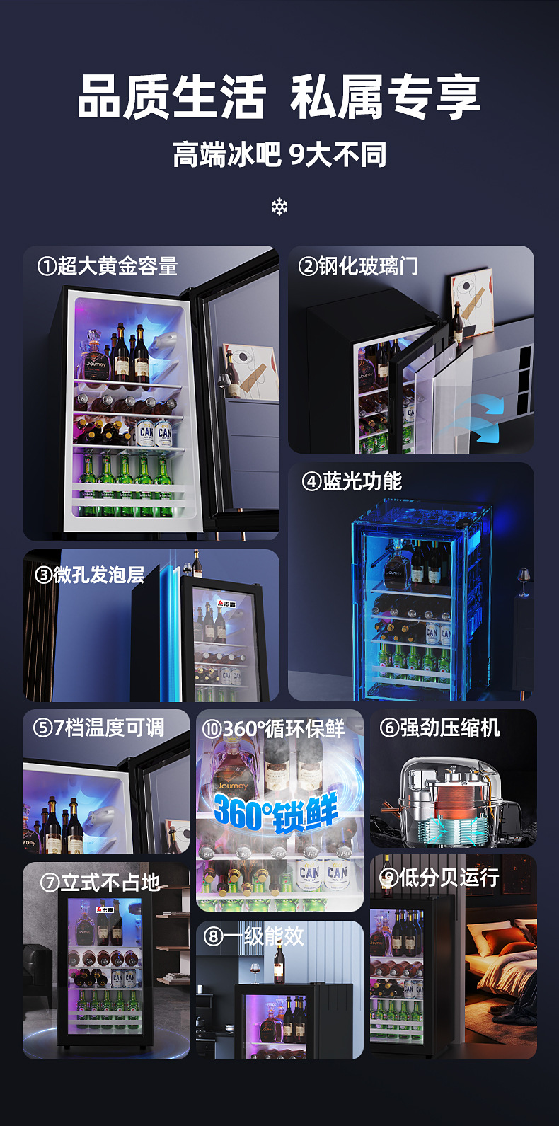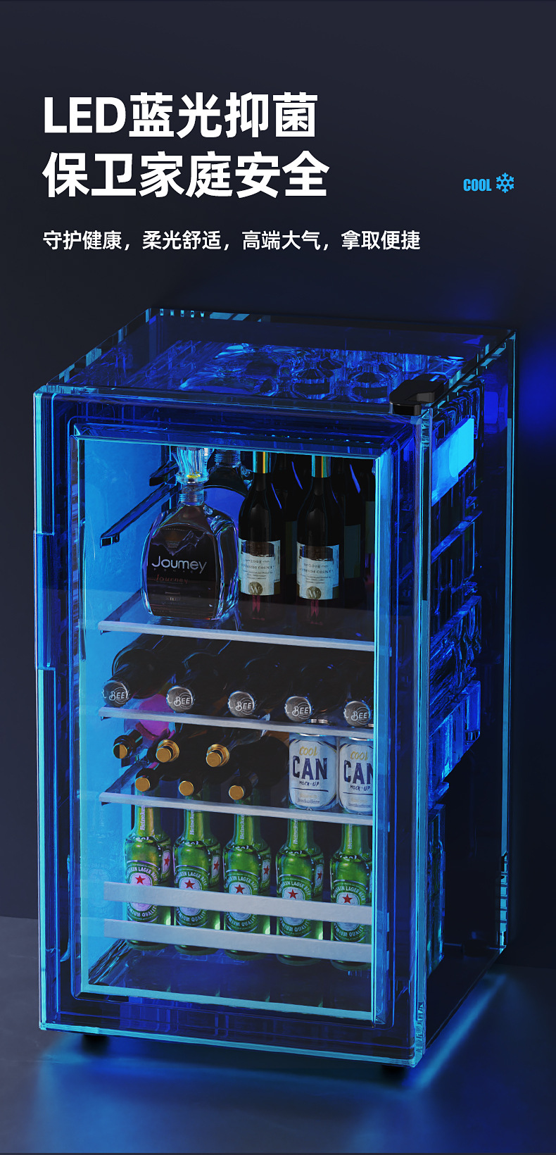 - 202 litres of gold standard black full refrigeration with blue light safety lock