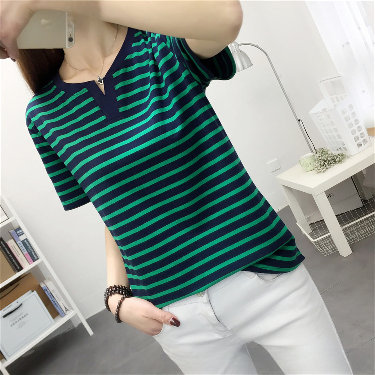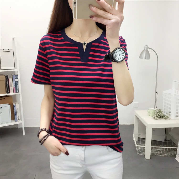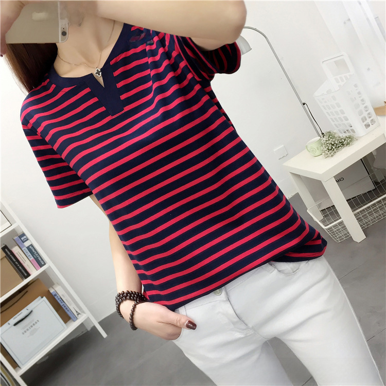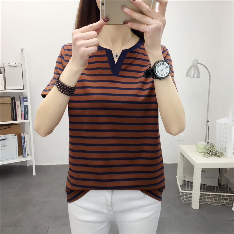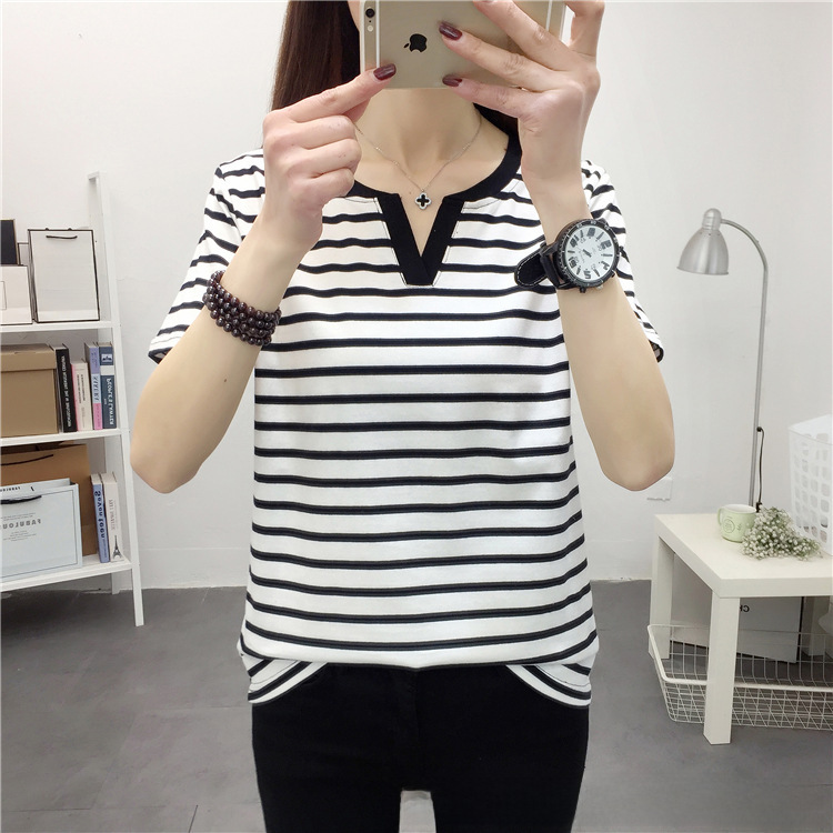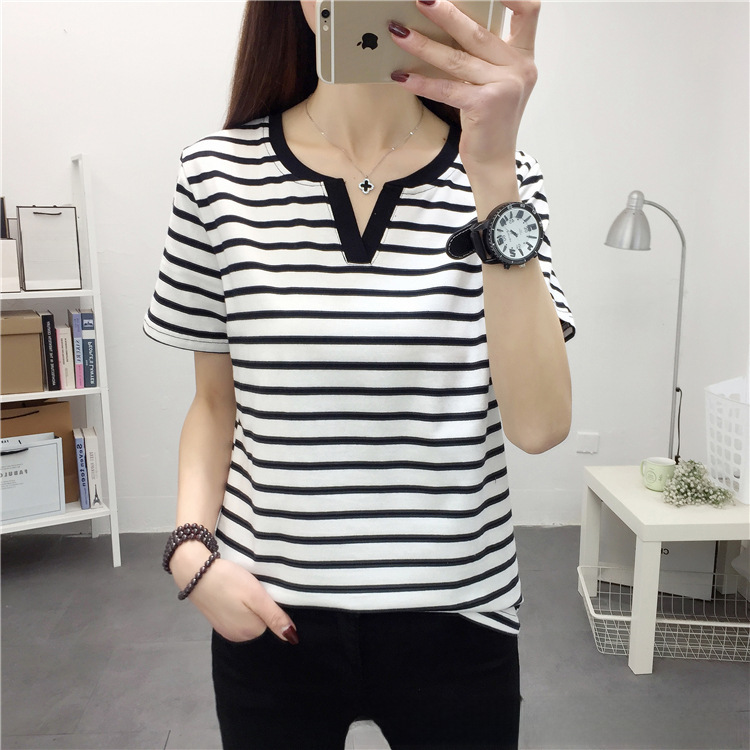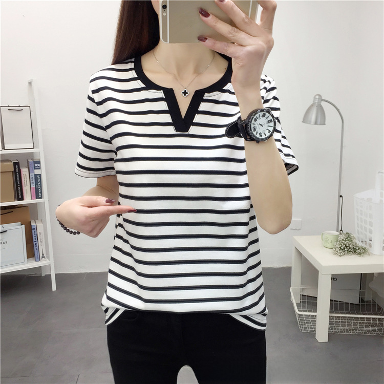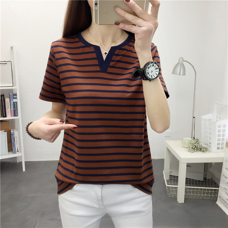 Chubby Girls Striped Short Sleeved T Shirt Women s Extensions Large Size Loose Slimming Half Sleeved T Shirt Cotton Casual V Neck Top