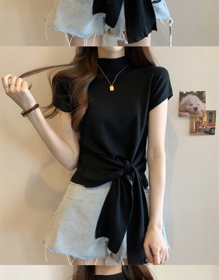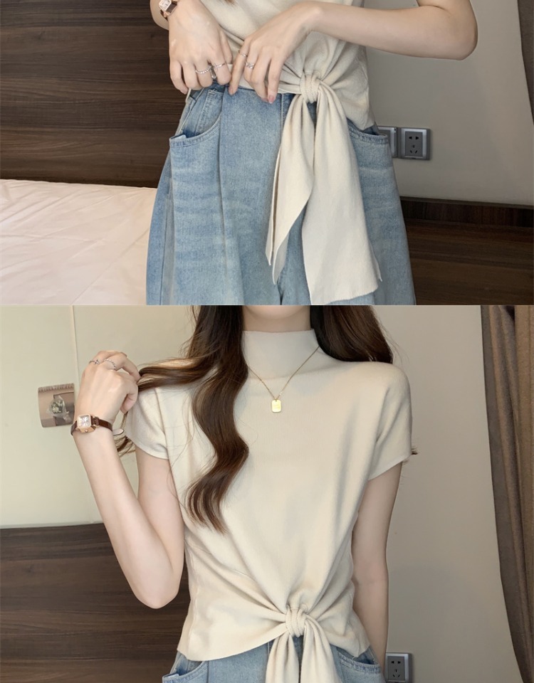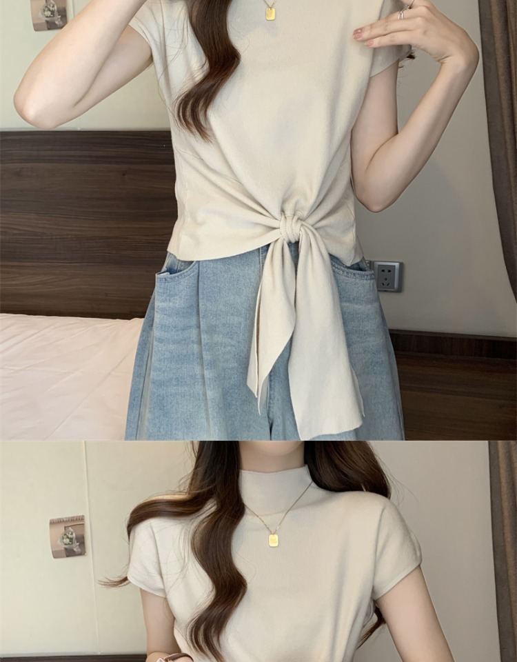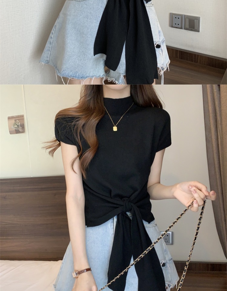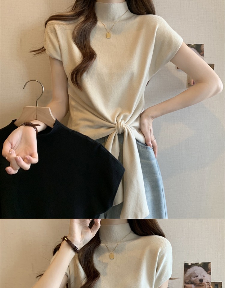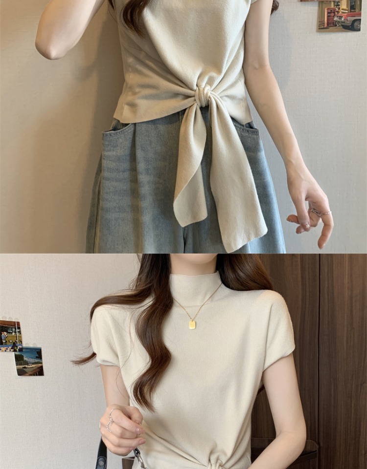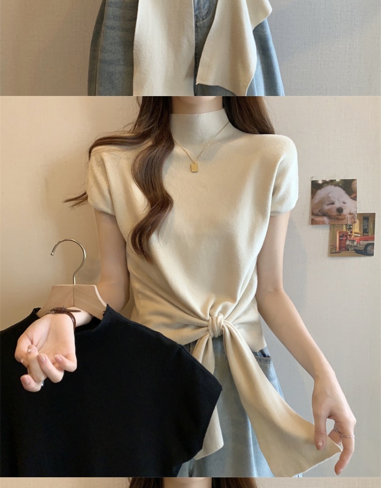 Chubby Niche T shirt Design Sense Wearing Top plus size Chic Irregular Bow Half high Collar Base Shirt for Women