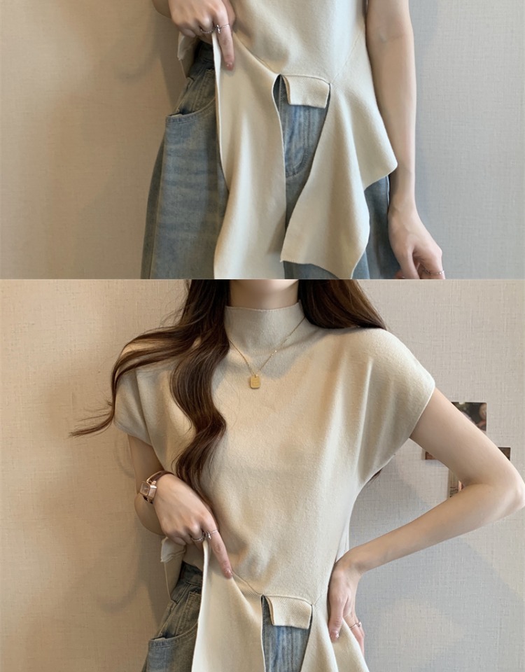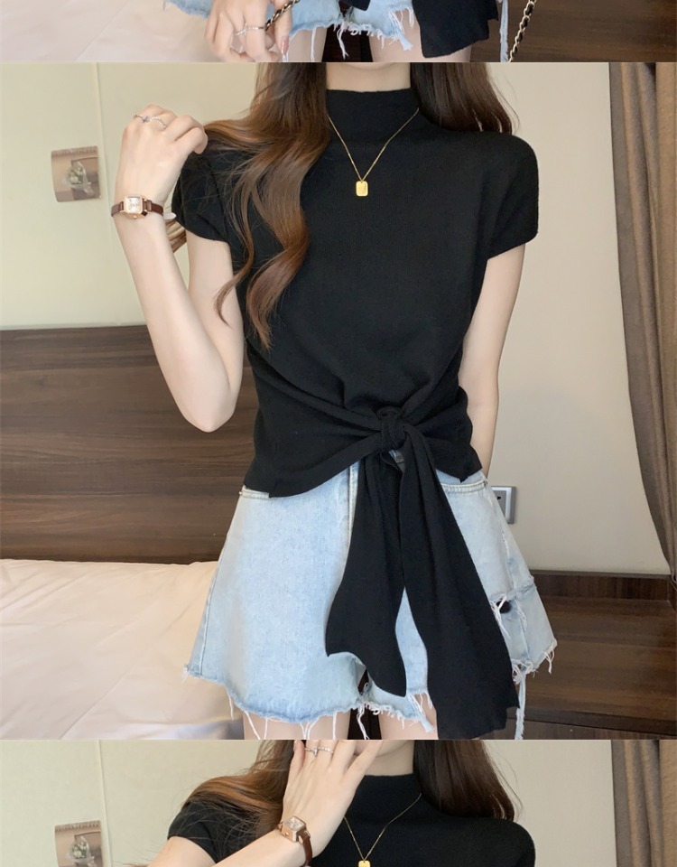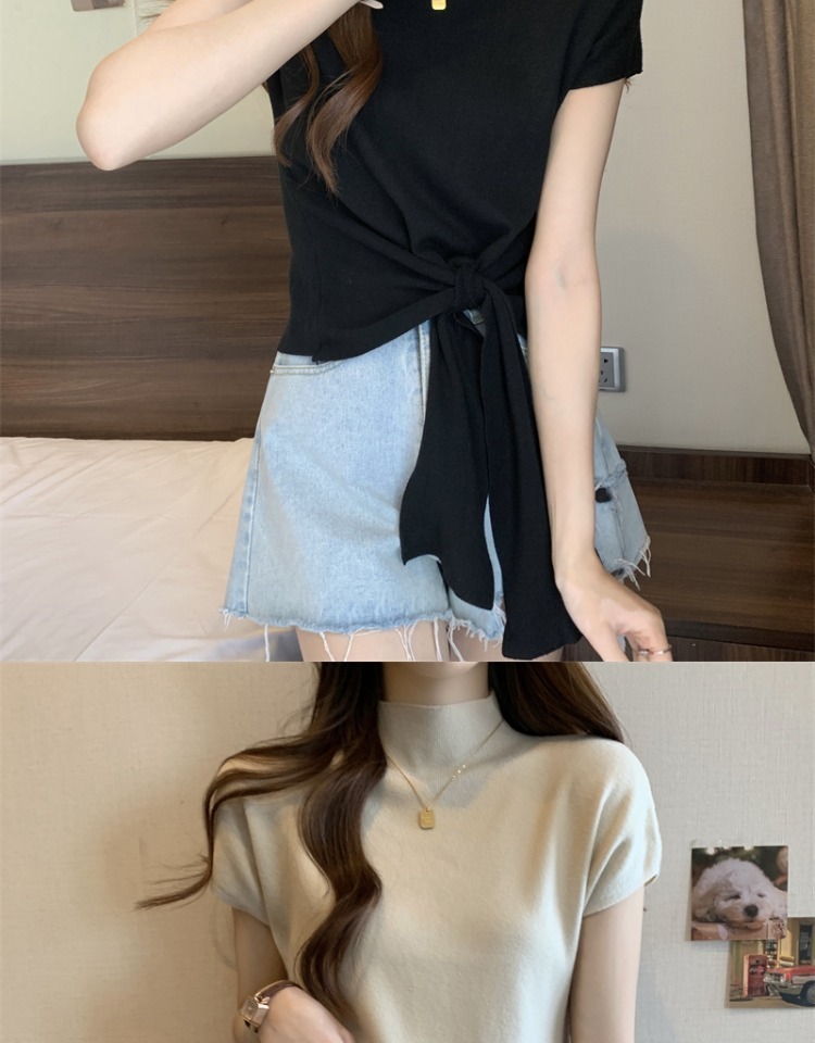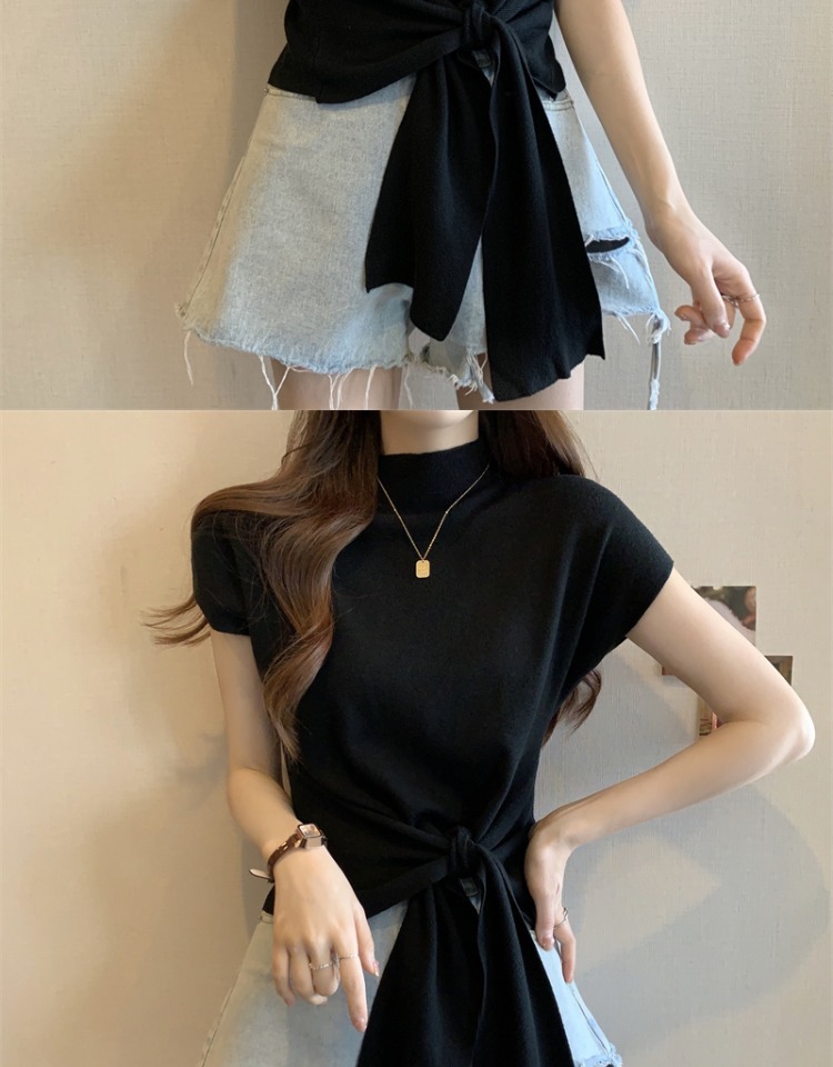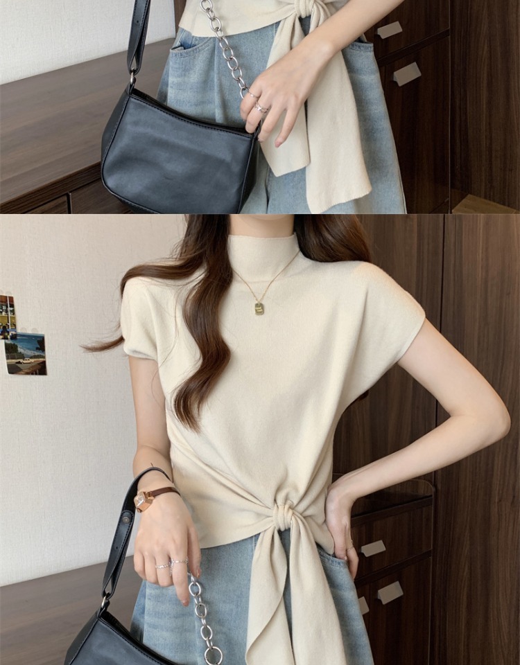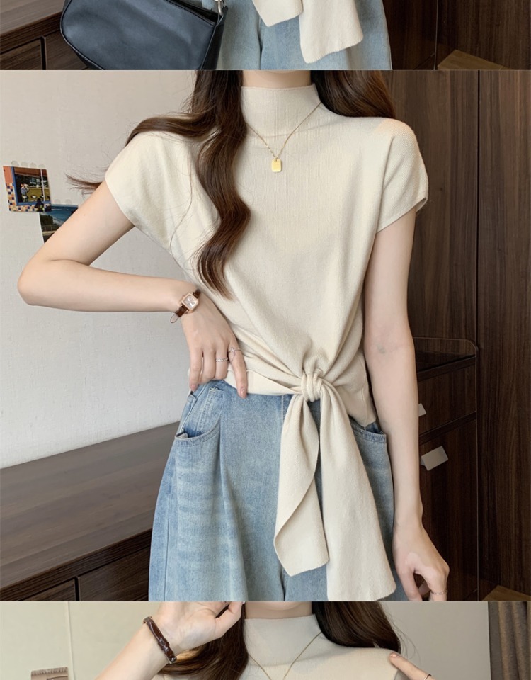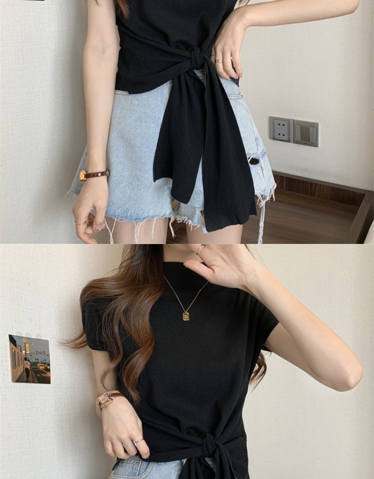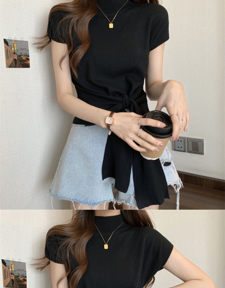 Chubby Niche T shirt Design Sense Wearing Top plus size Chic Irregular Bow Half high Collar Base Shirt for Women