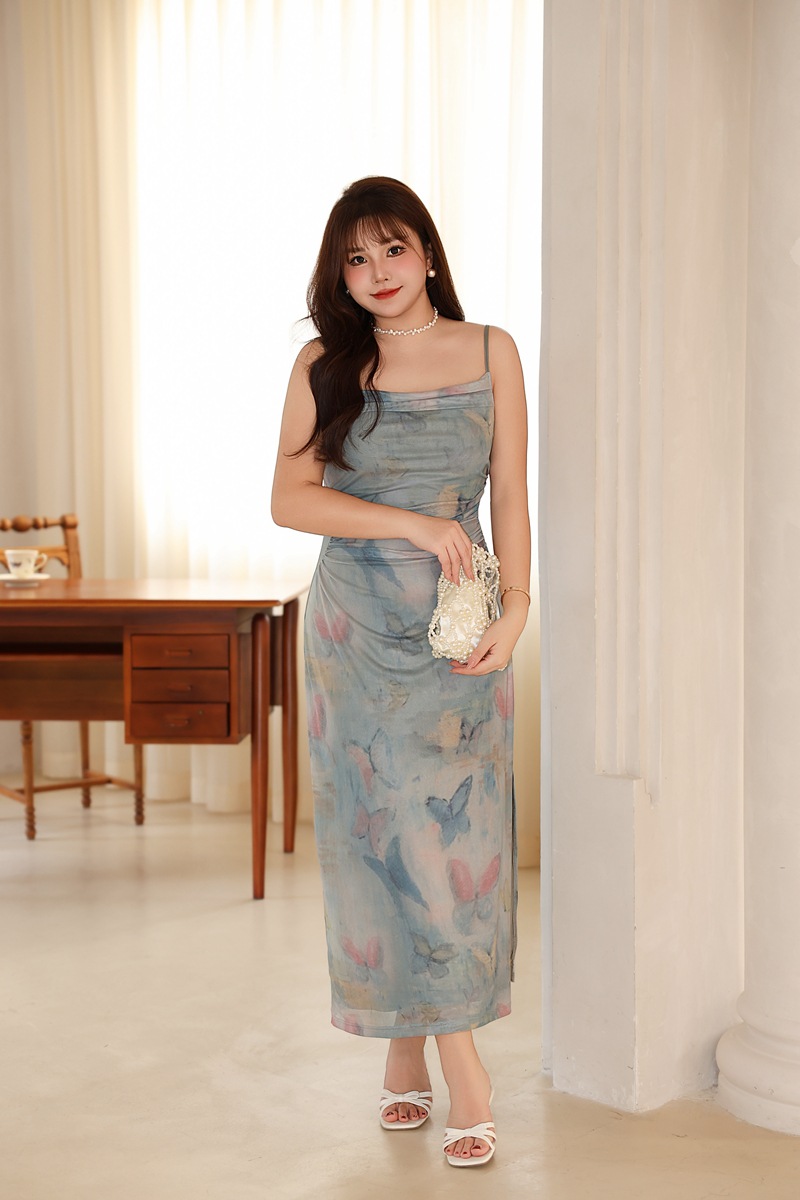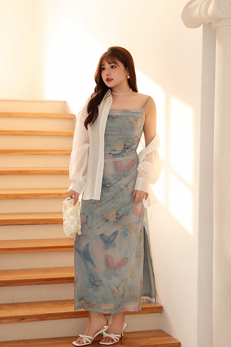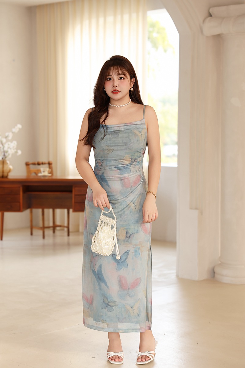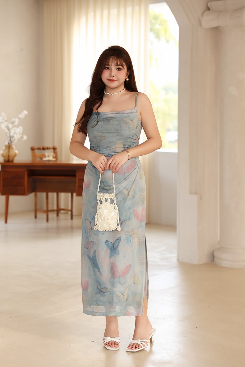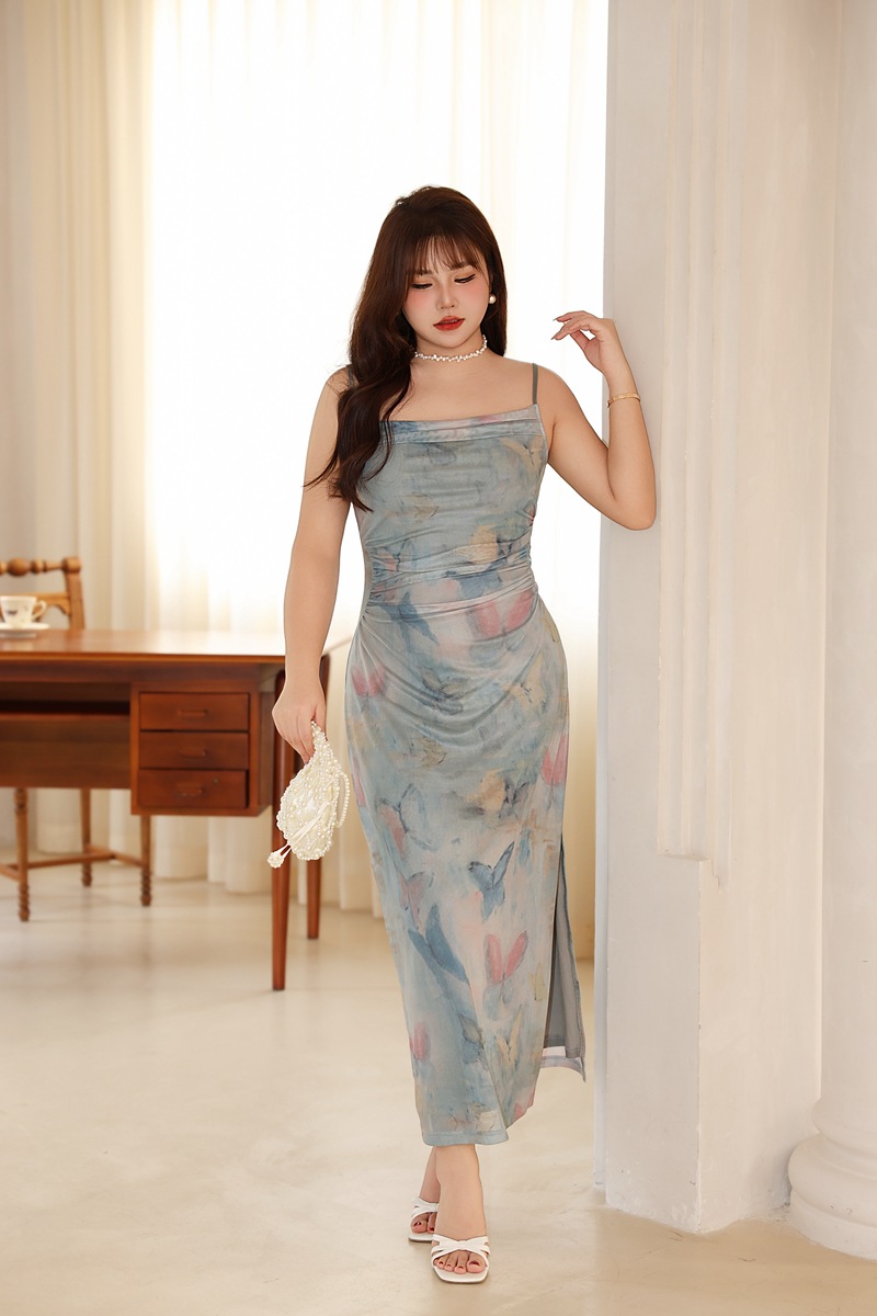 Cloud Mist tulle Blue Dream printed suspender skirt Runqi 8849 plus size French elegant printed suspender dress