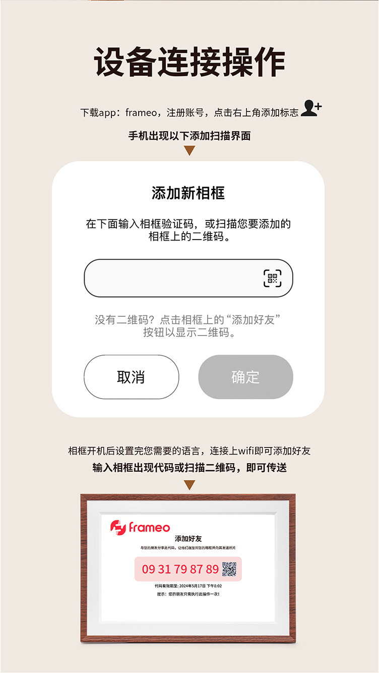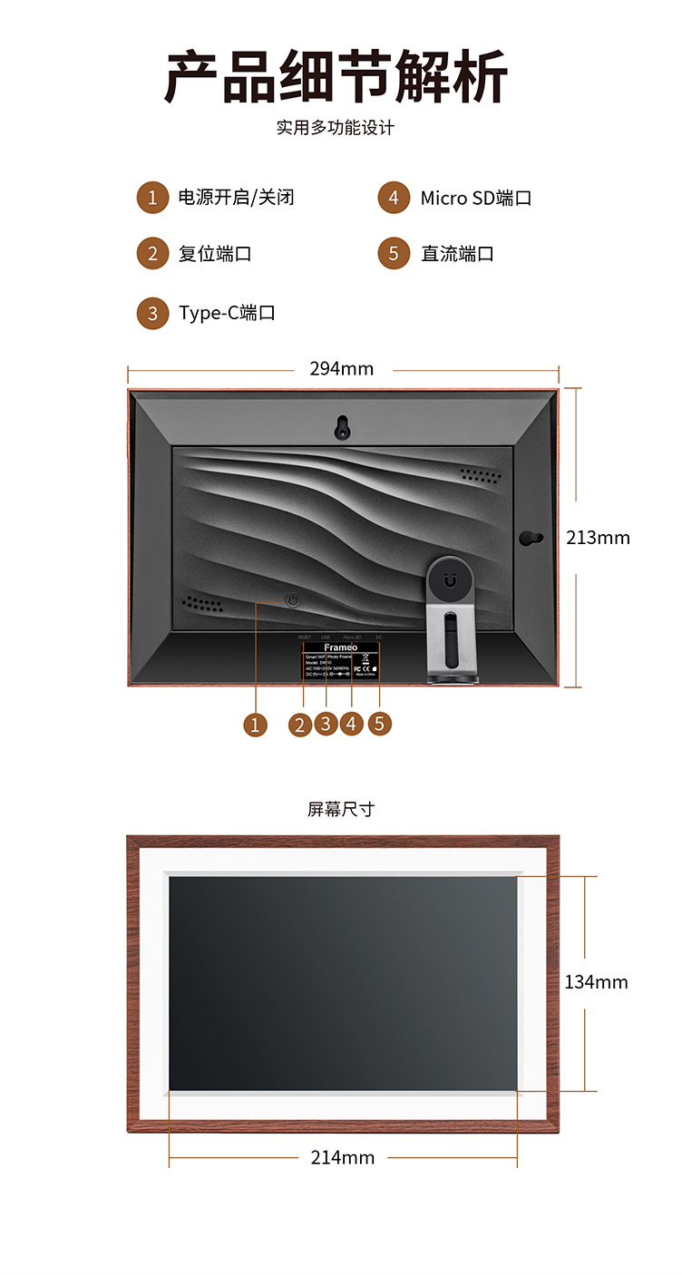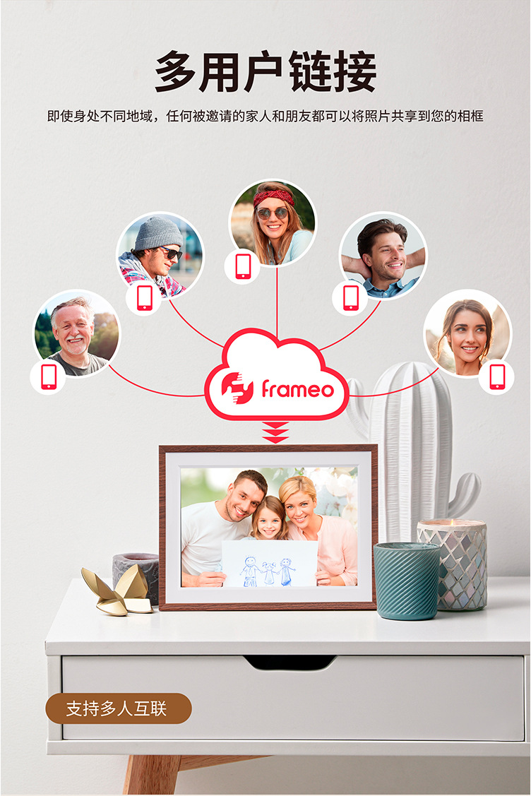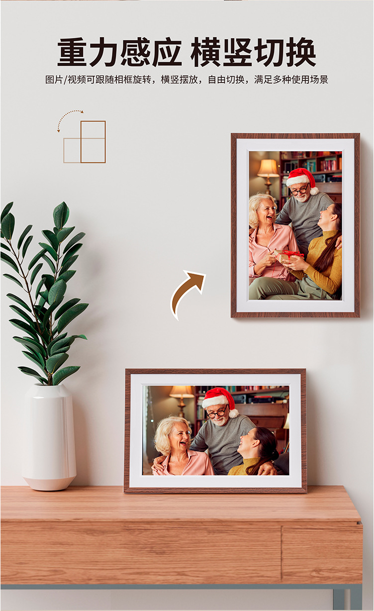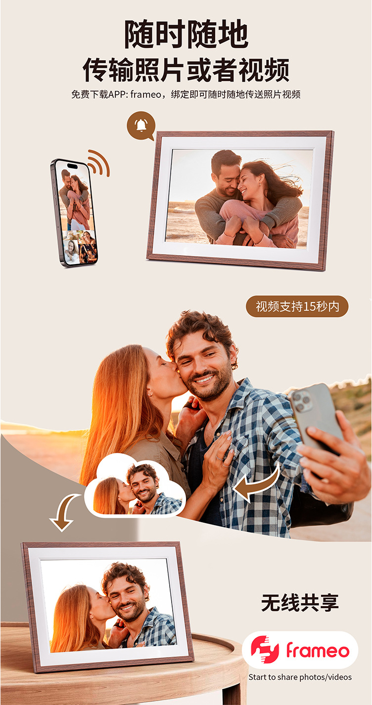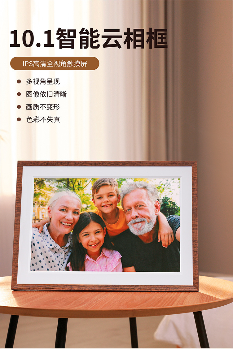 这款数码相框是Frameo系统,支持28国语言,内置32GB内存,支持32G Mirco SD卡扩展存储,还可以导入和导出图片或视频。这款 10.1 英寸数码相框分辨率1280*800 IPS 触摸屏,可让您从任何角度获得漂亮的视觉效果。相框支持JPG/JPEG/BMP/PNG图片格式和MP4视频格式。数码相框可以自动旋转照片以调整方向,配有可拆卸支架作为相框支架,可让您以纵向或横向模式查看照片。显示标题、天气和时钟。多功能自定义设置,如播放顺序、图像缩放、隐藏/发布图像、可调亮度、睡眠模式等。用户友好的界面设计使其易于使用,适合所有年龄段的人。我们电源默认是美规,如需英规,欧规请下单时备注。