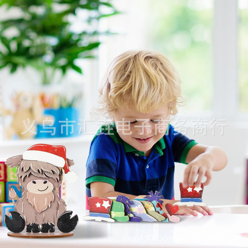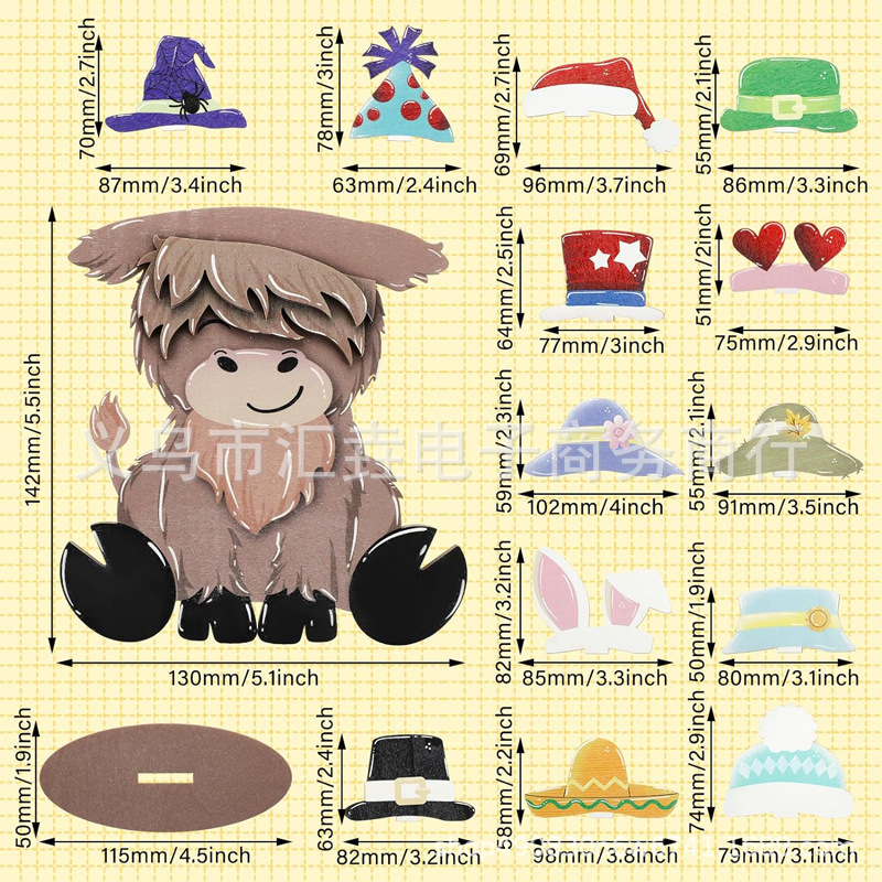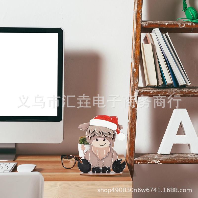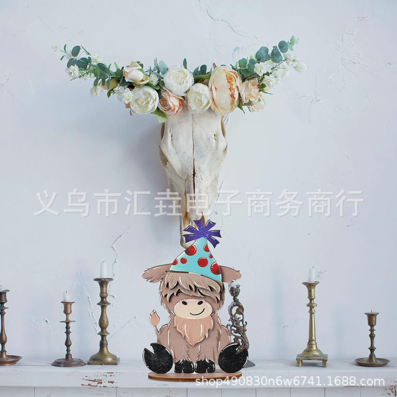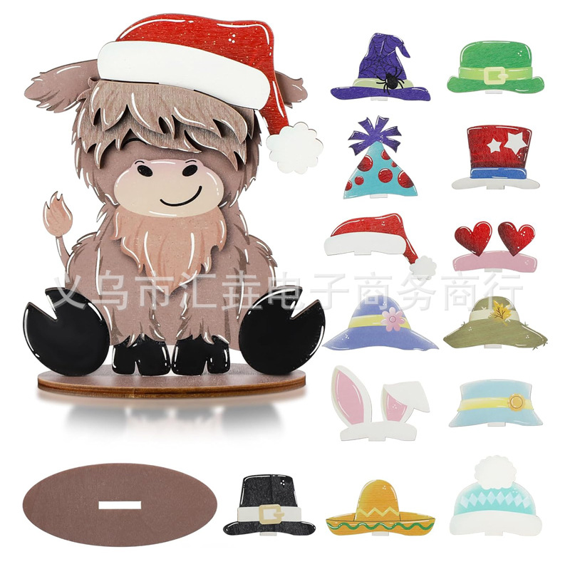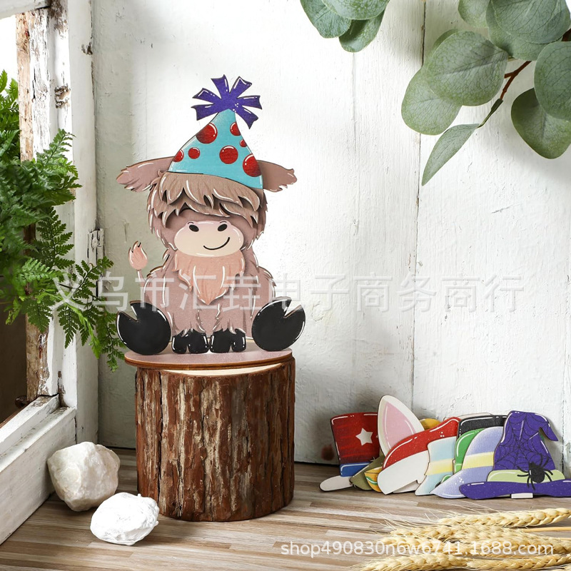 Cross border spot Cow farmhouse layered tray decorative belt interchangeable seasonal hat wooden Highland cattle ornaments