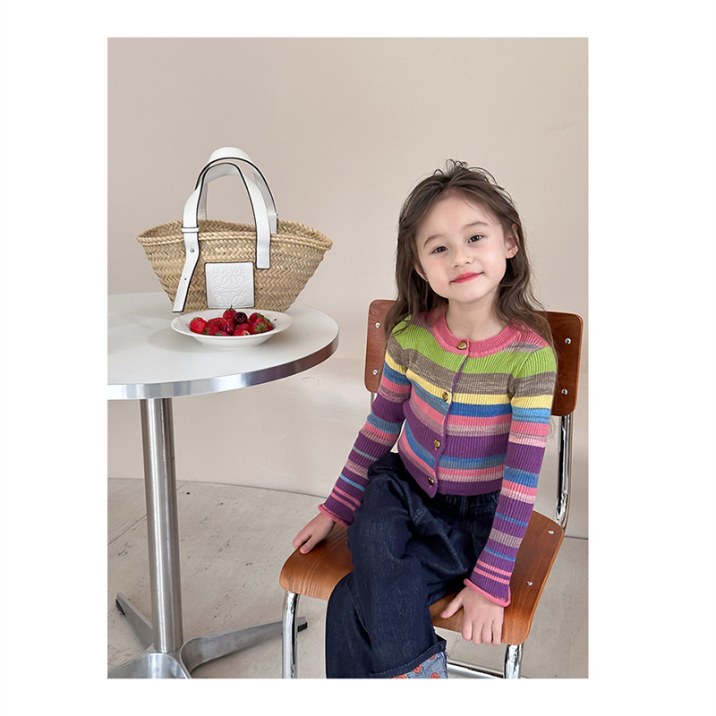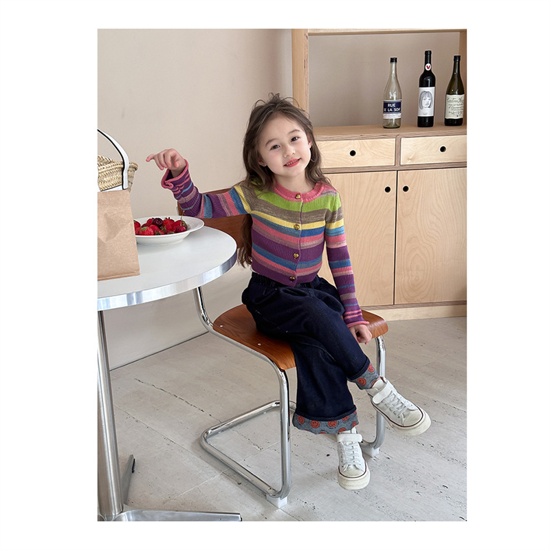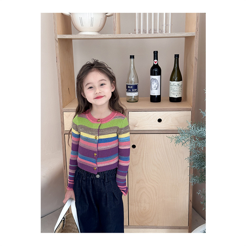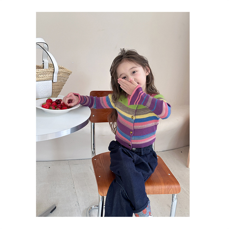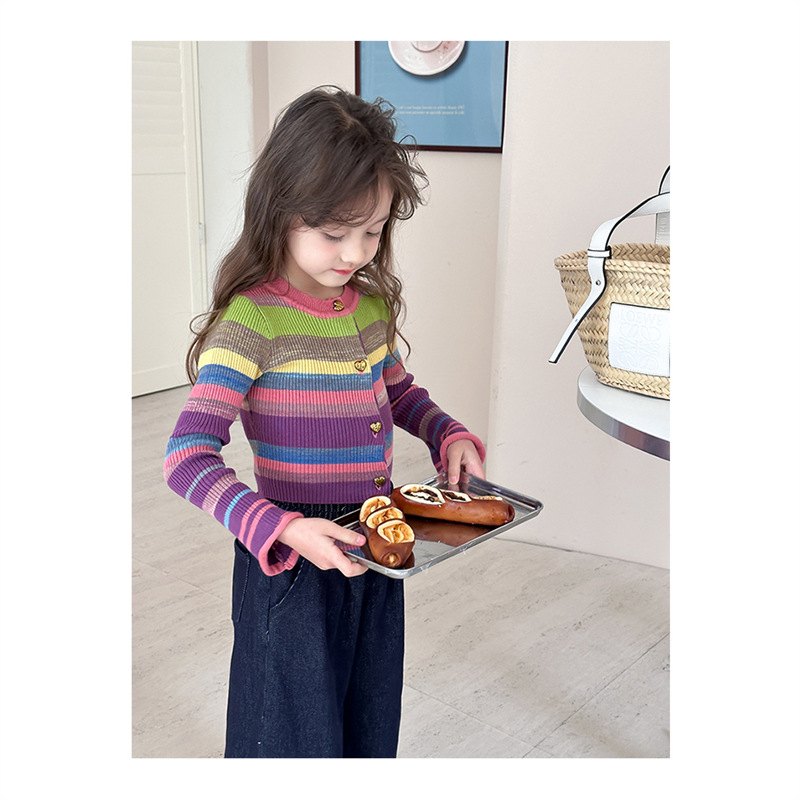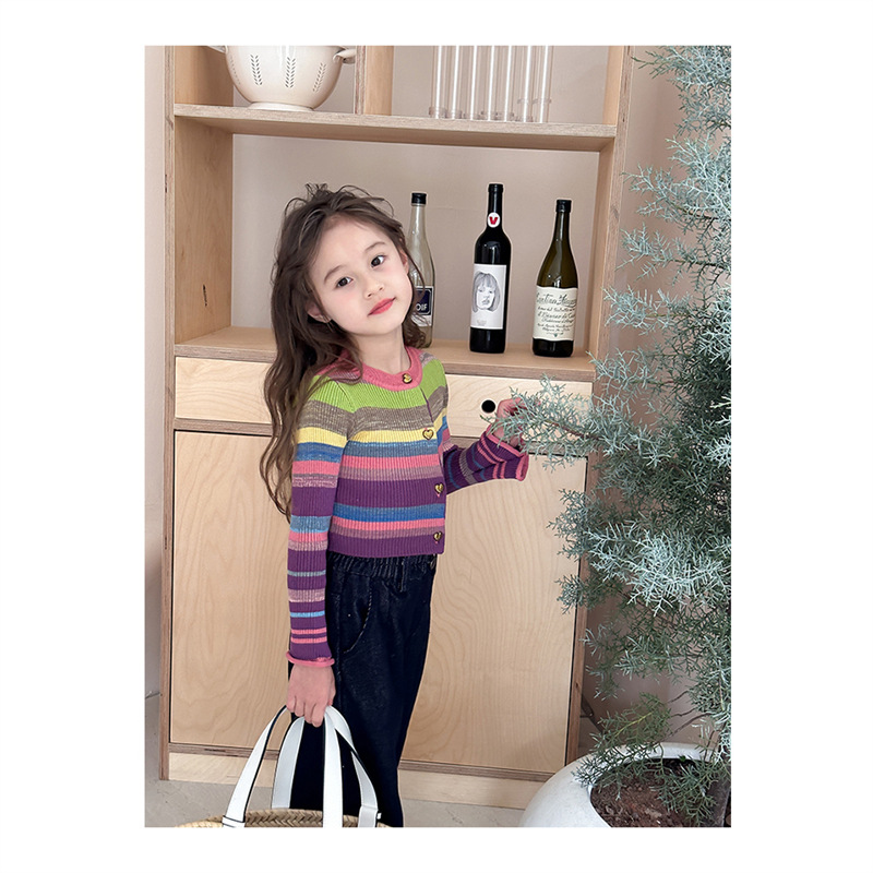 Dopamine Wear Spring and Autumn Girls Korean Style Horn Sleeve Slim fit Knitted T shirt Children s Striped Sweater Baby Coat