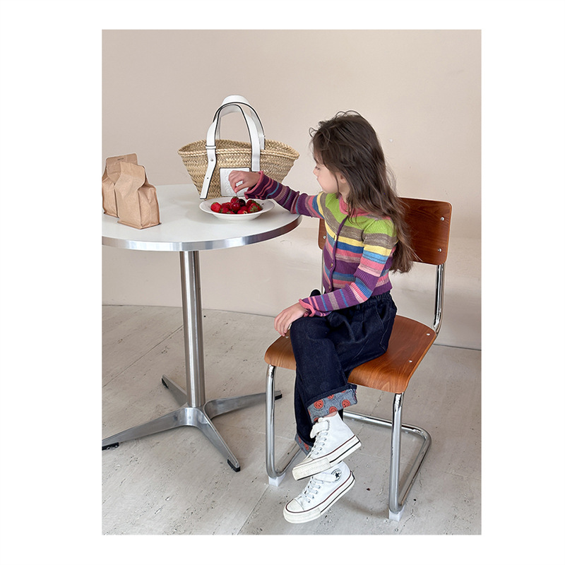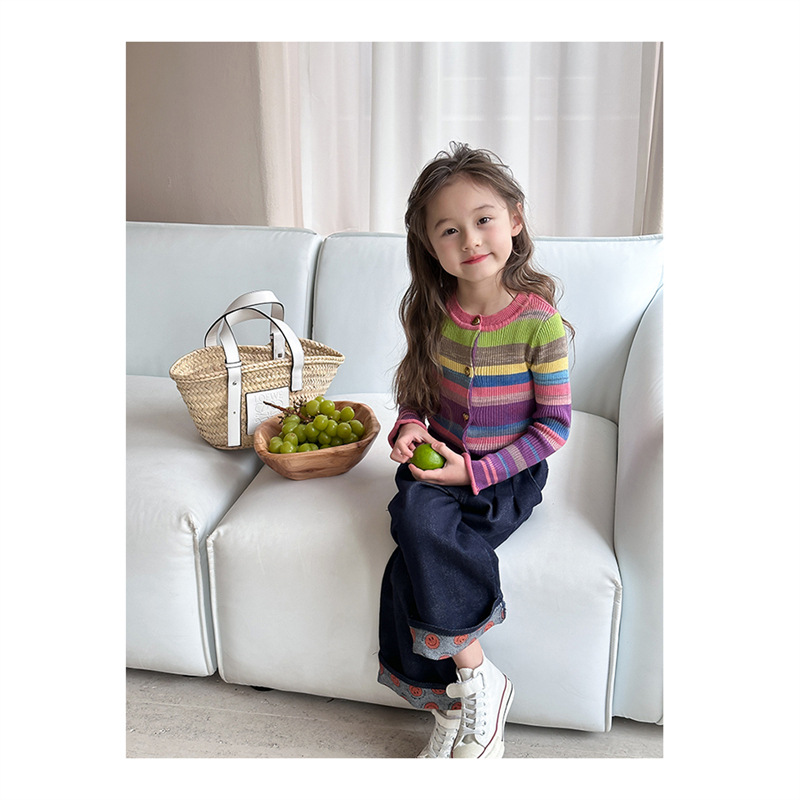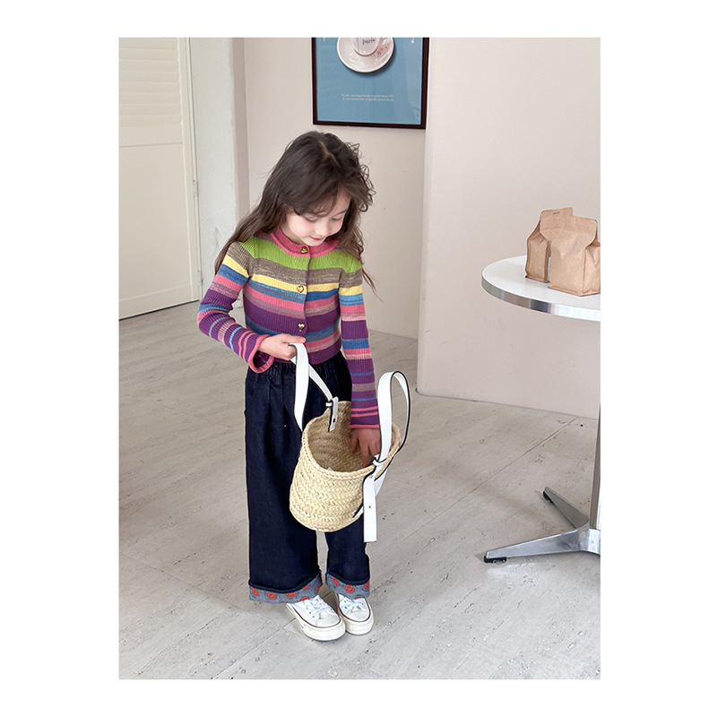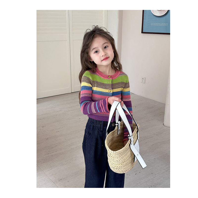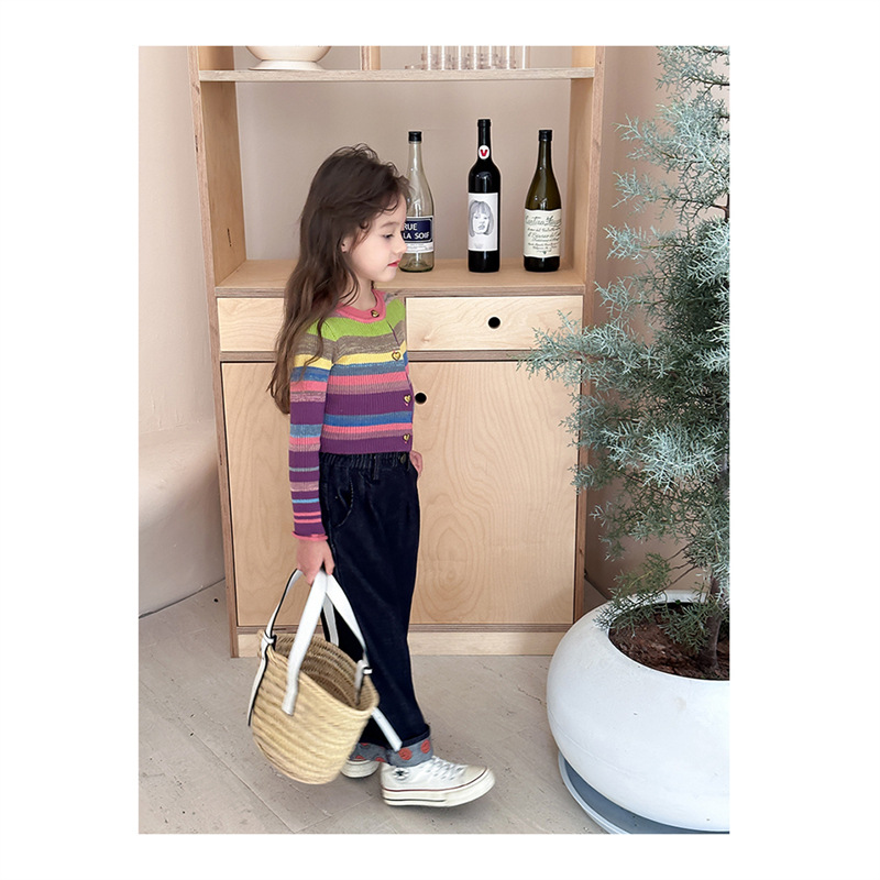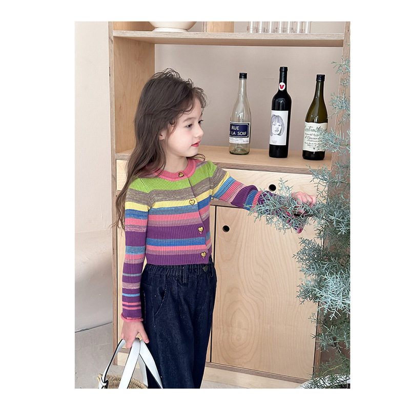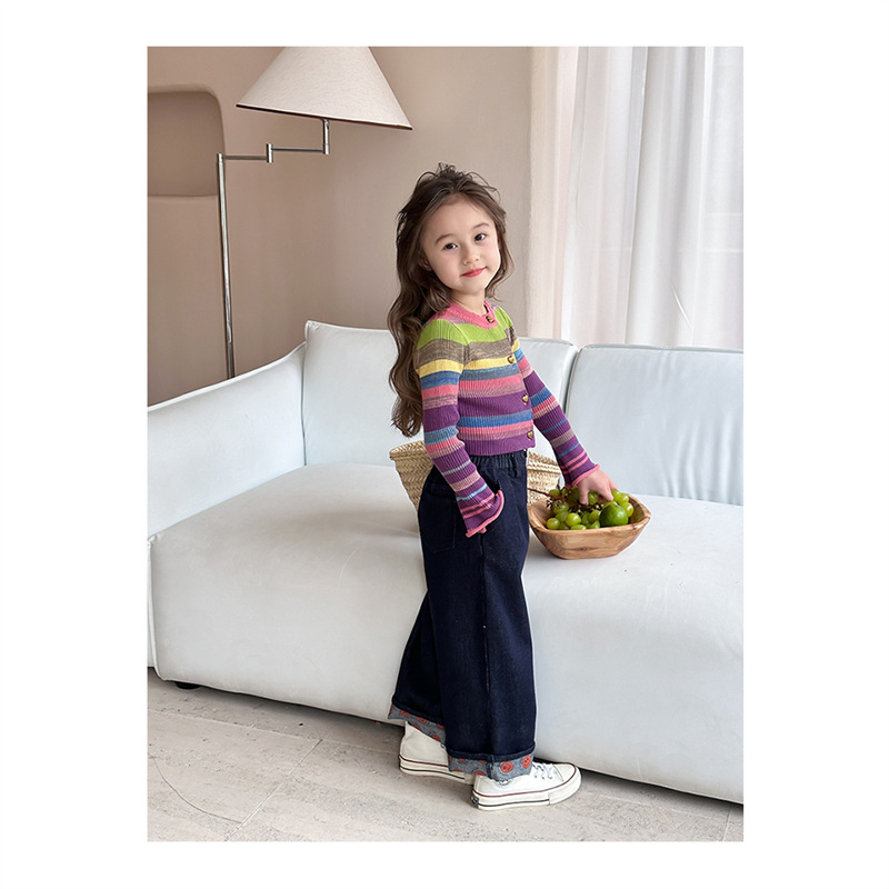 Dopamine Wear Spring and Autumn Girls Korean Style Horn Sleeve Slim fit Knitted T shirt Children s Striped Sweater Baby Coat