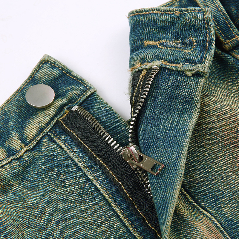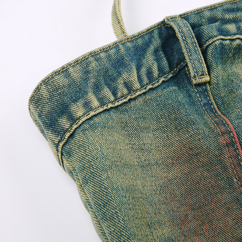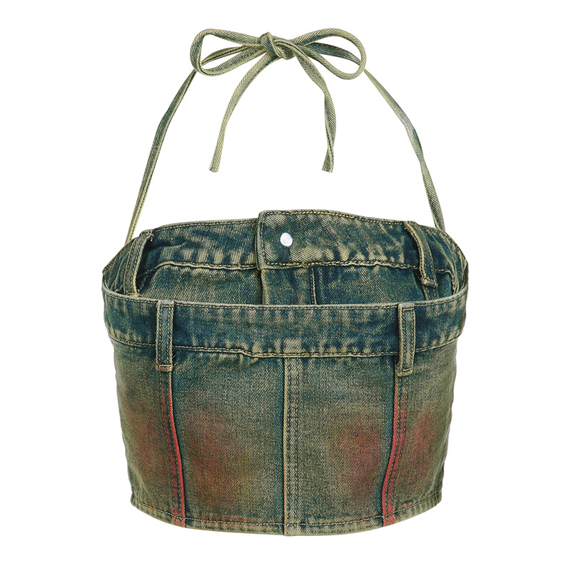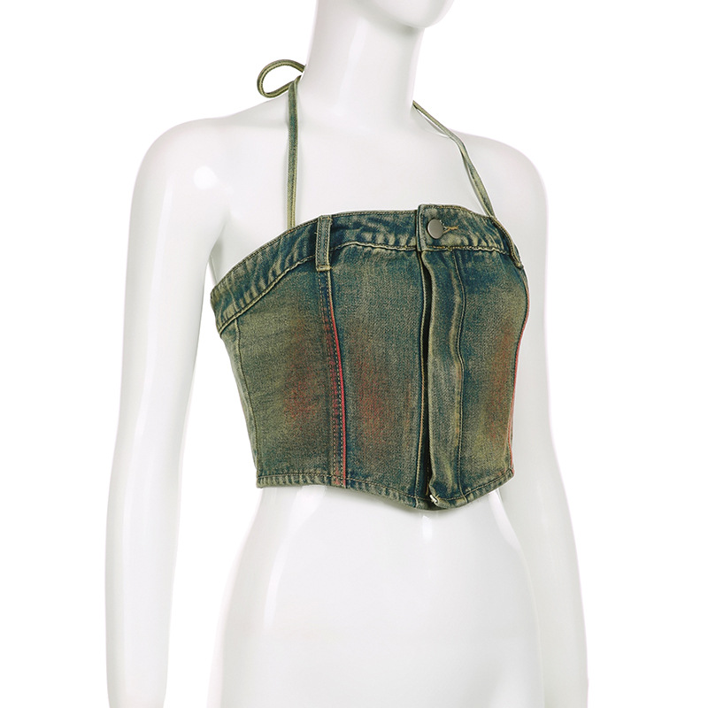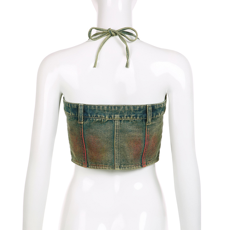 European and American Fashion Street Women s Heavy Industry Wash Gradual Color Hanging Neck Lace Vest Zipper Collar Tube Top Sling