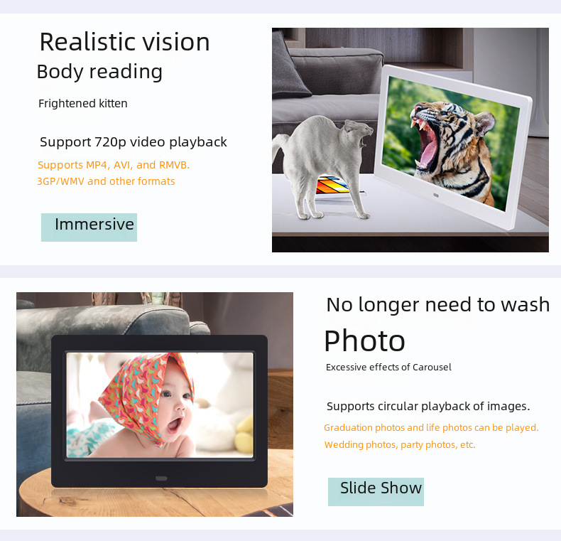 Brightness:With a brightness of 350 lumens, this digital frame ensures clear and vibrant display of your photos and videos, making them pop and catch the attention.