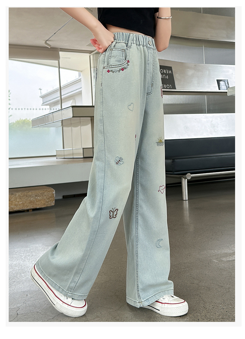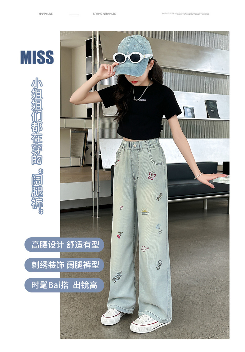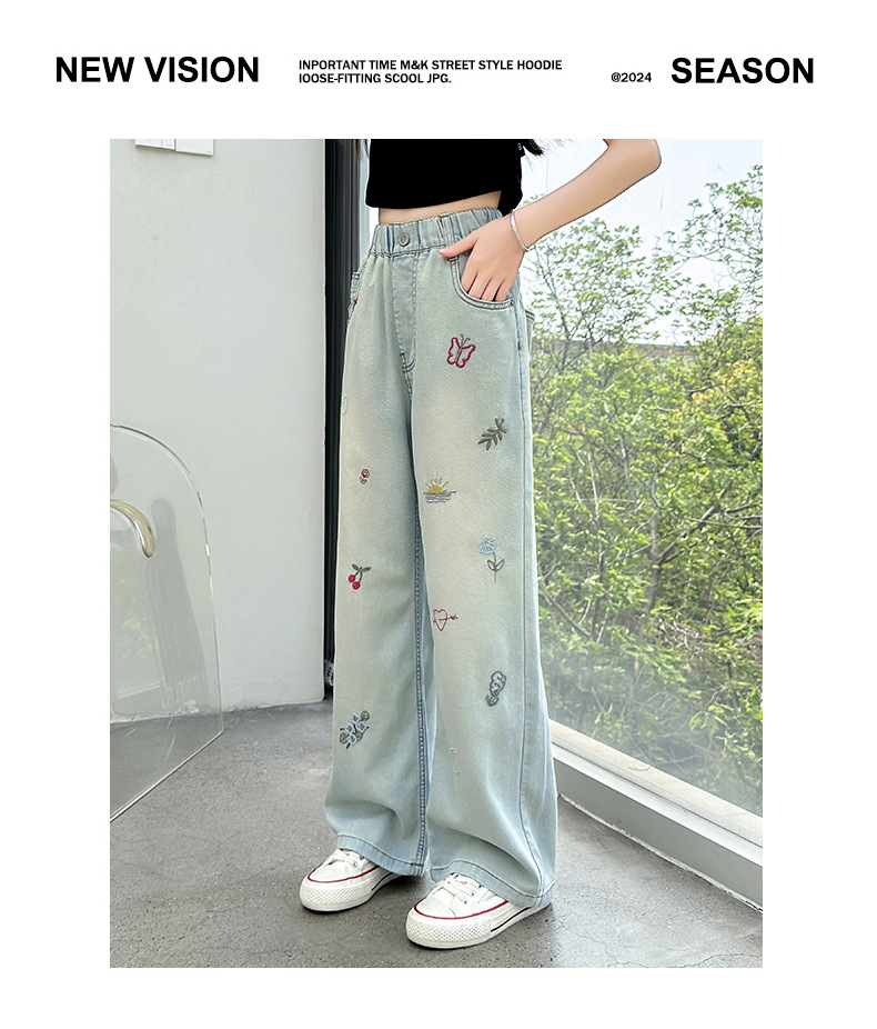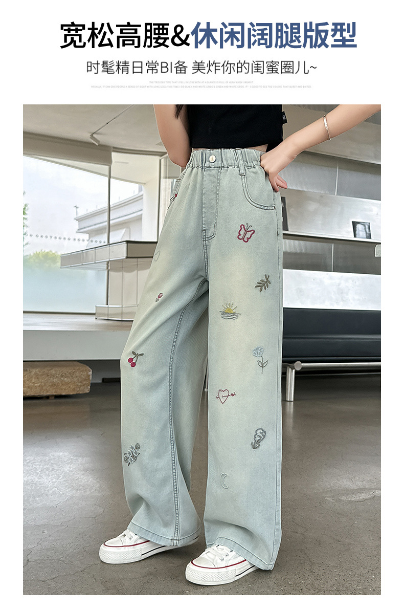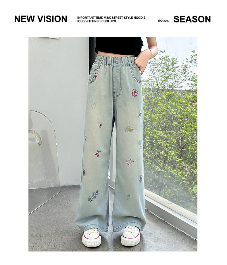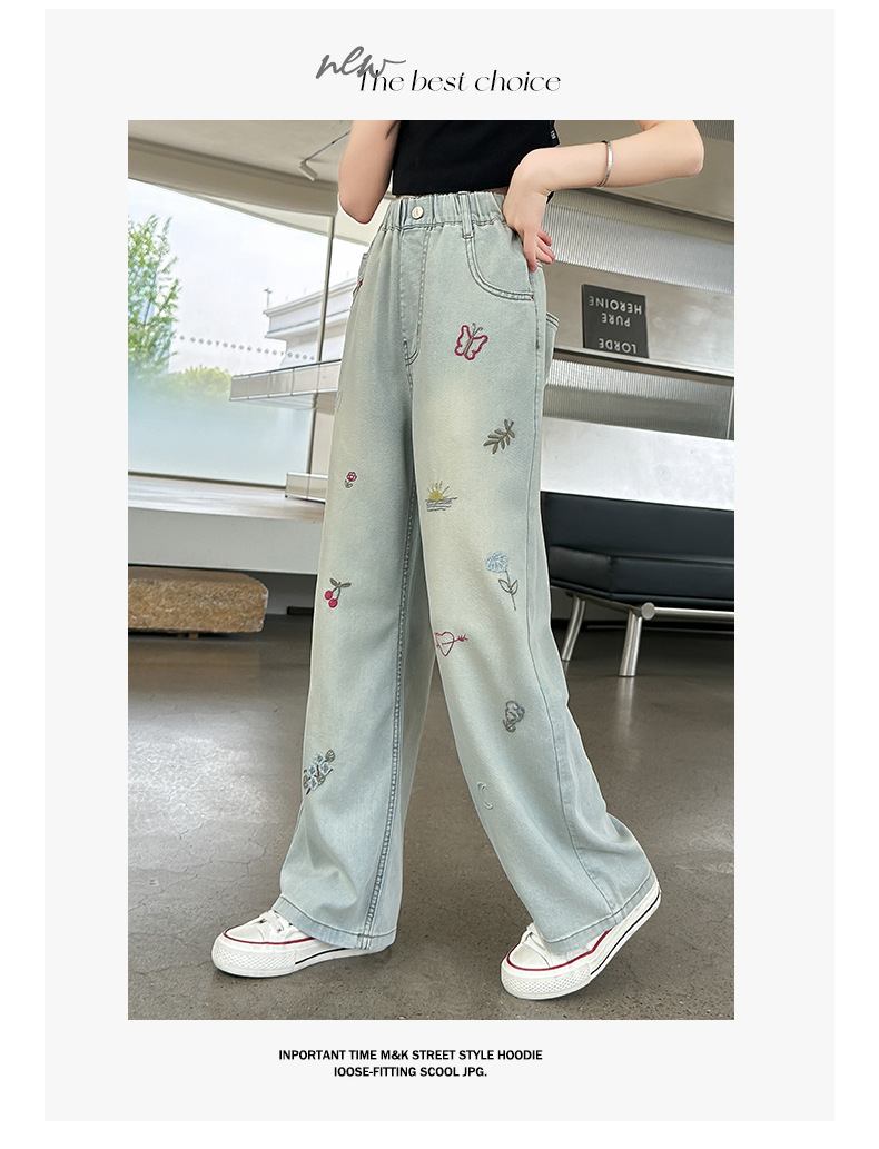 Girls Embroidered Jeans Summer 2024 New Children s Straight Wide Leg Pants Girls Big Children s Thin Pants for Junior High School Students