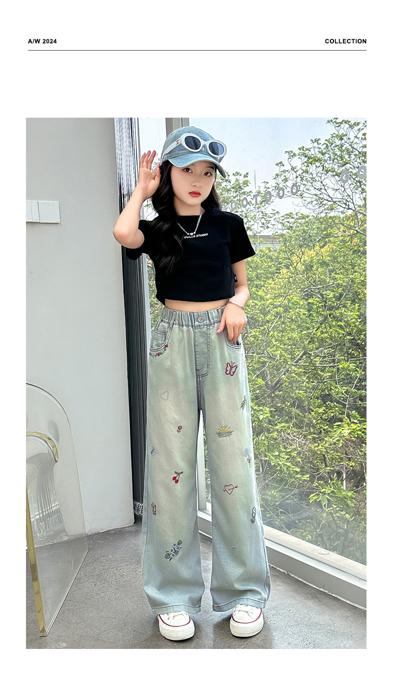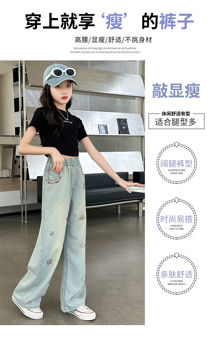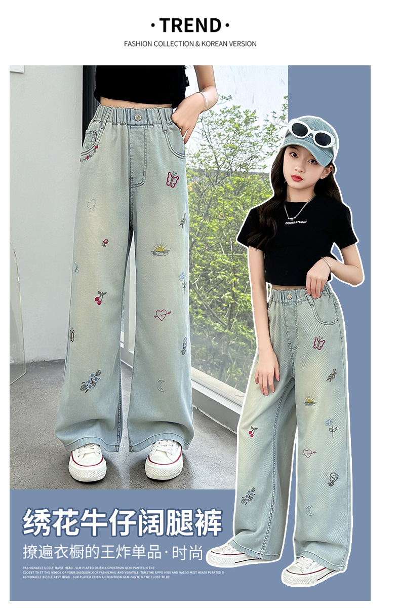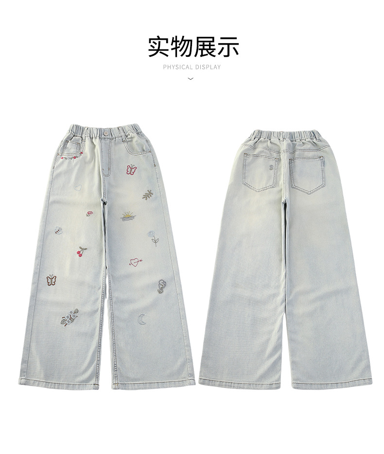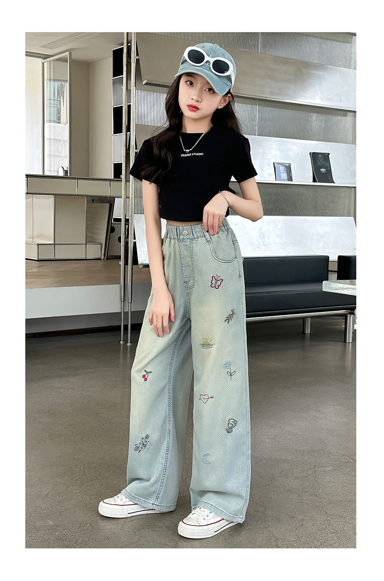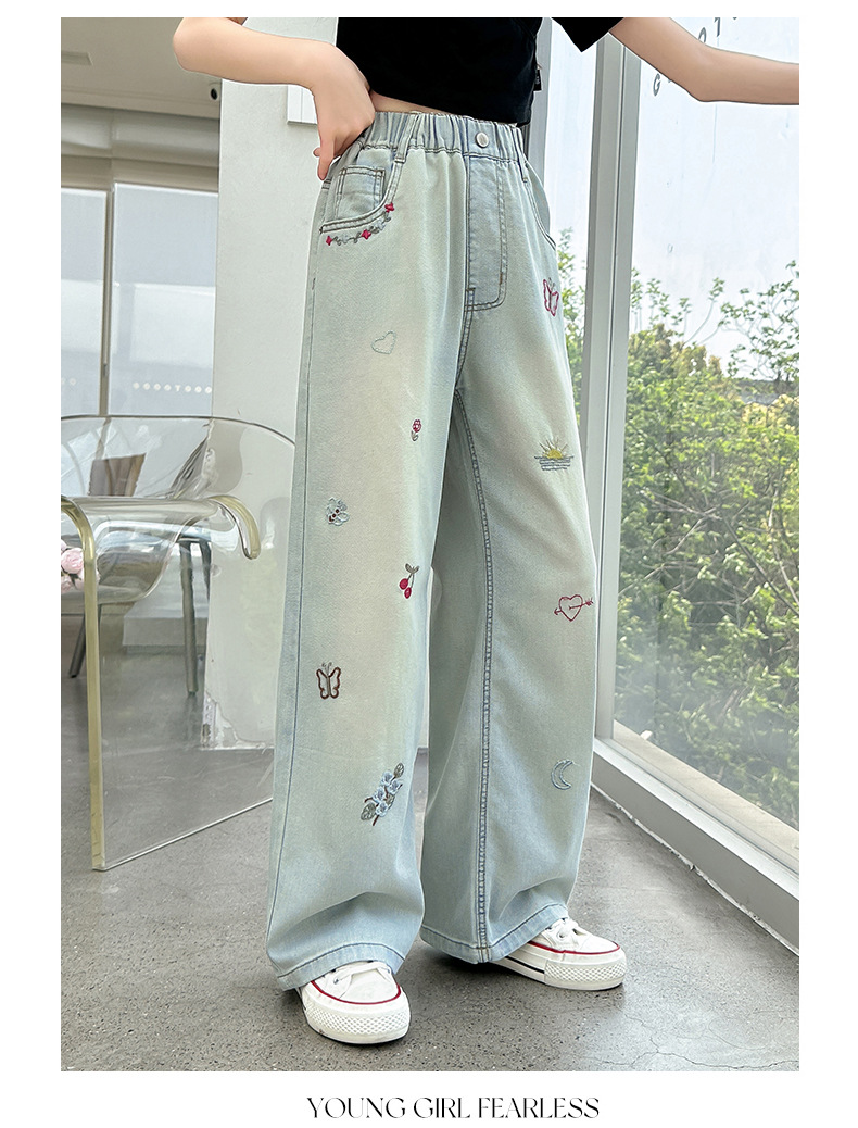 Girls Embroidered Jeans Summer 2024 New Children s Straight Wide Leg Pants Girls Big Children s Thin Pants for Junior High School Students