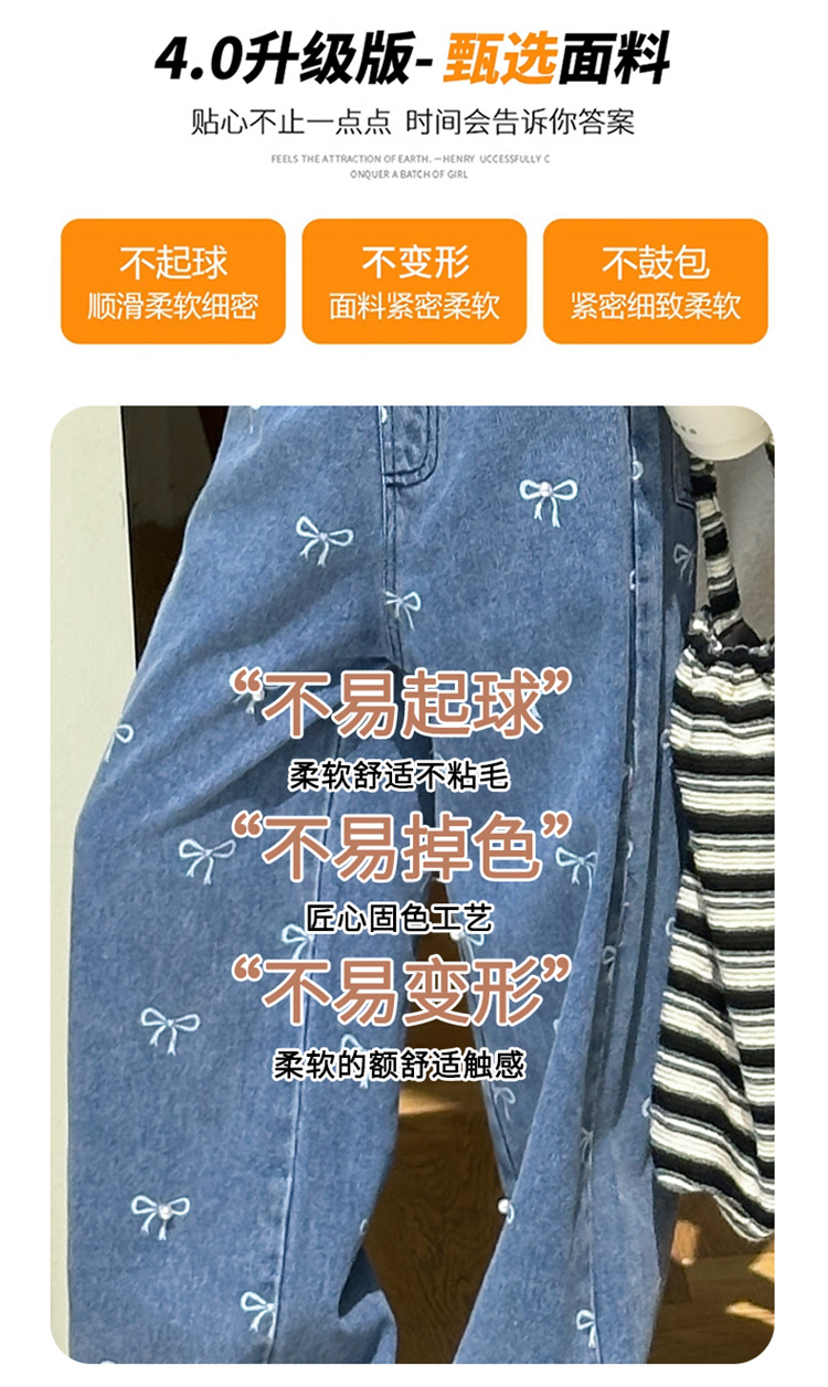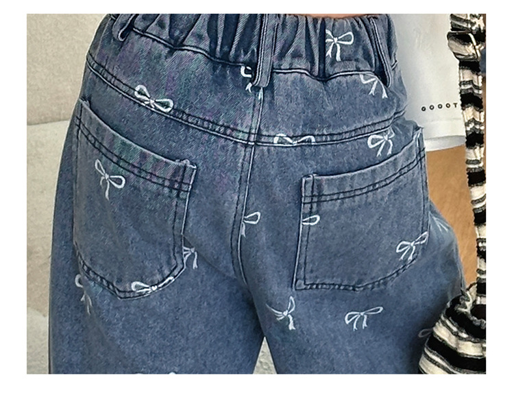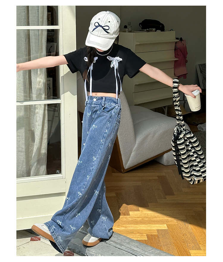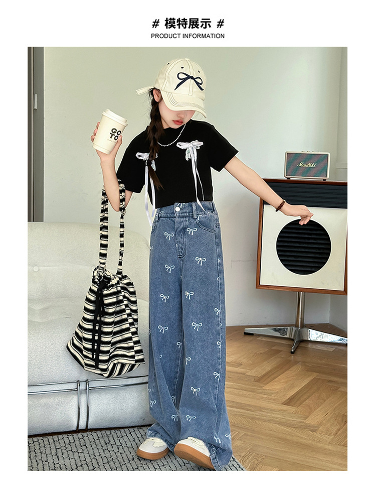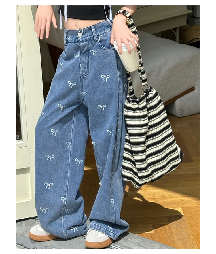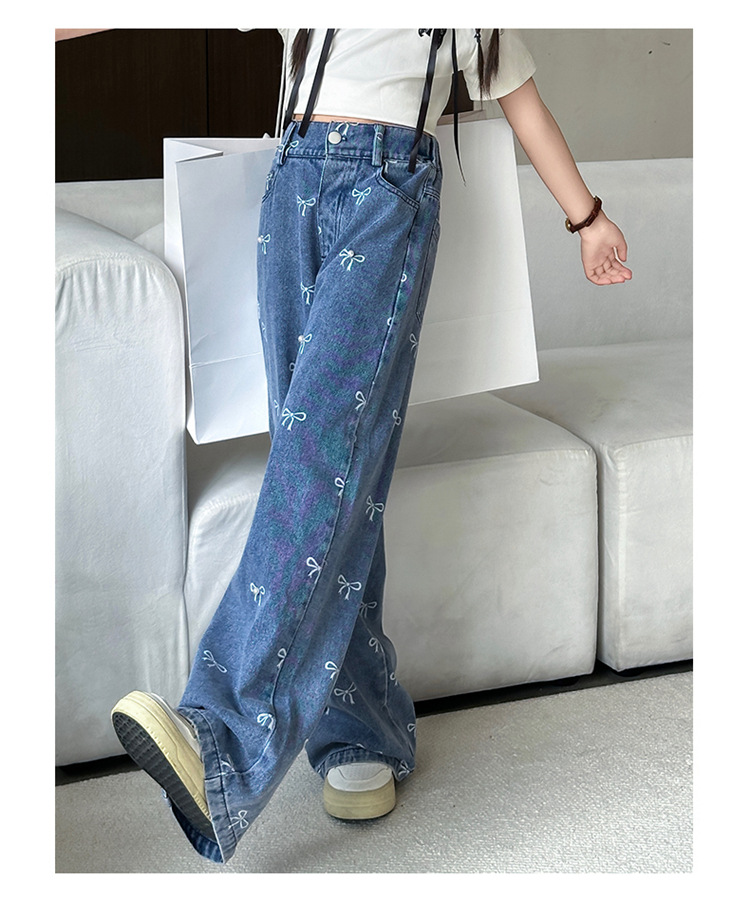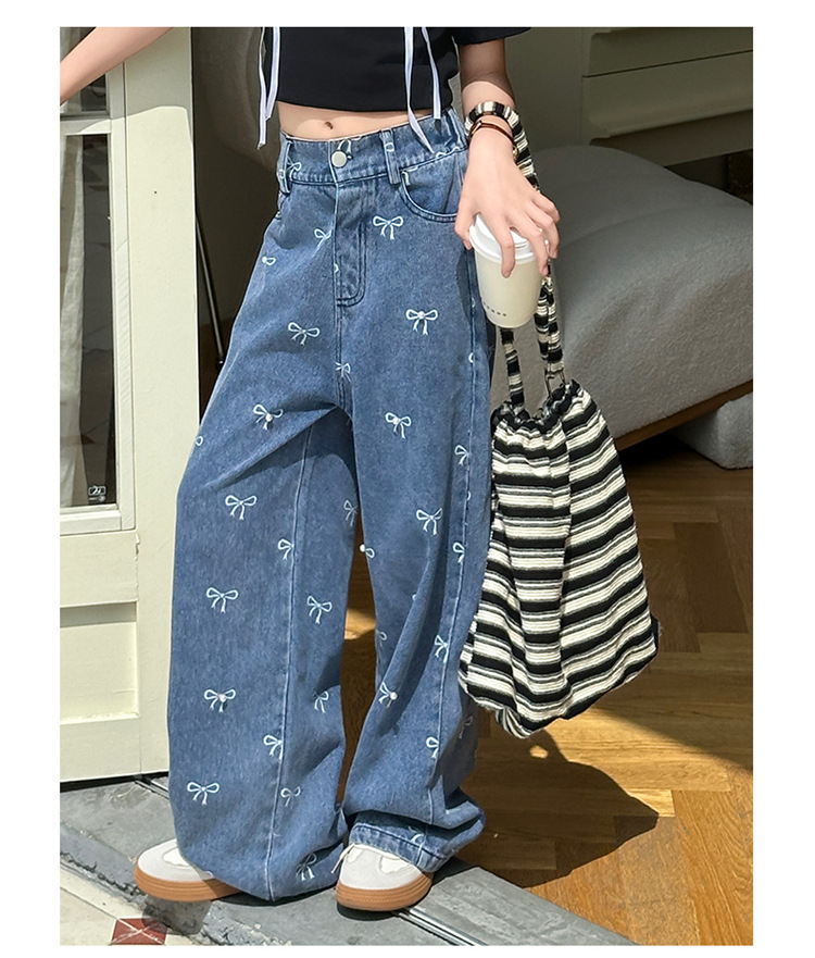 Girls Summer Pants 2024 New Children s Jeans Bow Print Girls Wide Leg Pants Fashionable Western Style