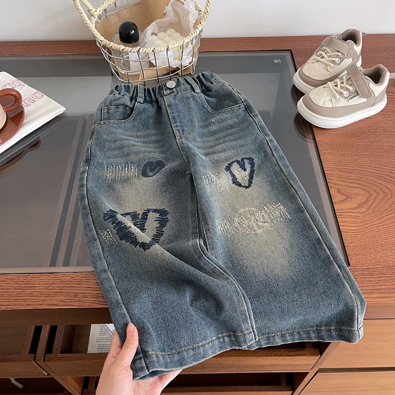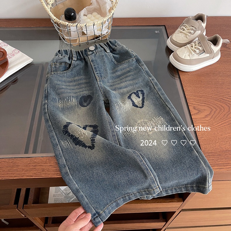 Girls jeans spring and autumn 2024 New Western style fashionable children s straight pants love embroidered wide leg pants