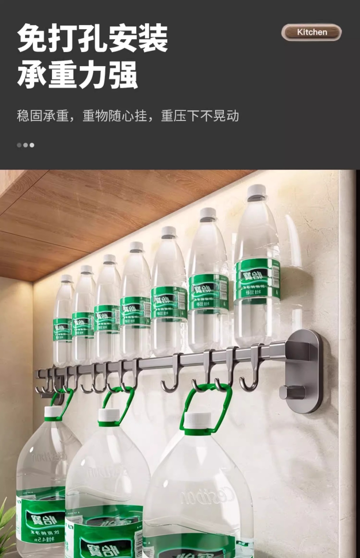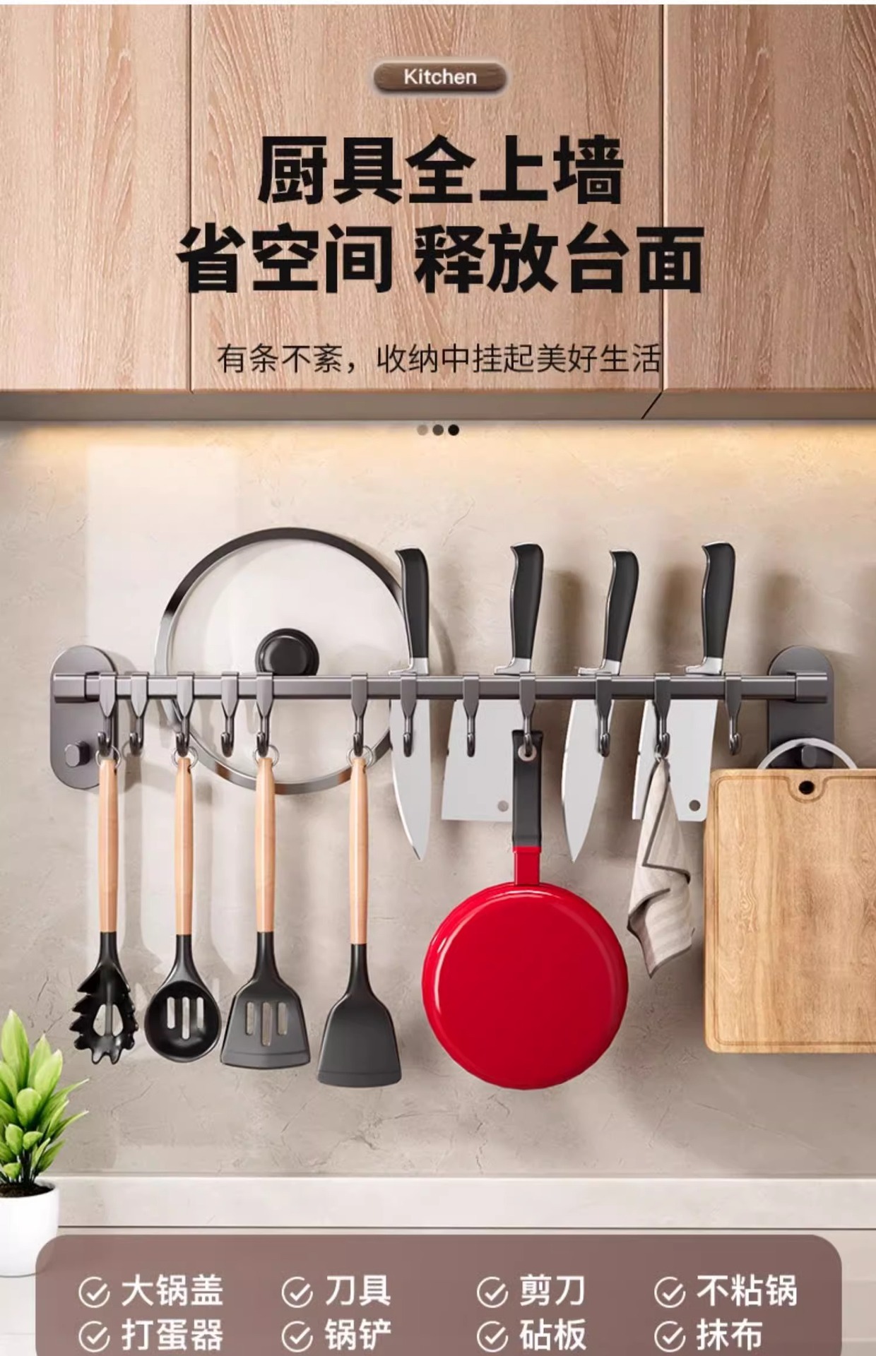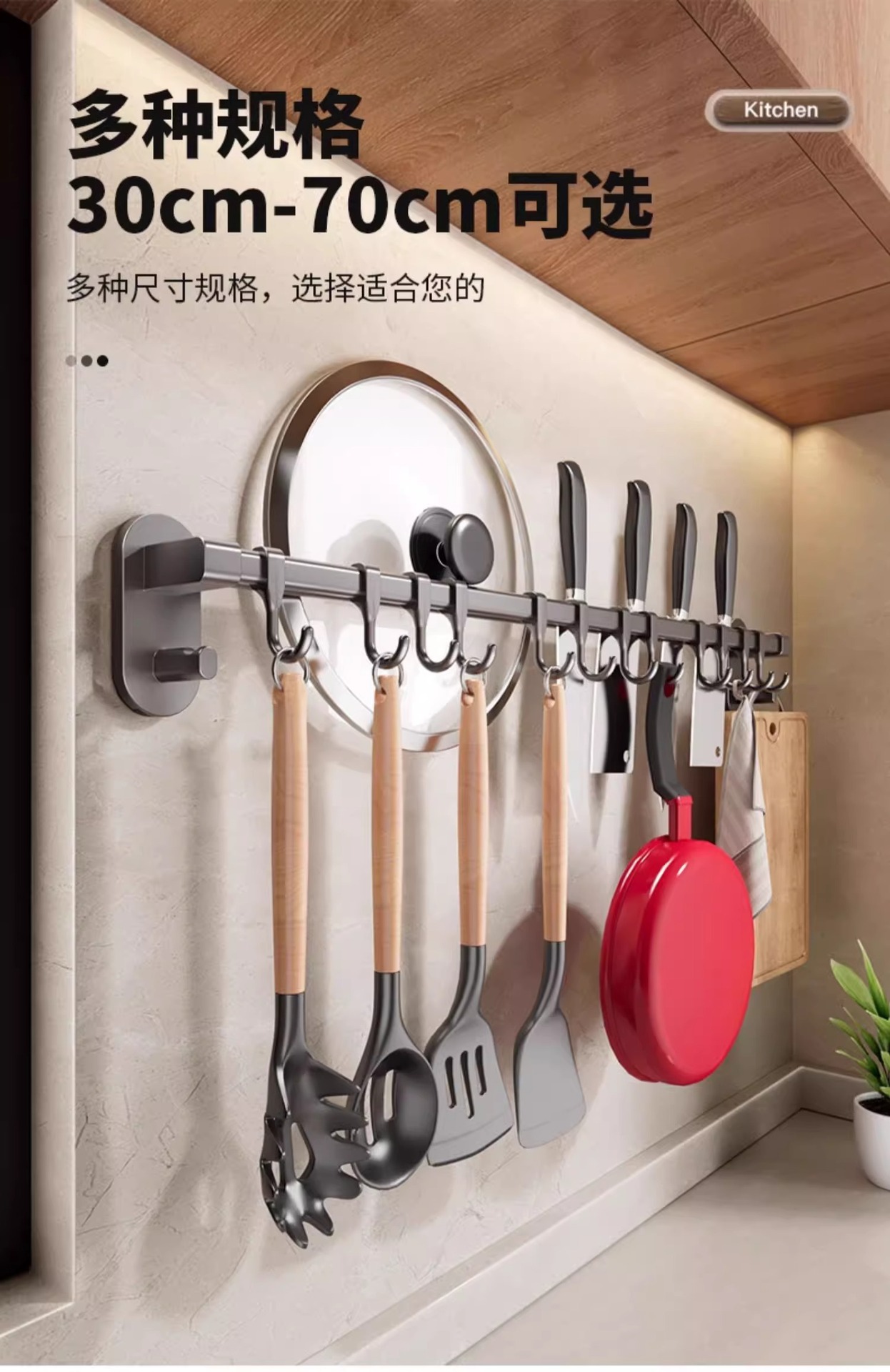 Gun gray kitchen hook rack punch free hanging rod wall mounted storage rack multi function pot shovel spoon storage rack