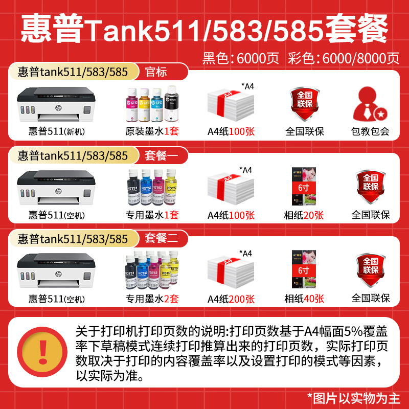 - Tank583 set 1 (1 set of special ink 100 copy paper 20 photographic paper)(3 years national guarantee)