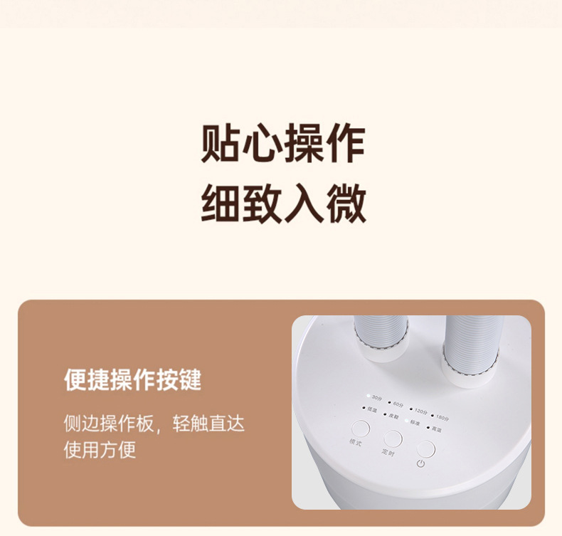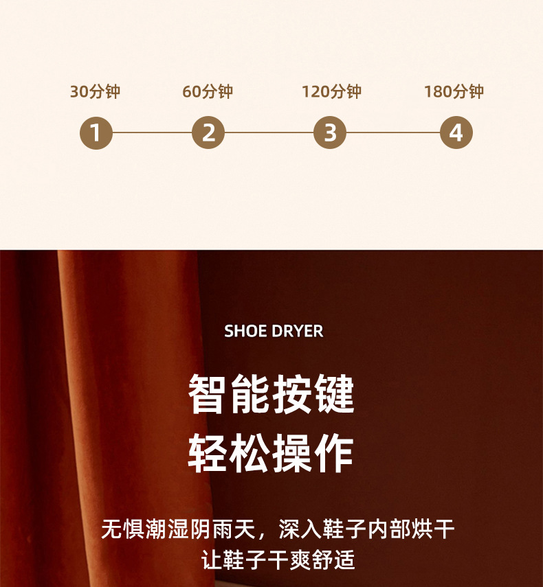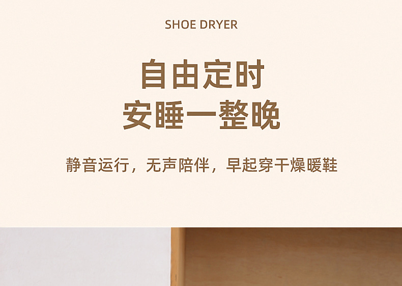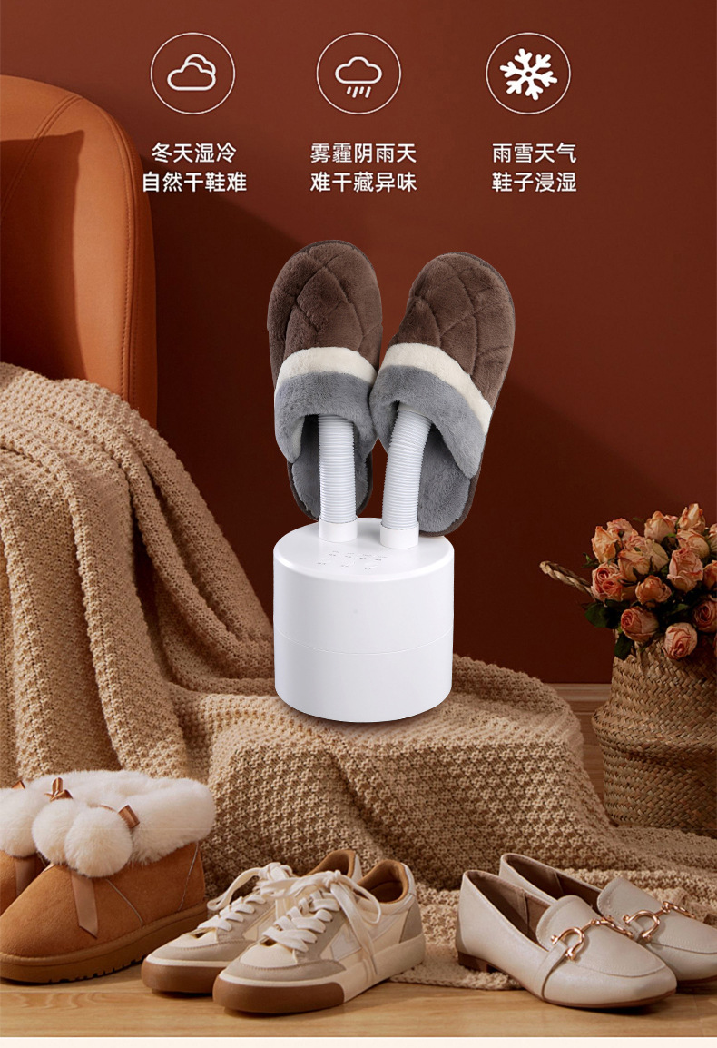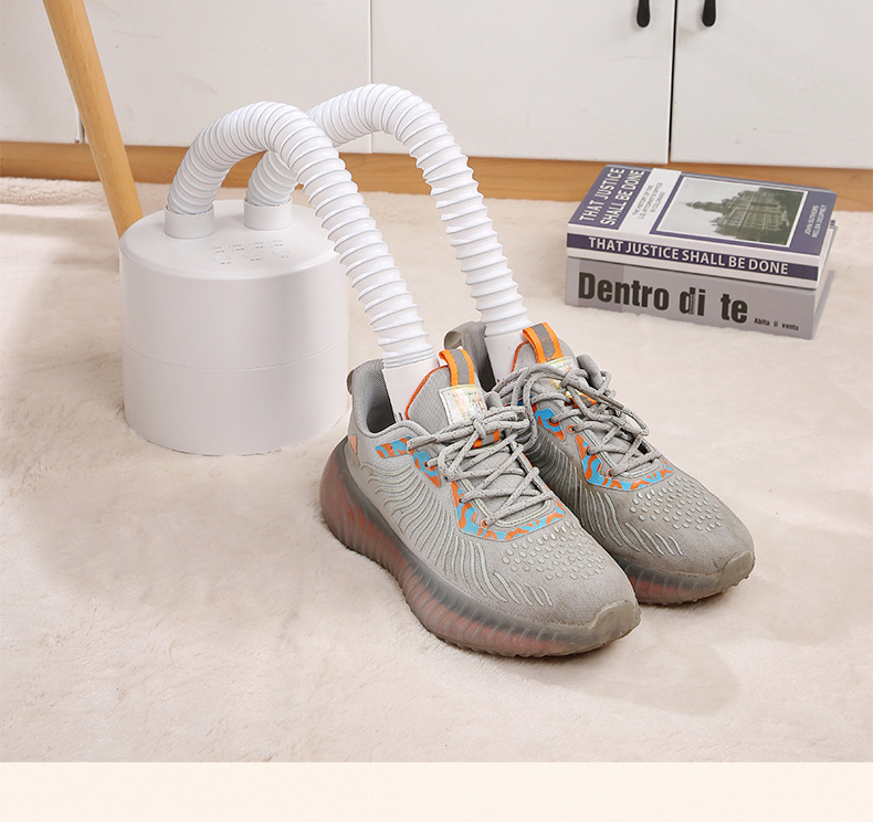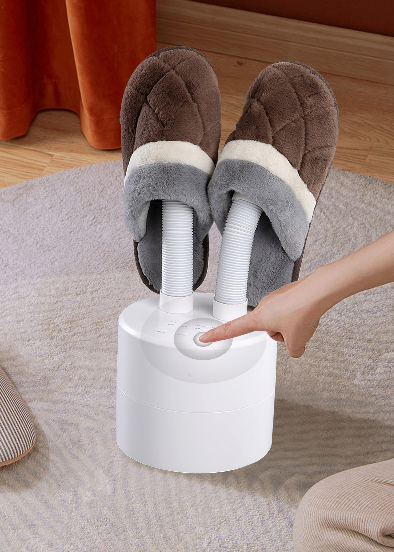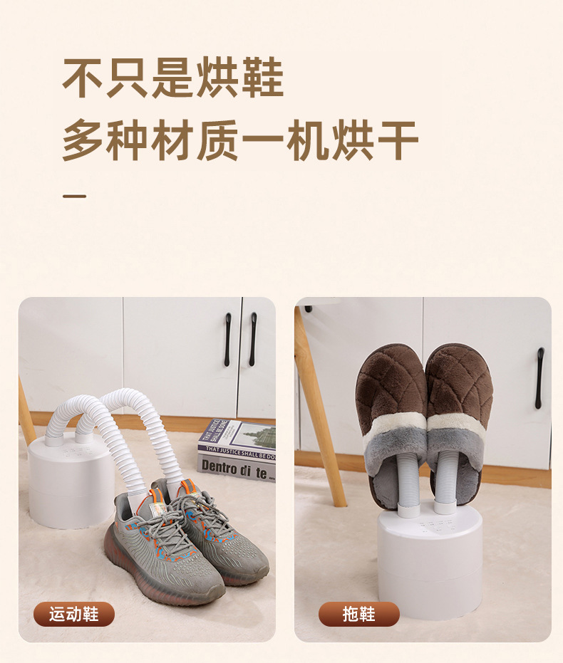 插上电源,当鞋子卡在风筒时,轻轻按下“开|关”键便自动进入20分钟烘干,假如要延长烘干时间按下“时间+”按一次加5分钟,依次类推,最高时间为99分钟。要减少时间按:时间-“,按一次减1分钟,依次类推。对鞋子进行消毒杀菌处理。20分钟后,自动停止工作。但室温在20度左右出风口温度大概在40度-50度左右,若中途要停止工作按下“开|关”键停止工作。打开臭氧开关,一次工作20分钟。如果再使用就再打开臭氧开关一次。
