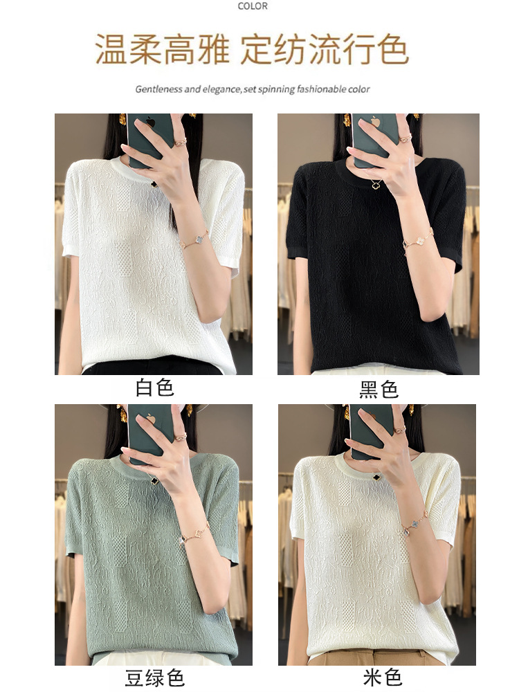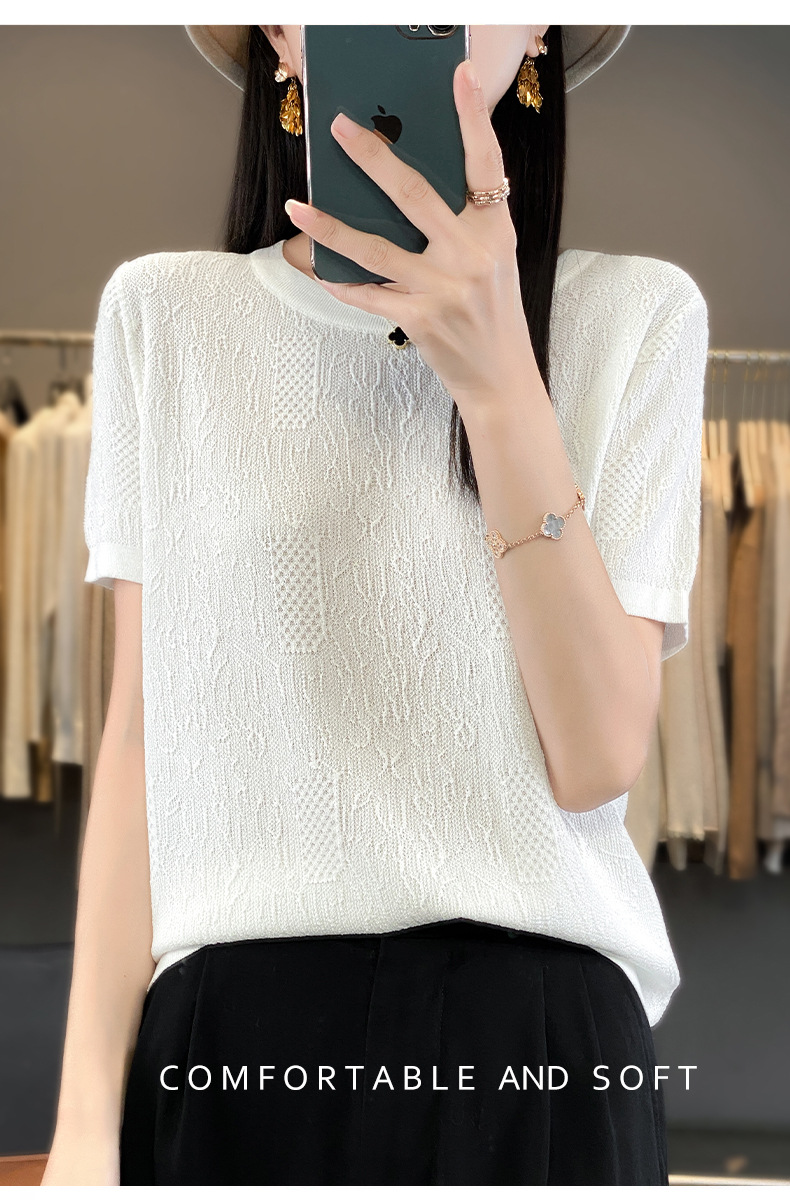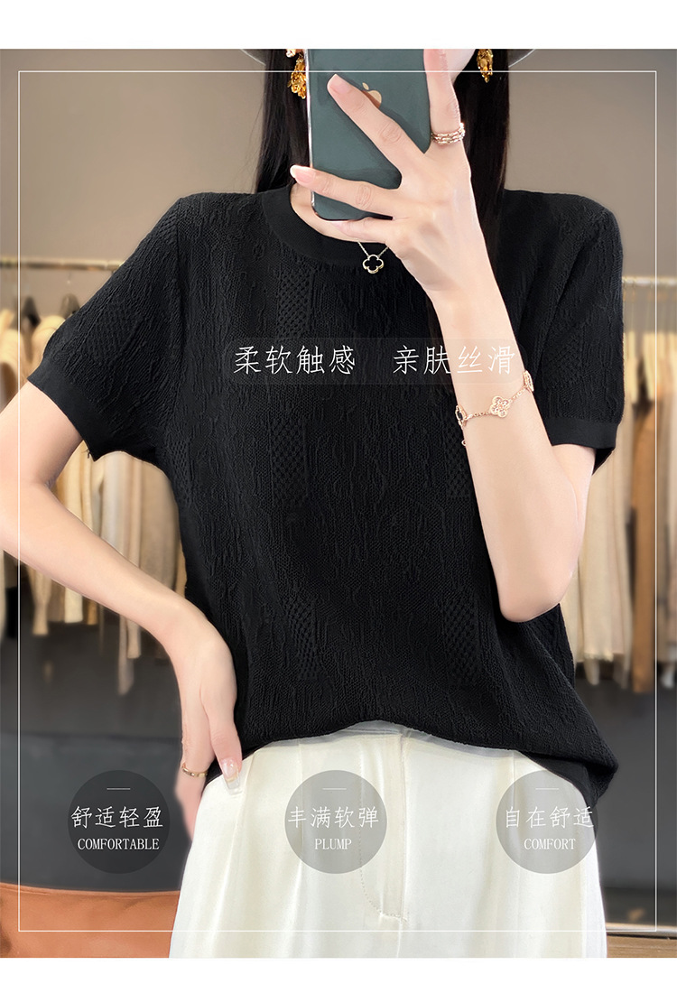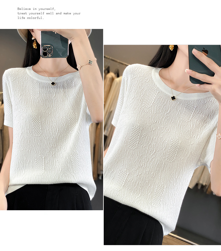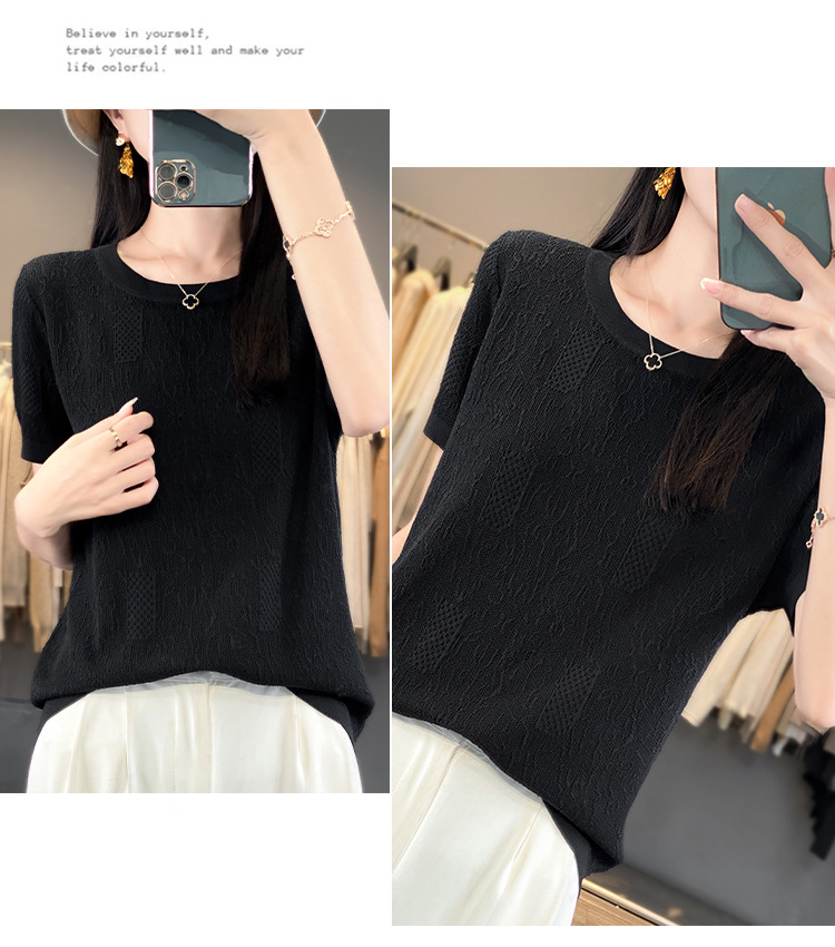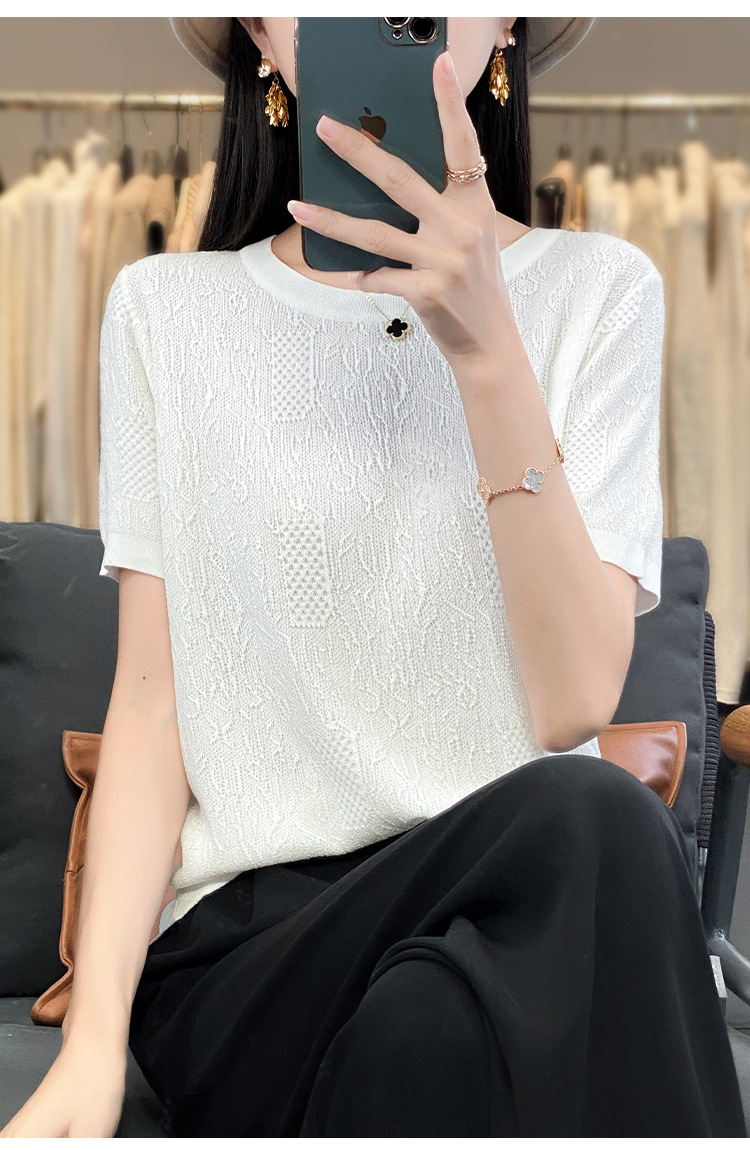 Ice Silk Short sleeved T shirt Women s 2024 Summer New Casual Hollow Short sleeved Round Neck Slimming Knitted Top Base Shirt