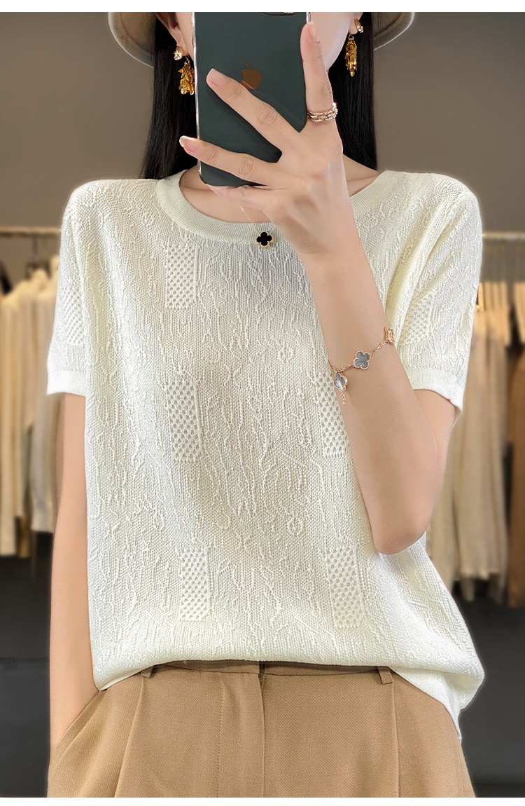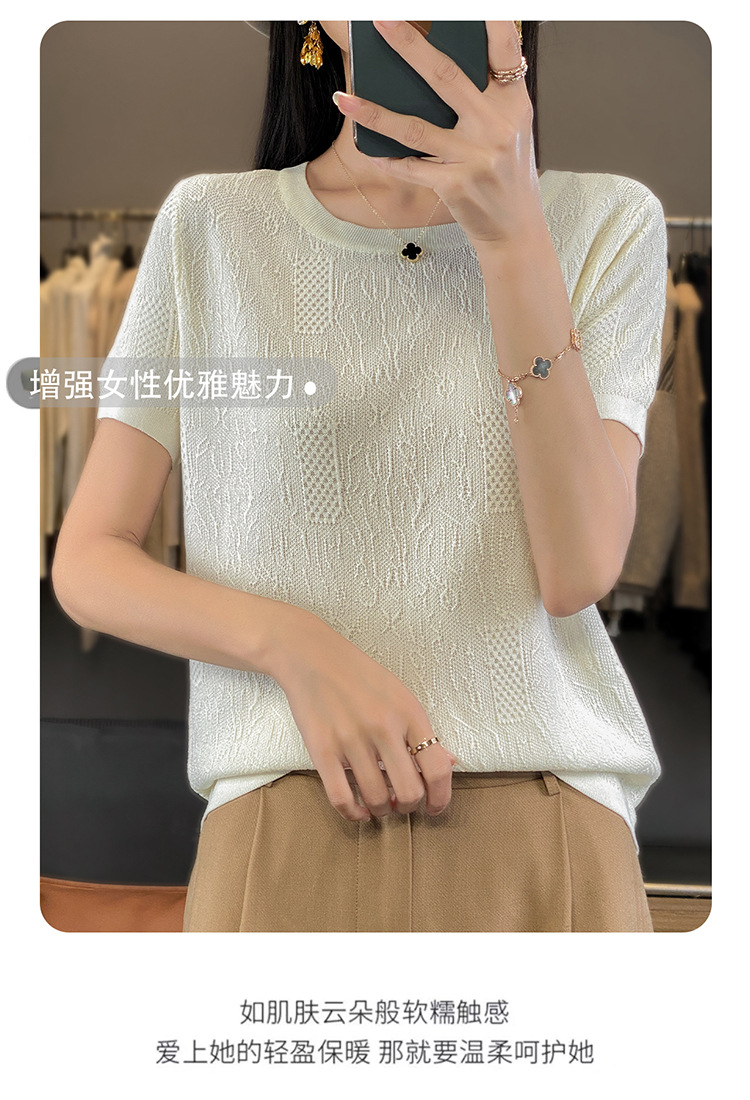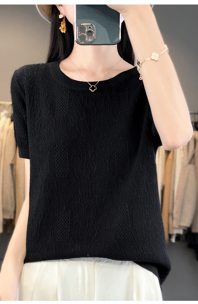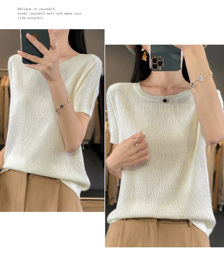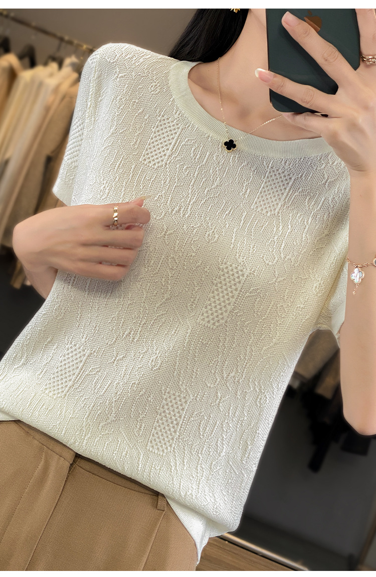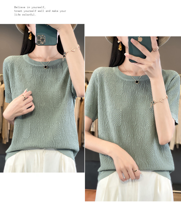 Ice Silk Short sleeved T shirt Women s 2024 Summer New Casual Hollow Short sleeved Round Neck Slimming Knitted Top Base Shirt