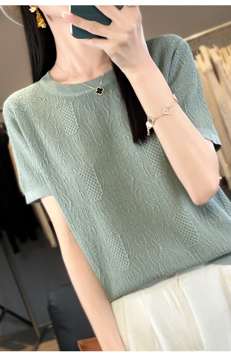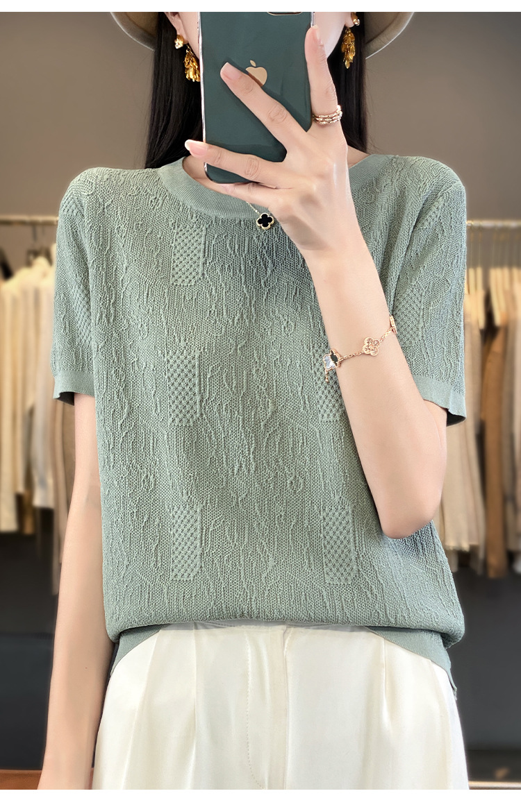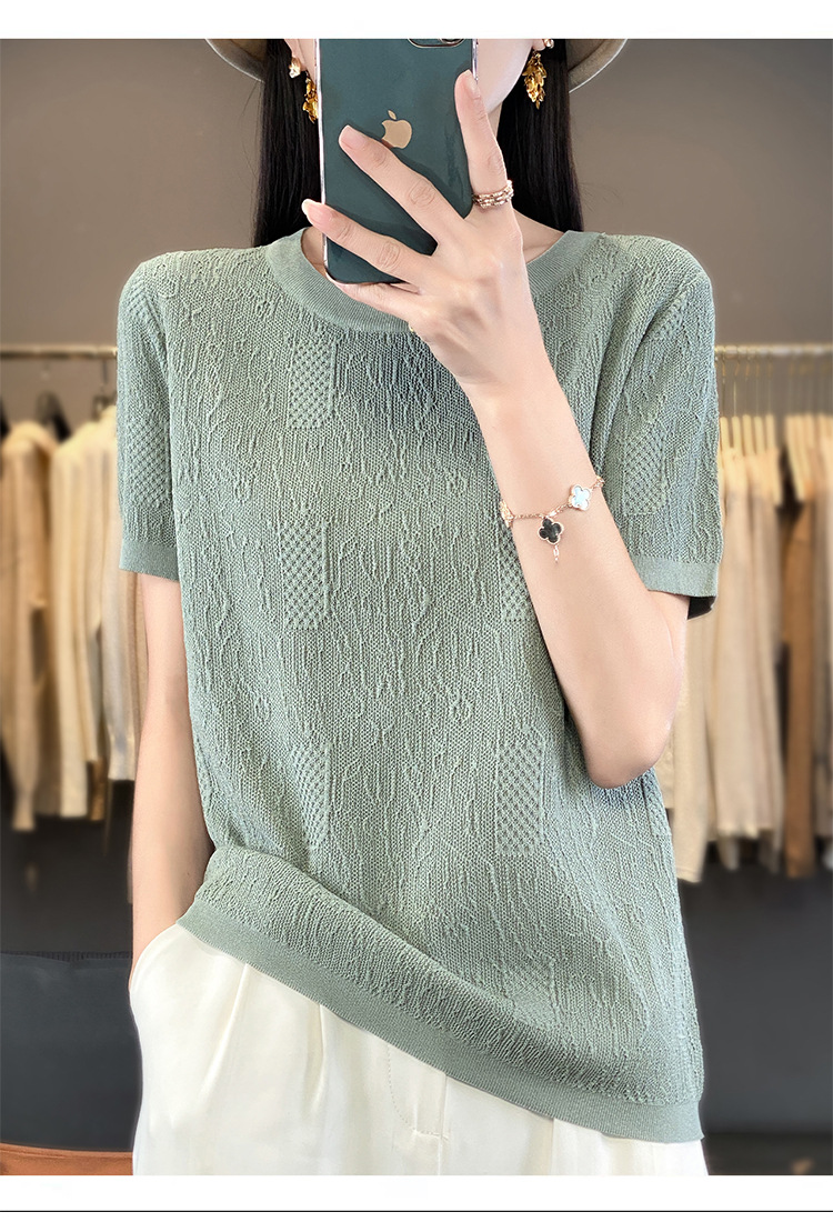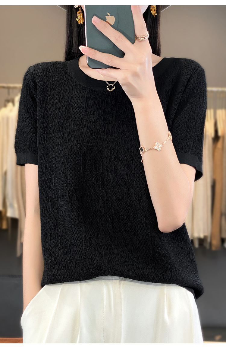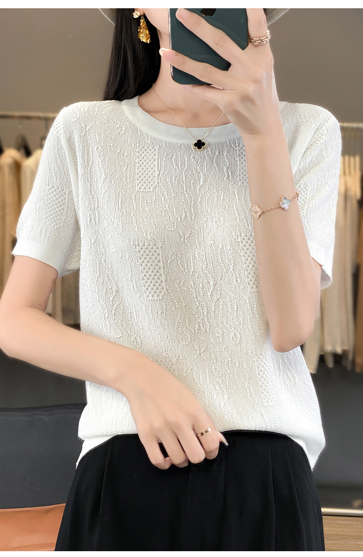 Ice Silk Short sleeved T shirt Women s 2024 Summer New Casual Hollow Short sleeved Round Neck Slimming Knitted Top Base Shirt