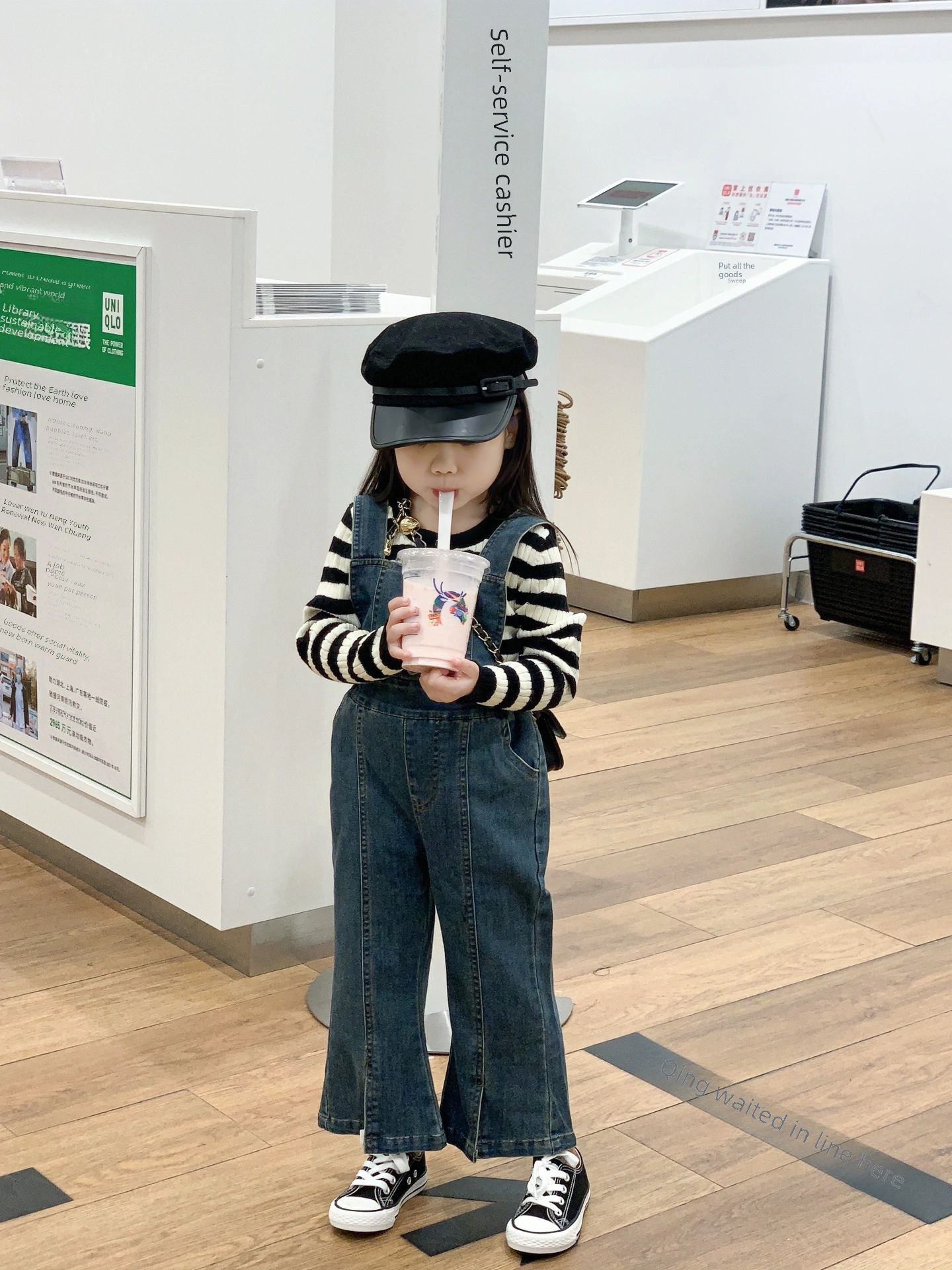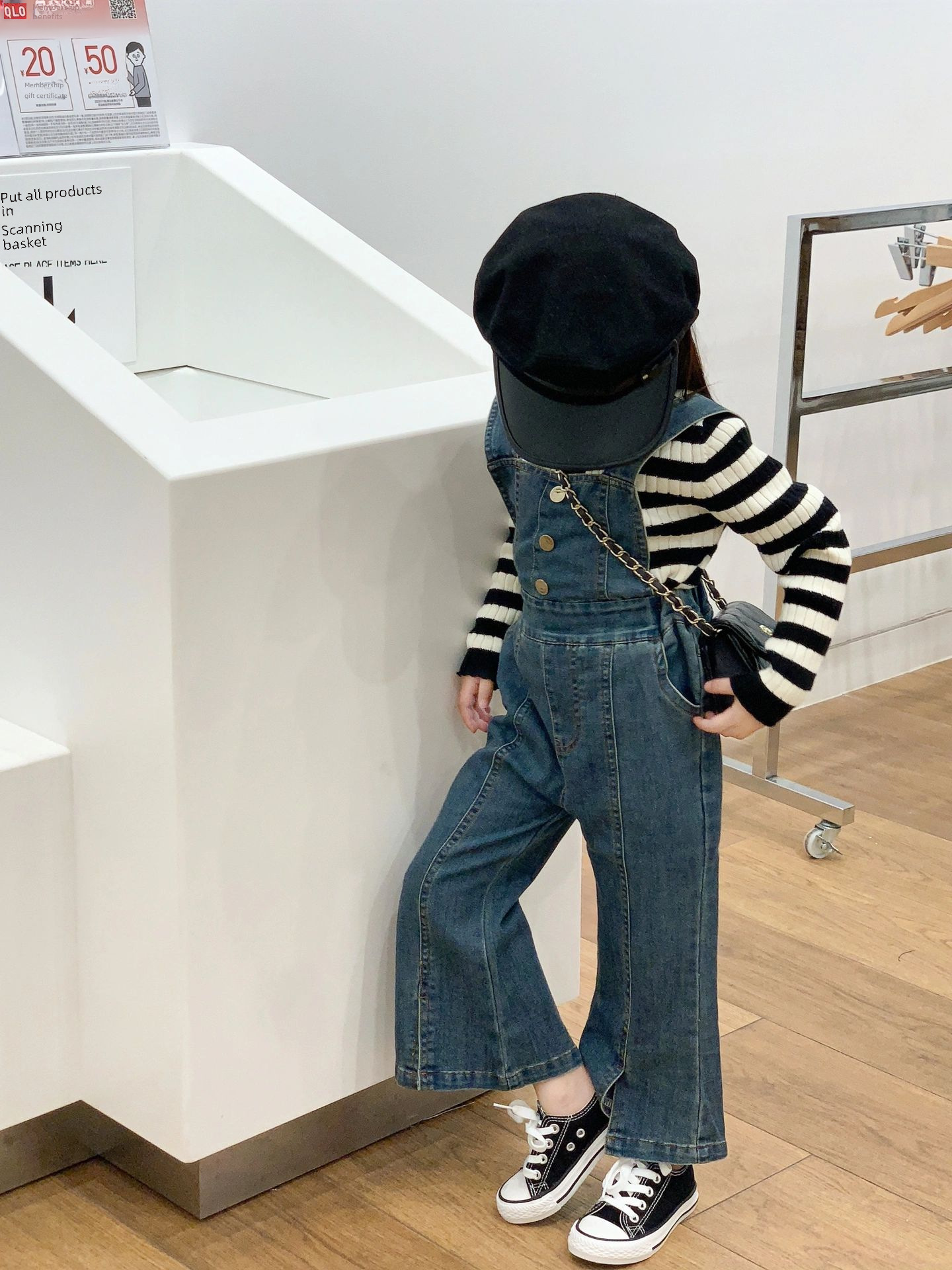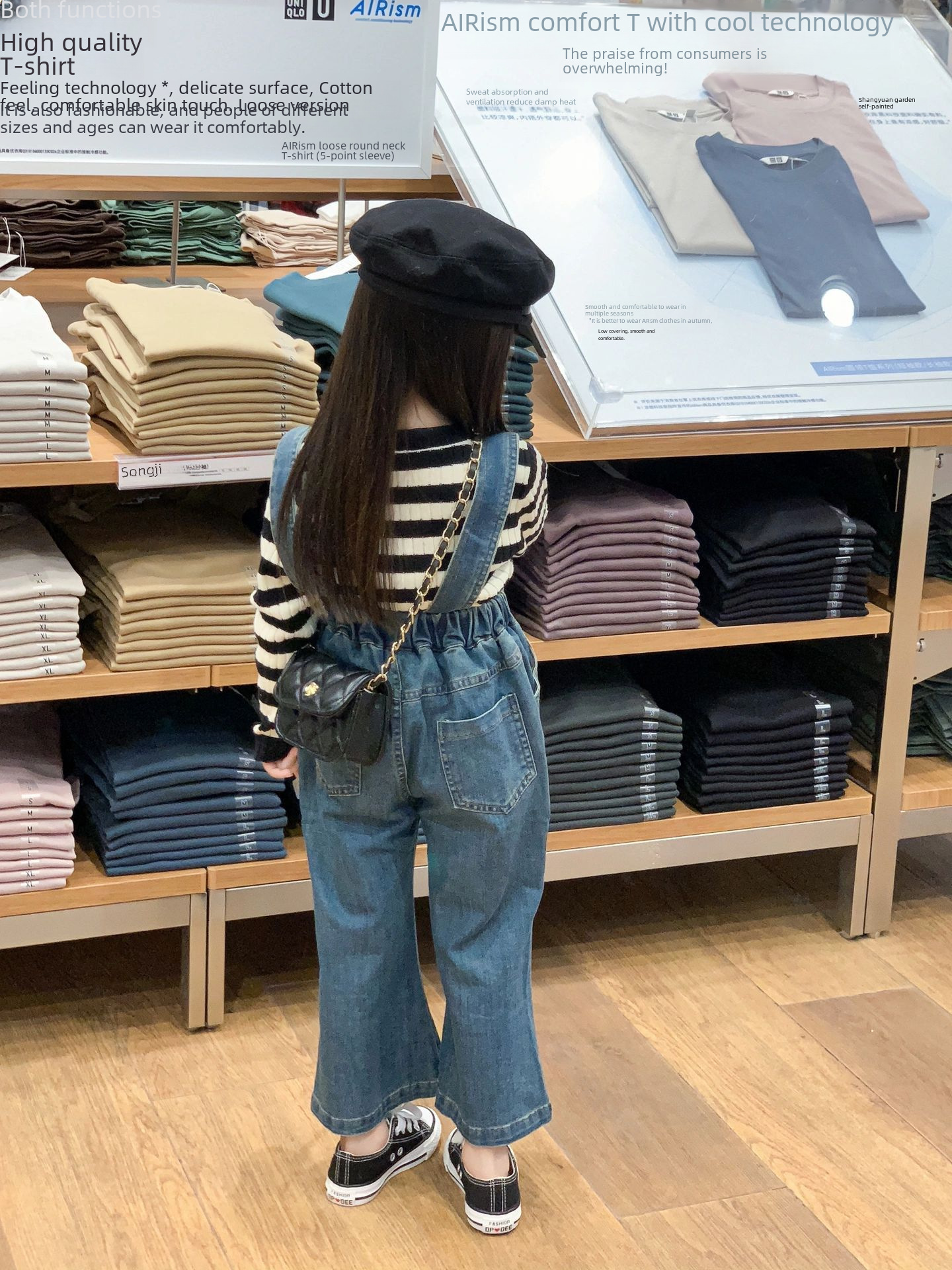 Korean style children s clothing 2023 Autumn New girls striped knitted cardigan fashionable retro Denim suspender pants suit