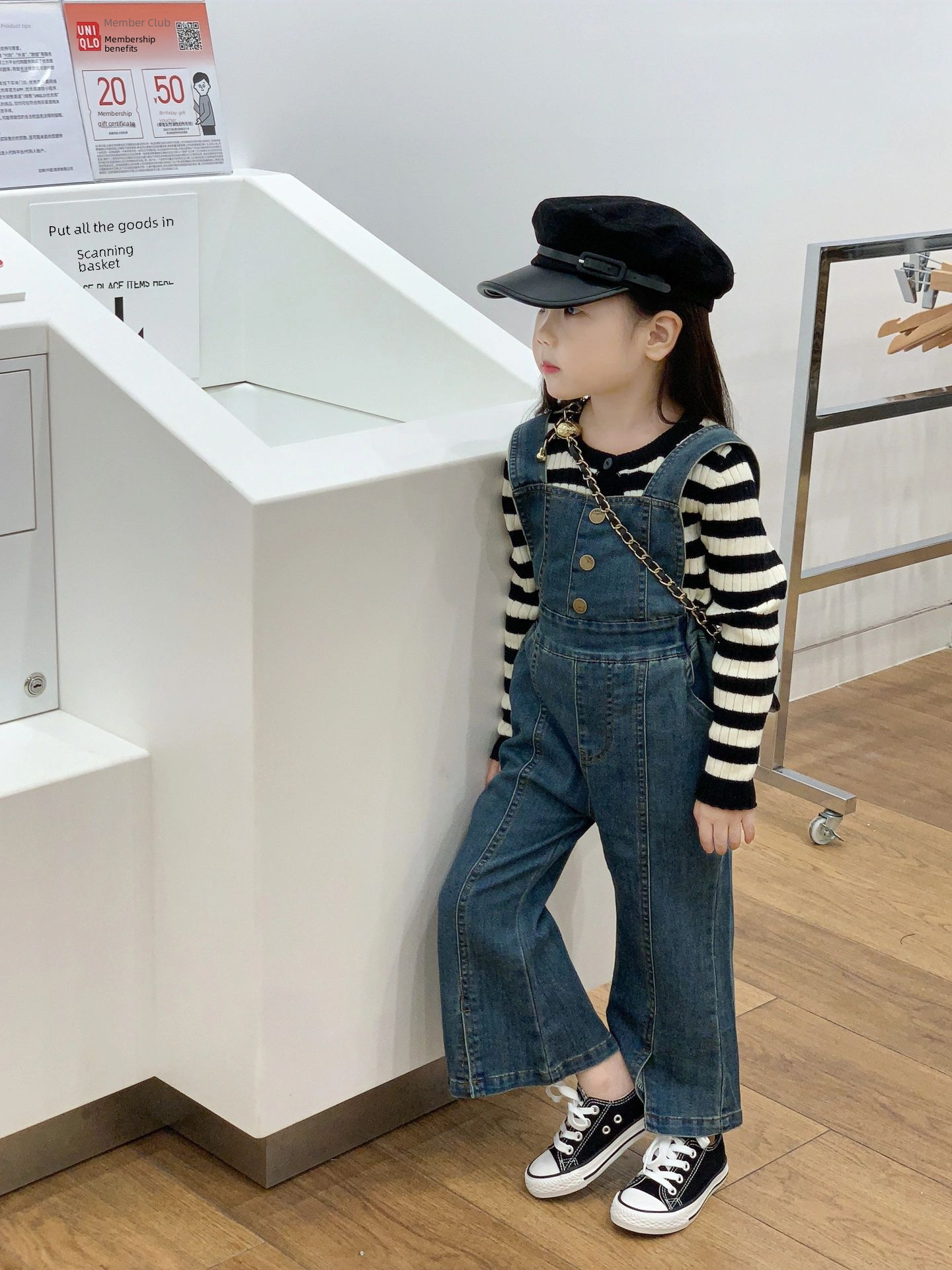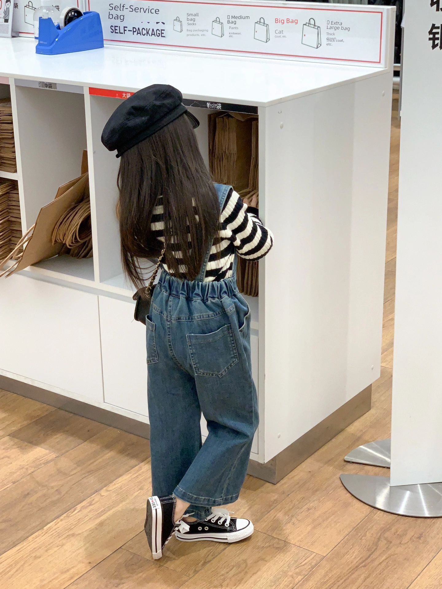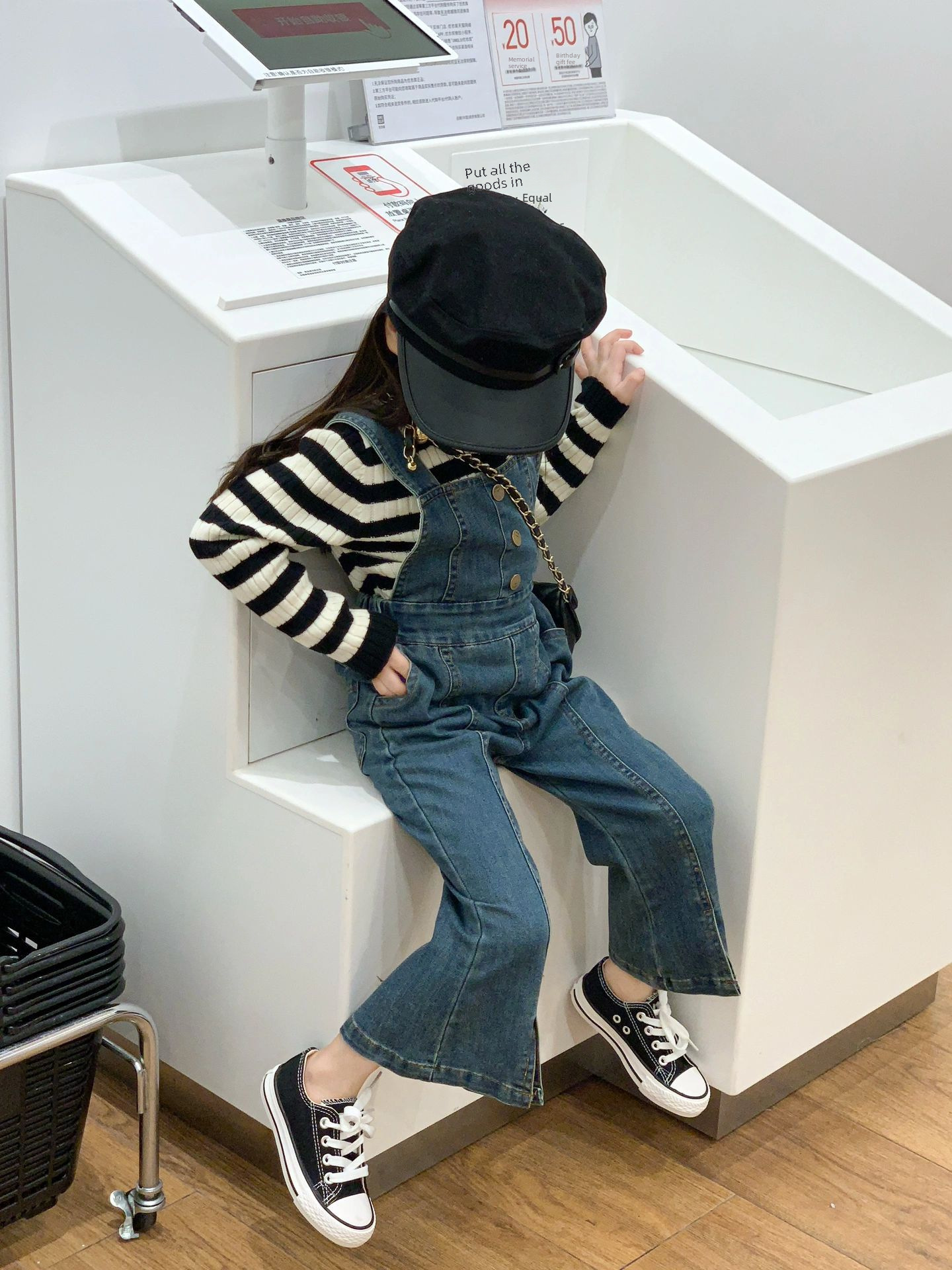 Korean style children s clothing 2023 Autumn New girls striped knitted cardigan fashionable retro Denim suspender pants suit