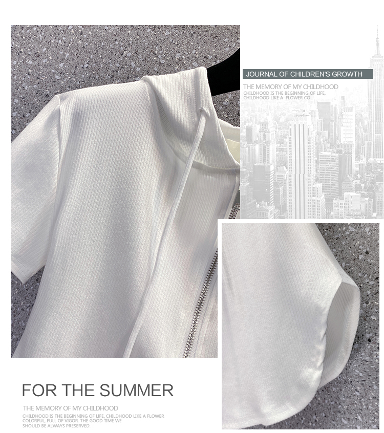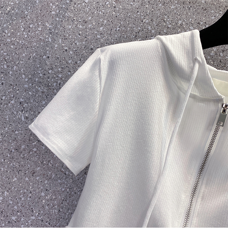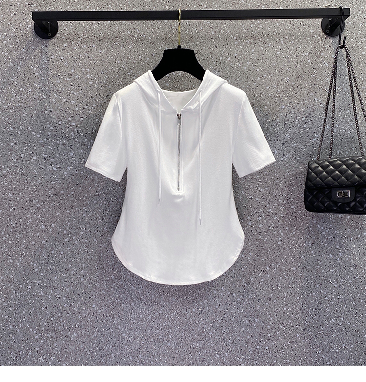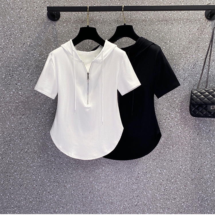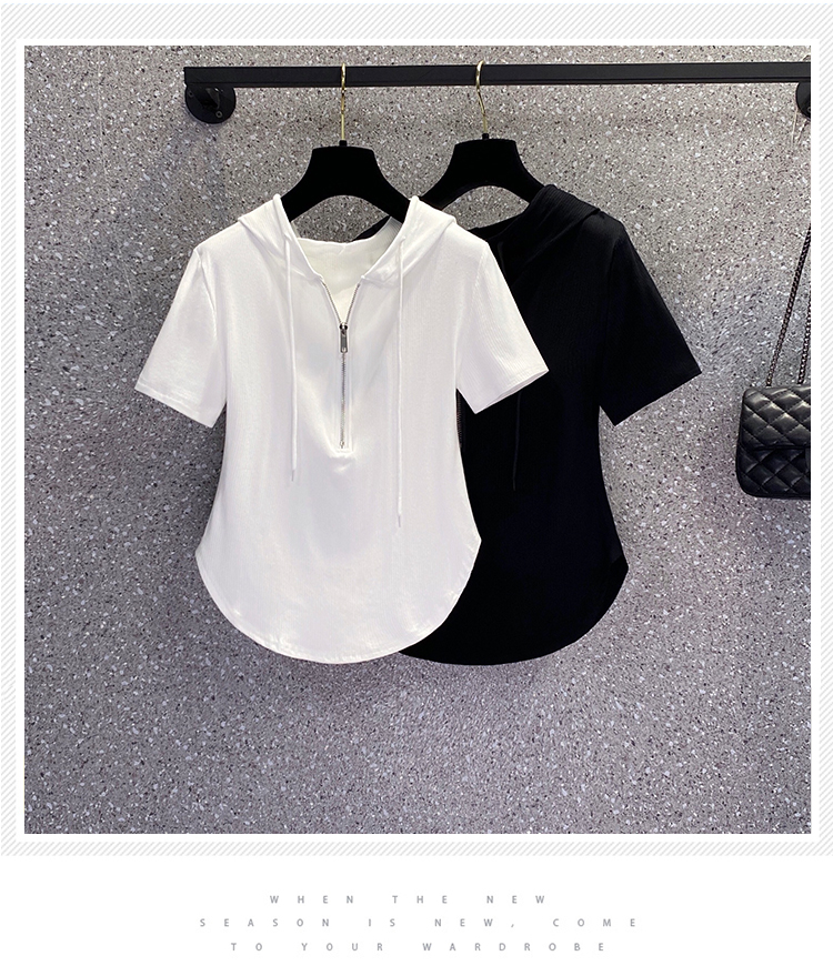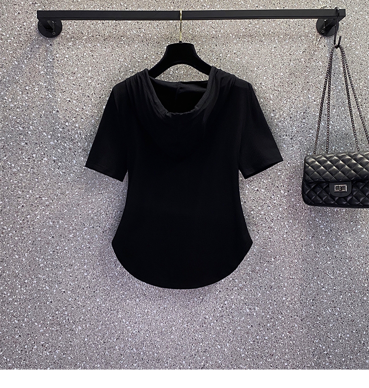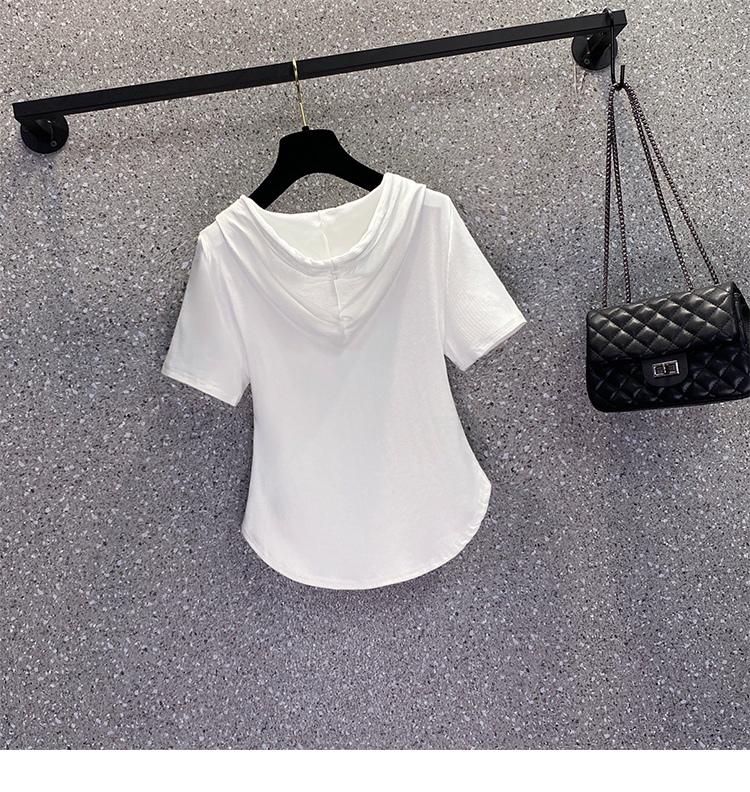 Large Size Women s 2024 Summer New Shoulder Hooded Short sleeved T shirt Slimming White Short Top for Chubby Girls
