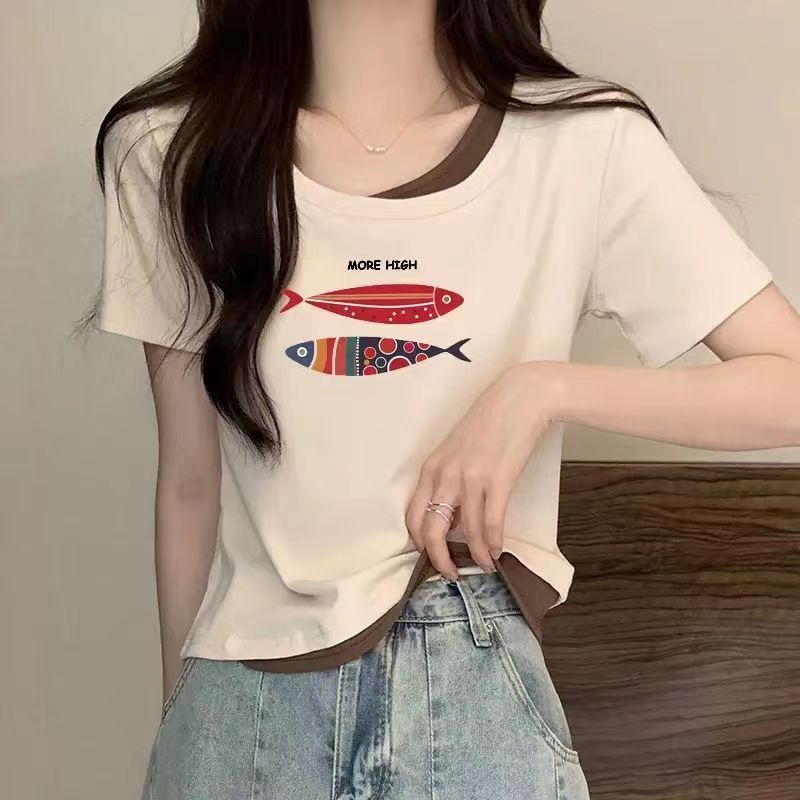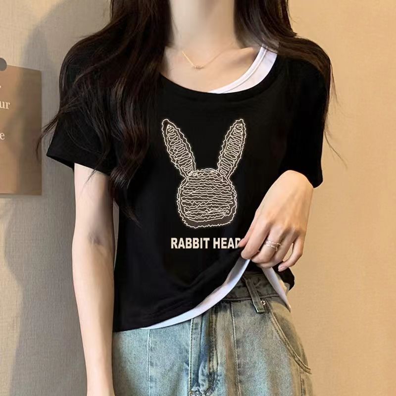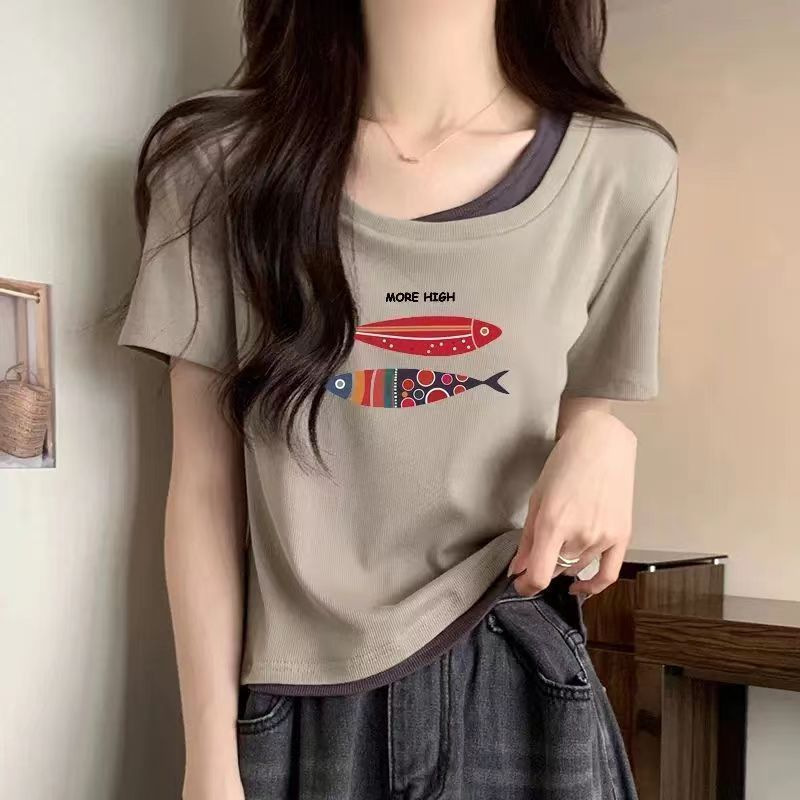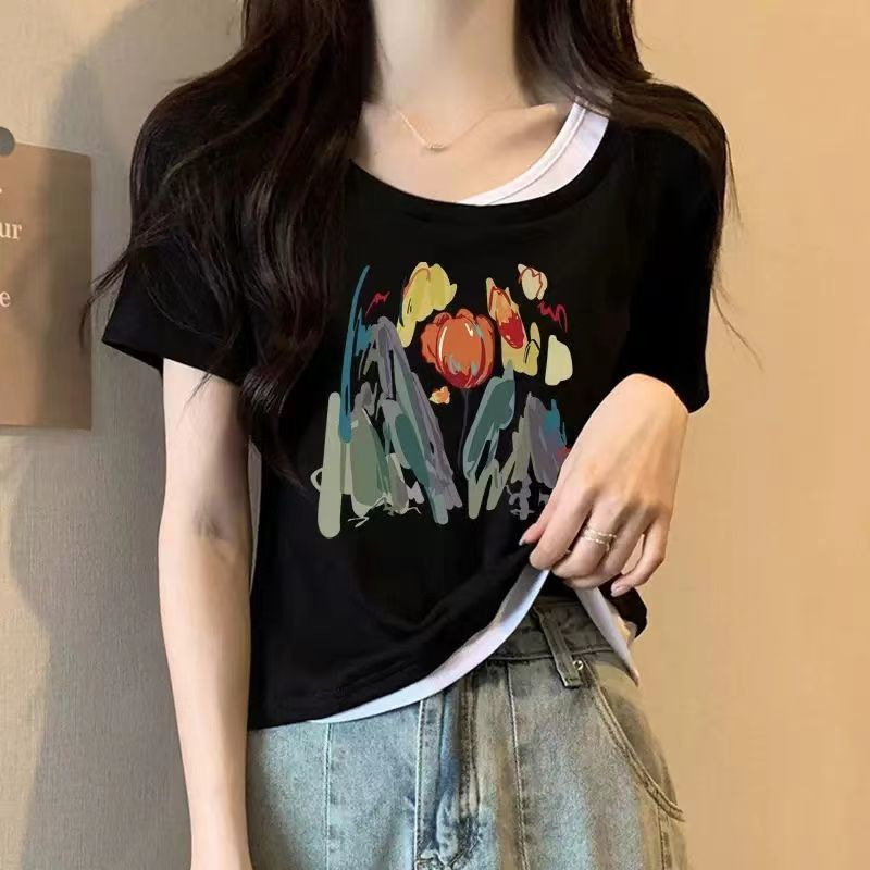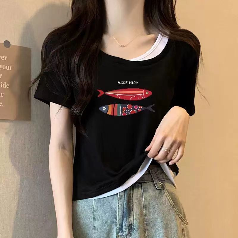 M5.18 1 Chubby Girls Summer Plus Size Pure Desire Design Sense Niche Thin Fake Two piece Women s T shirt Short sleeved Top