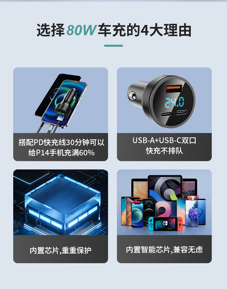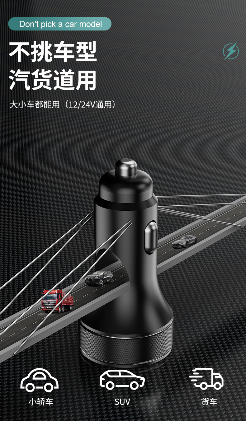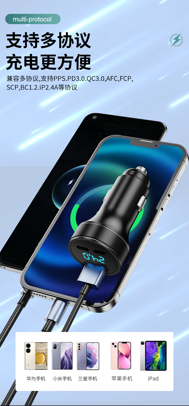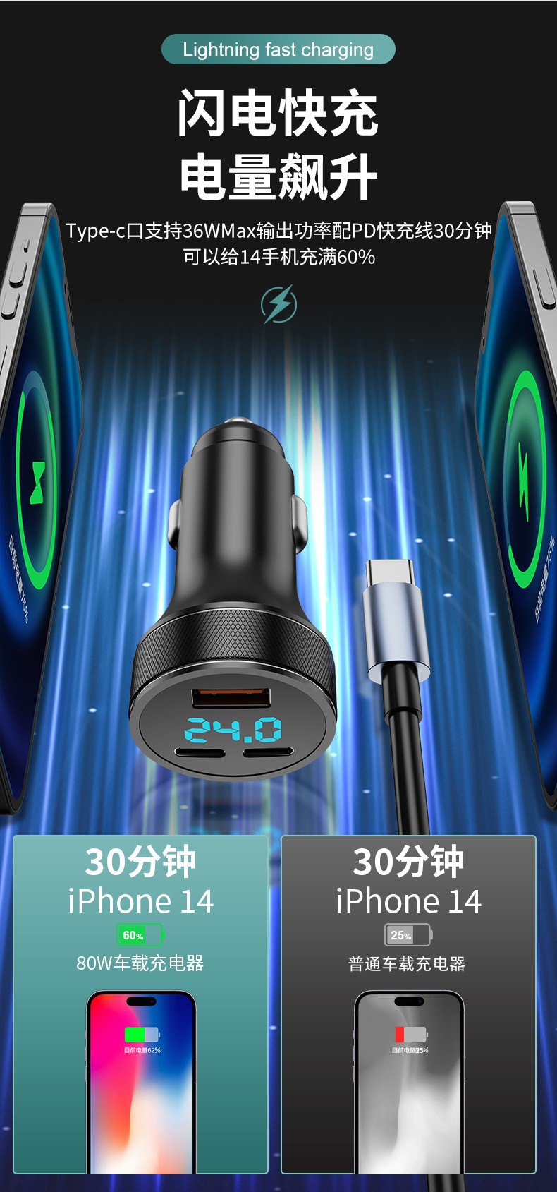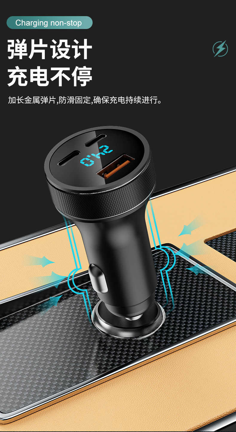 Metal digital display car charger 2C 1A is suitable for Huawei Apple flash charger super fast charger one to three car charger